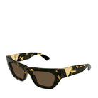Full acetate feminine cat-eye style characterized by sharp and bold volumes. New triangular dedicated hinge in metal. Bottega Veneta logo on the top of the hinge.