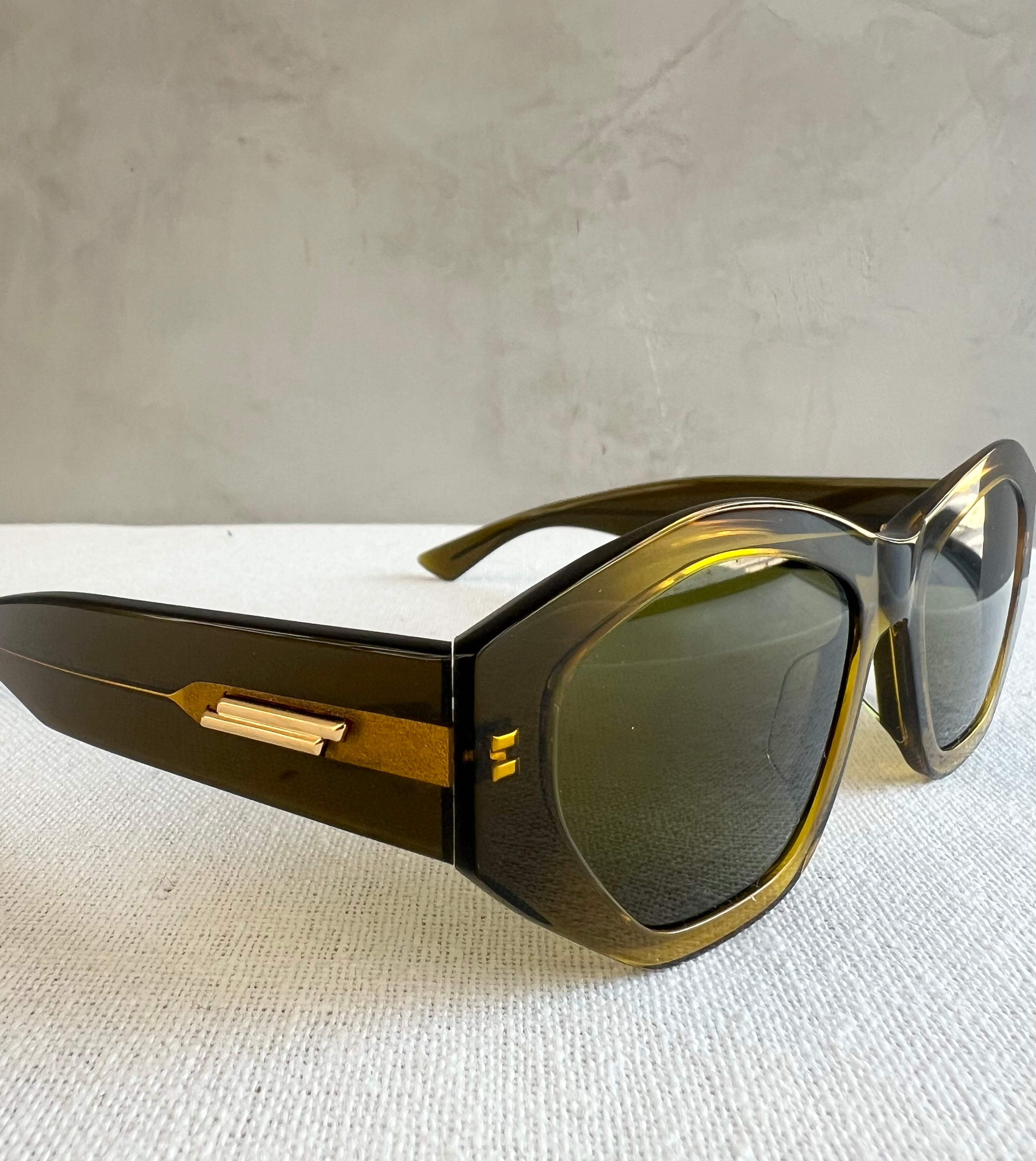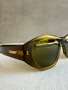 Bottega Veneta BV1408S 003 sunglasses for women, featuring shiny transparent bilayer green / yellow geometric recycled acetate frame and solid green bio nylon lenses.