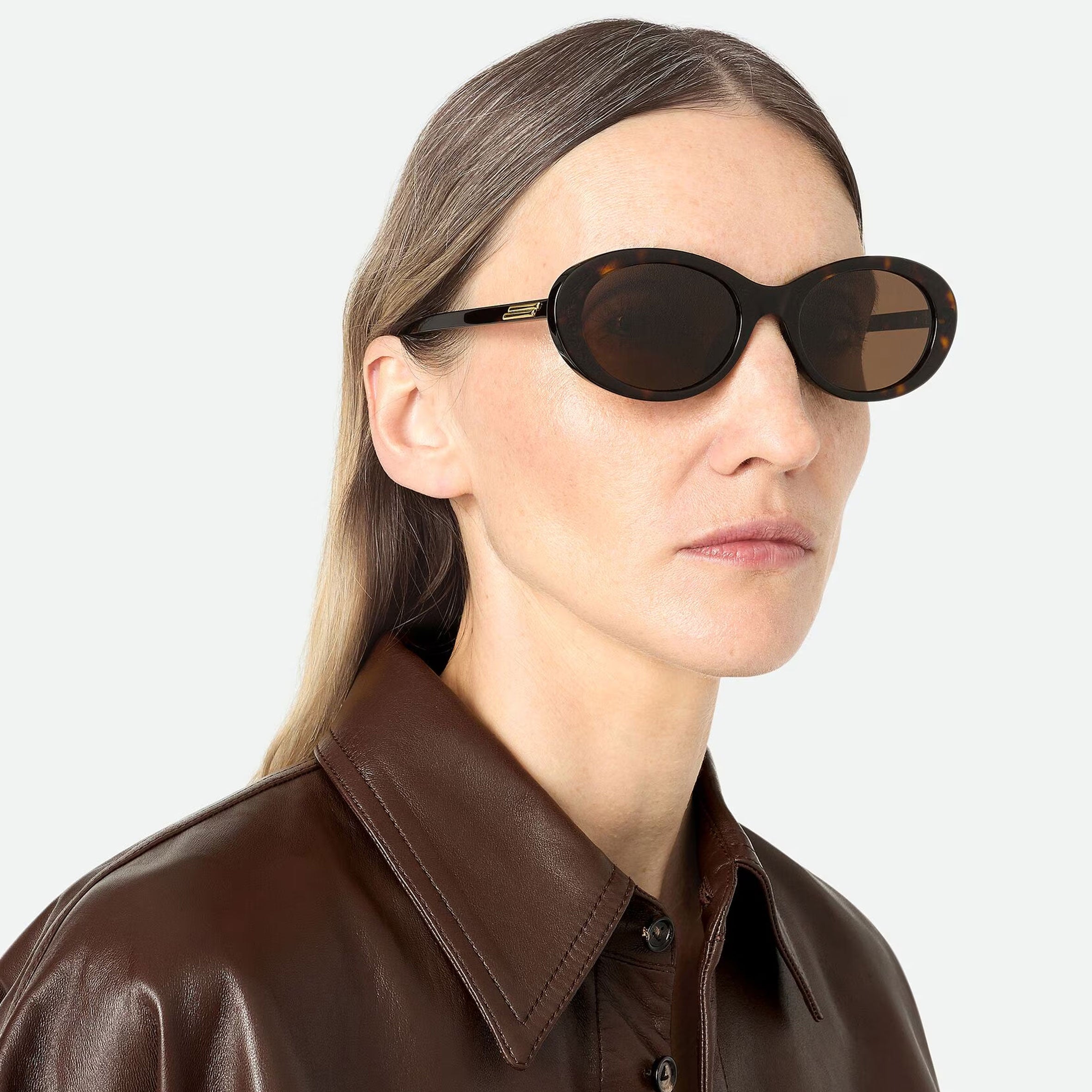 Oval sunglasses in recycled acetate with signature gold-finished ribbon detailing.