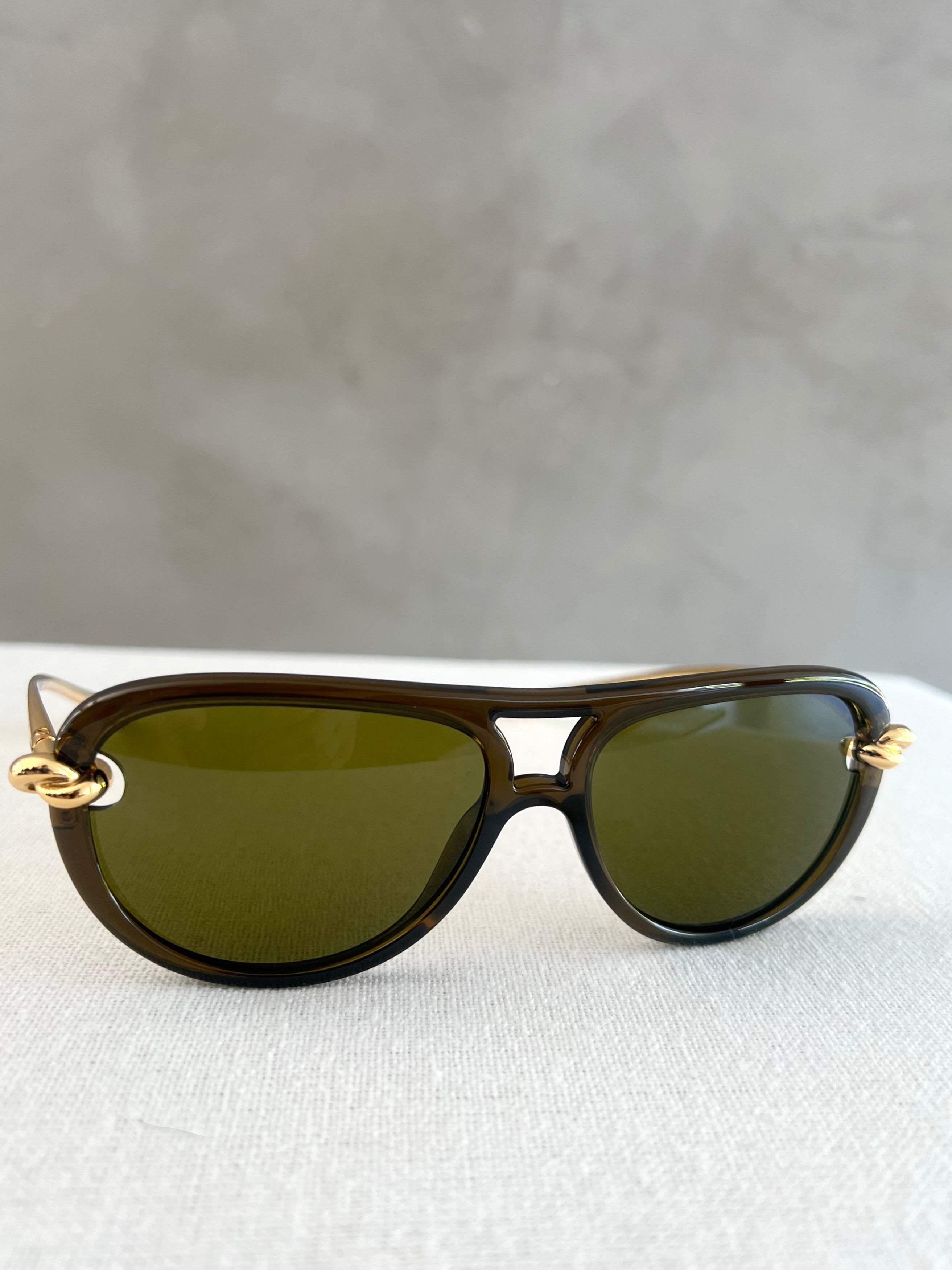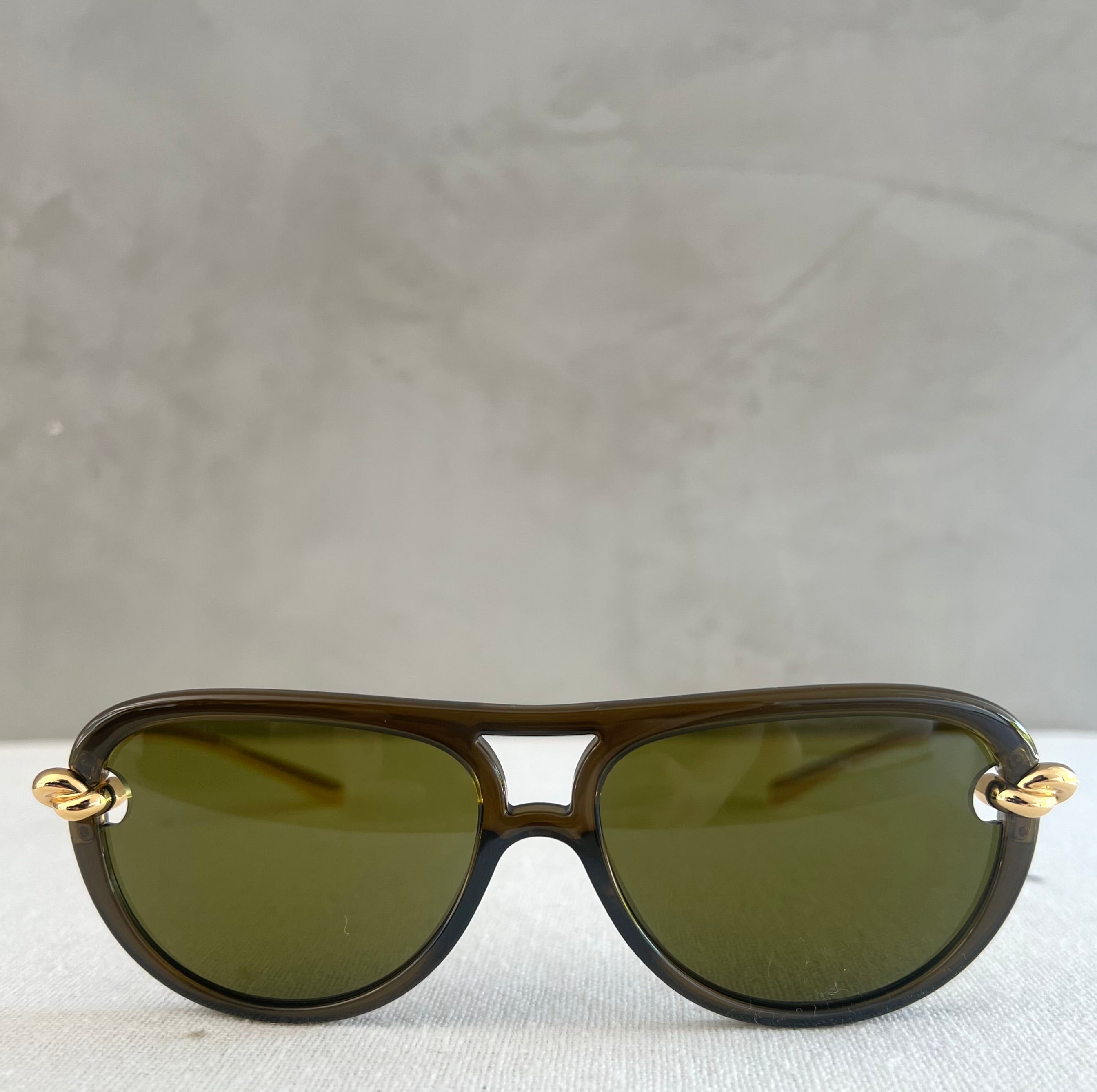 Bottega Veneta BV1418S 003 sunglasses for women, featuring shiny transparent green pilot injection frame and solid green bio nylon lenses. Finished with metallic knot details.