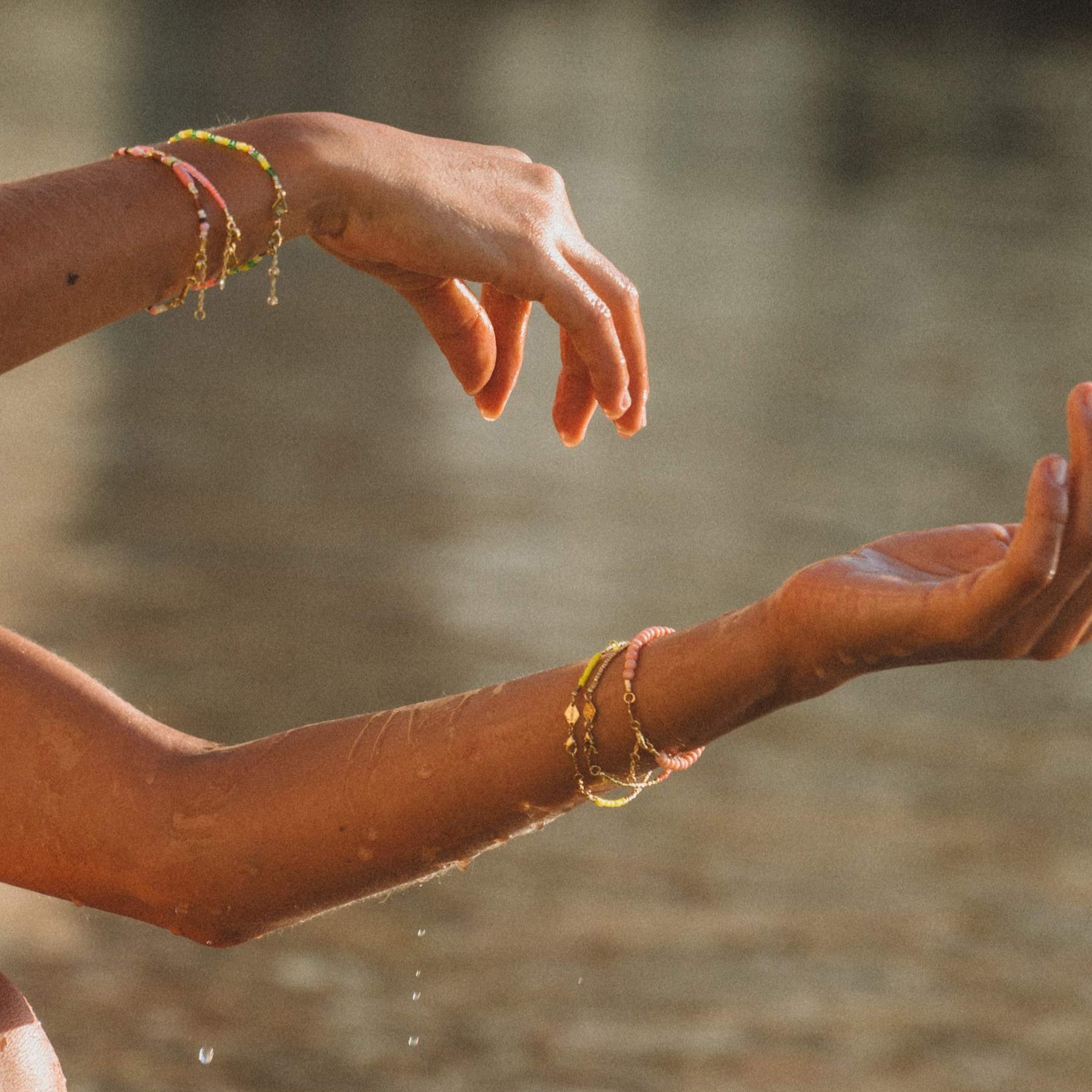 Playful and sweet, this bracelet in candyfloss pink tones brings back carefree childhood memories and sunny beach days, featuring beautiful details, precious stones, and freshwater pearls.