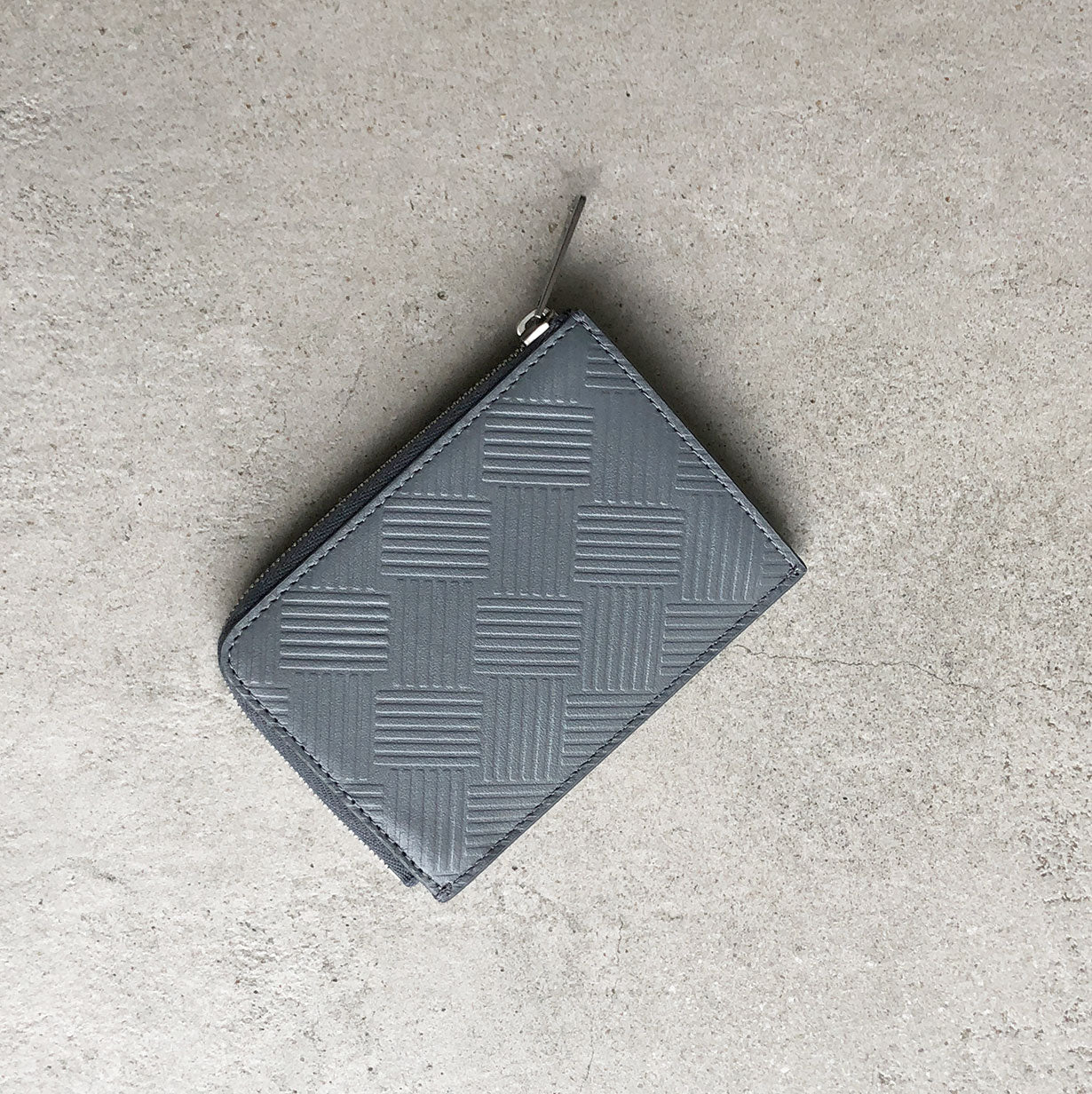 Grained calfskin card holder in black featuring embossed graphic pattern. Three card slots at back face. Zip closure. Expansion panels and logo embossed at interior. Tonal grained calfskin lining. Silver-tone hardware.