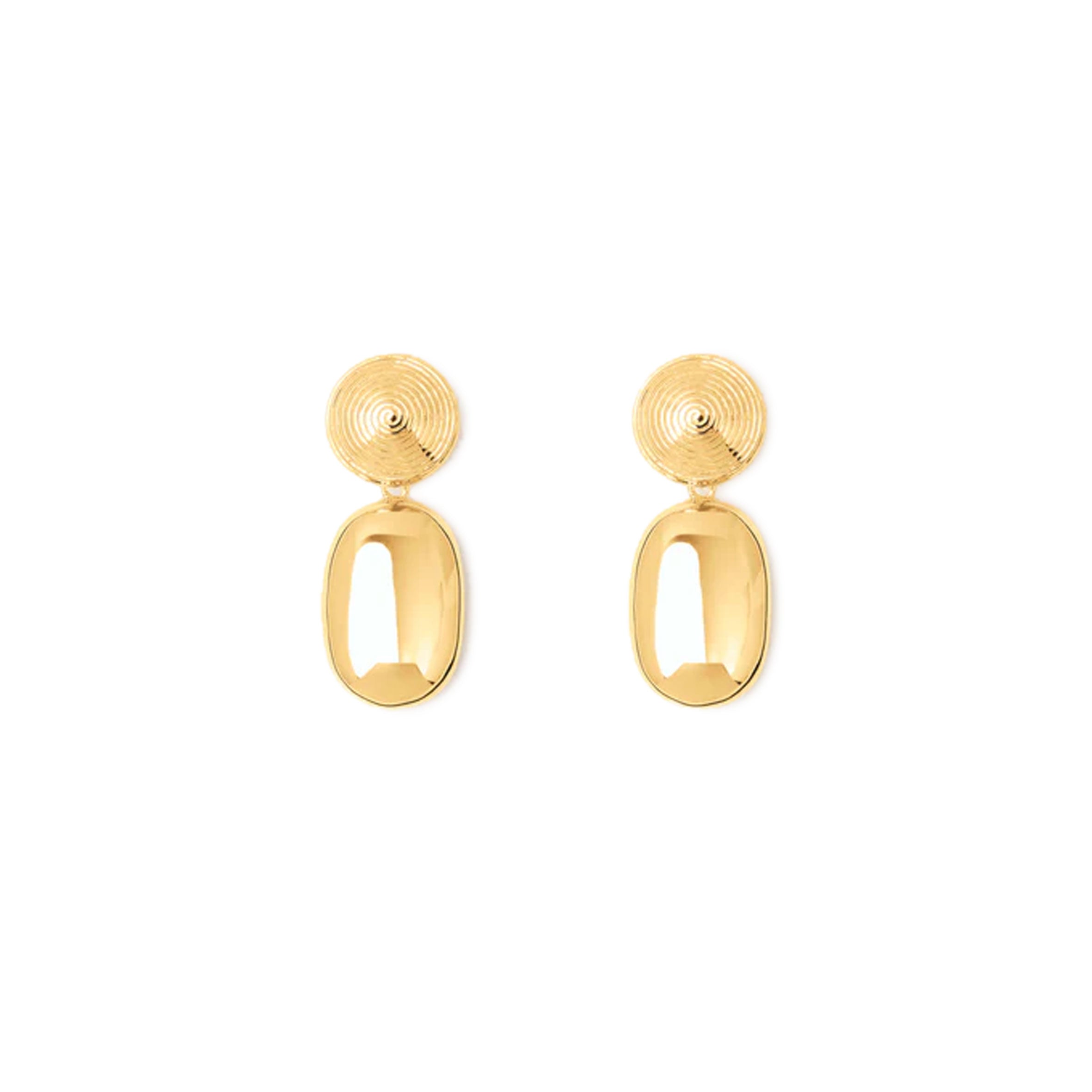 The Carla Earrings combine two contrasting elements – a delicate spiral stud and a bold oval drop – for a playful yet polished finish. Lightweight and crafted from 18 carat gold-plated silver with a strong silhouette, they transition seamlessly from day to night.