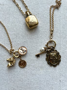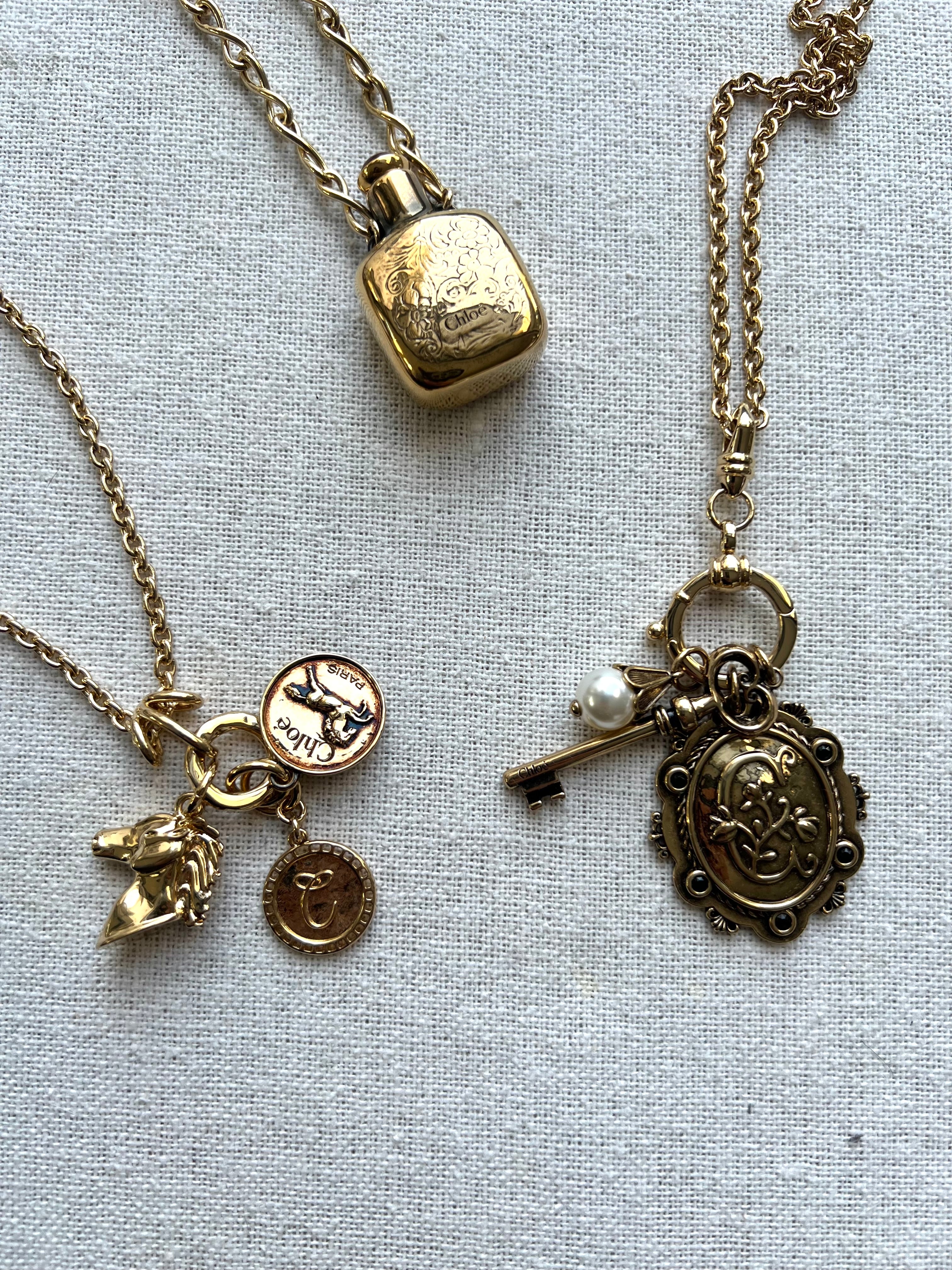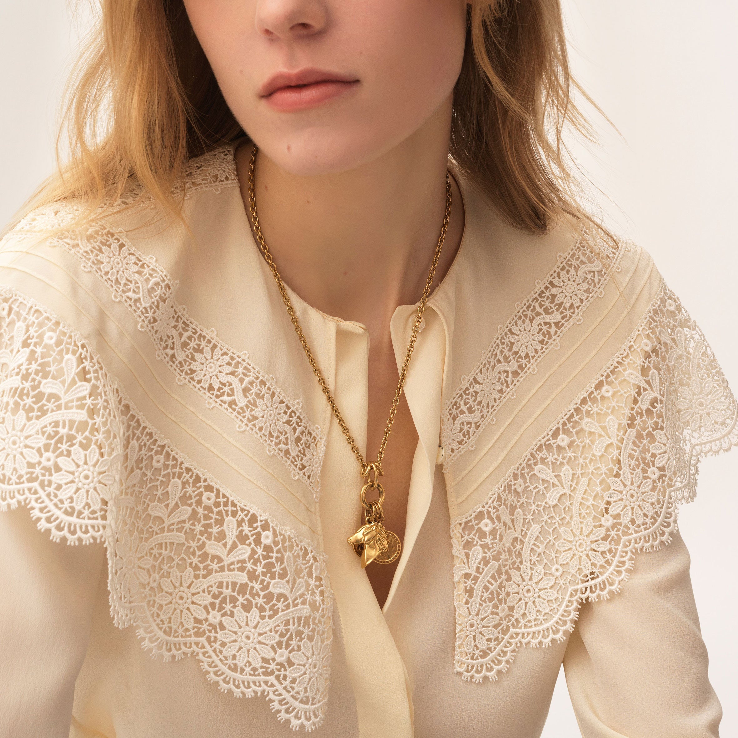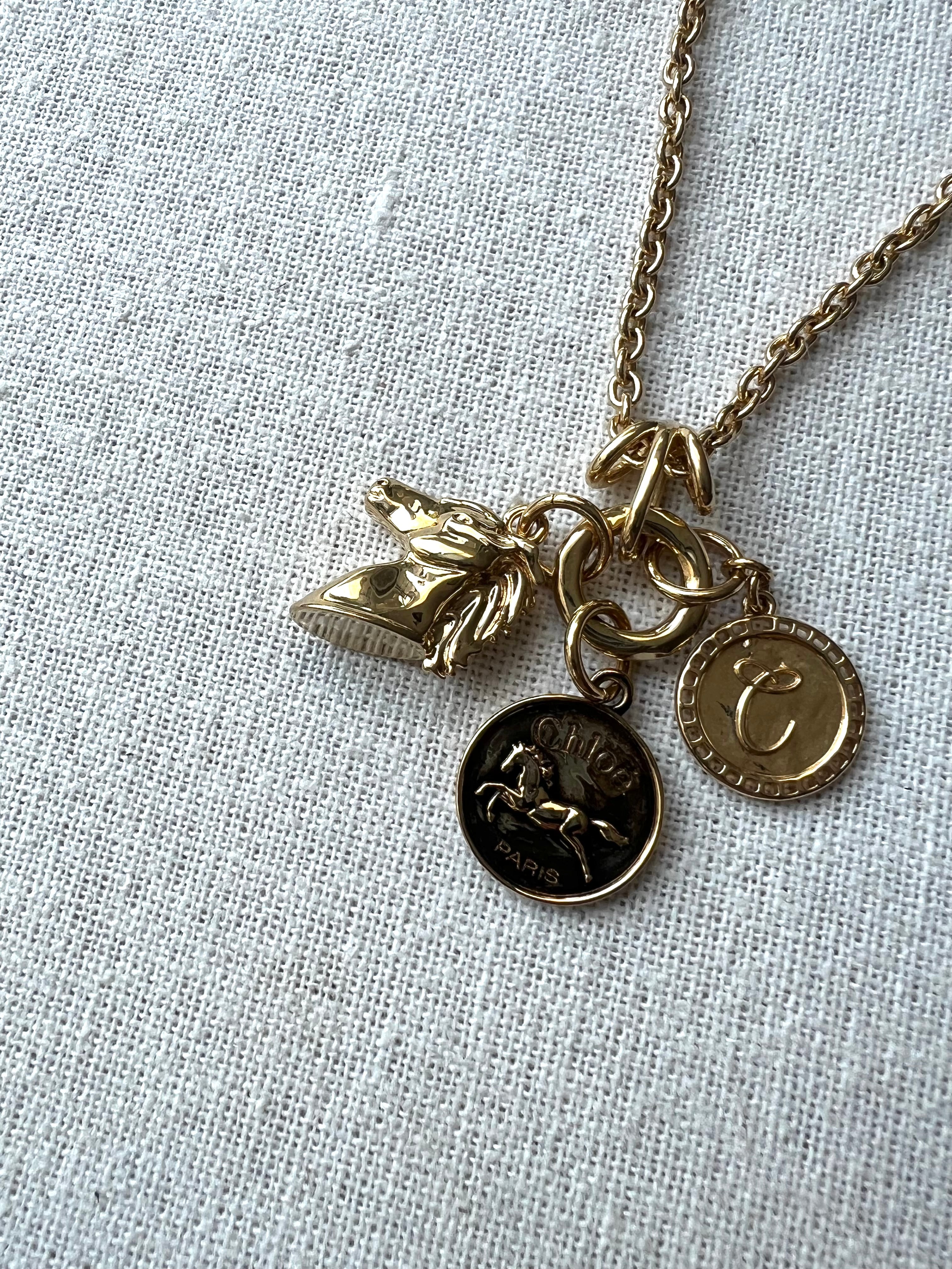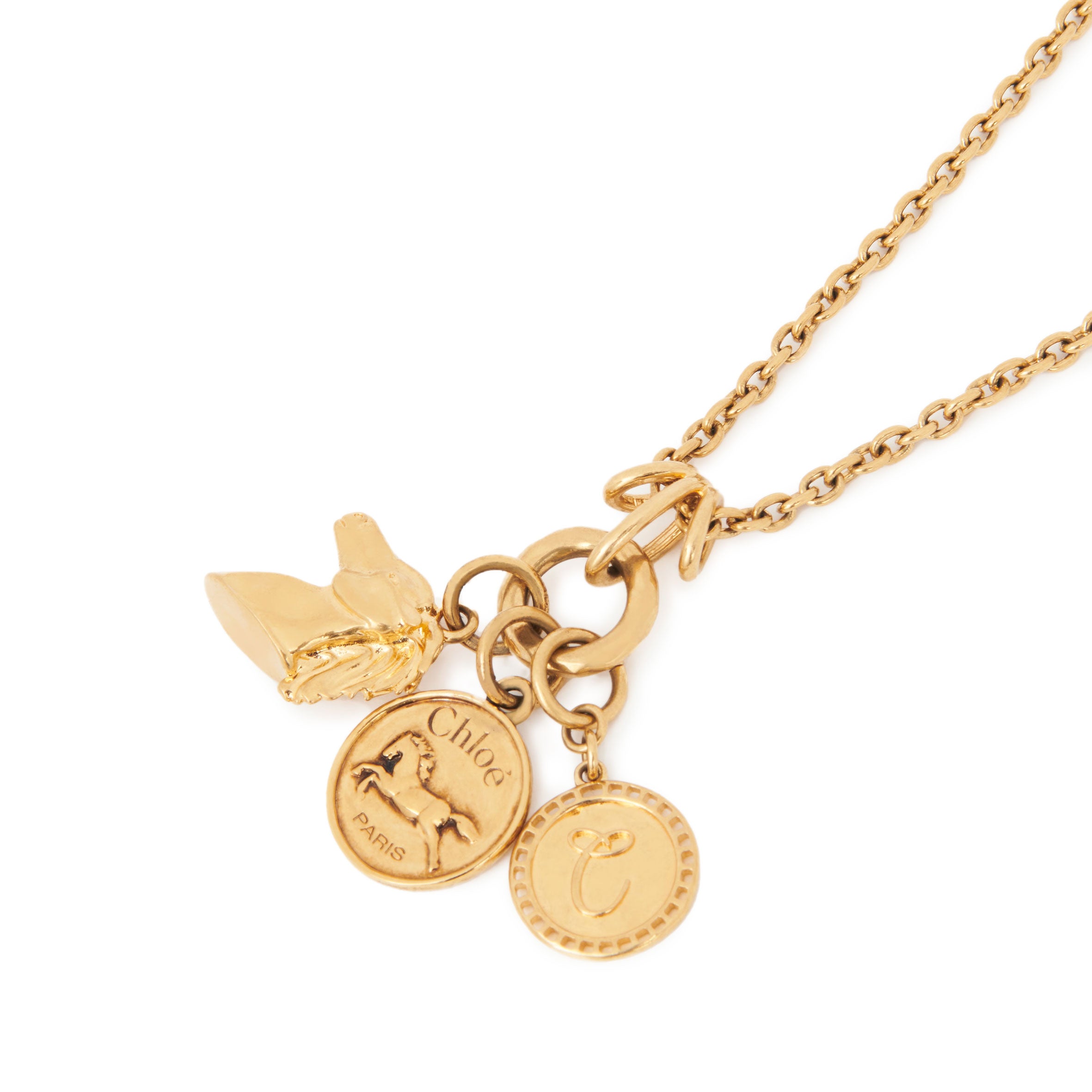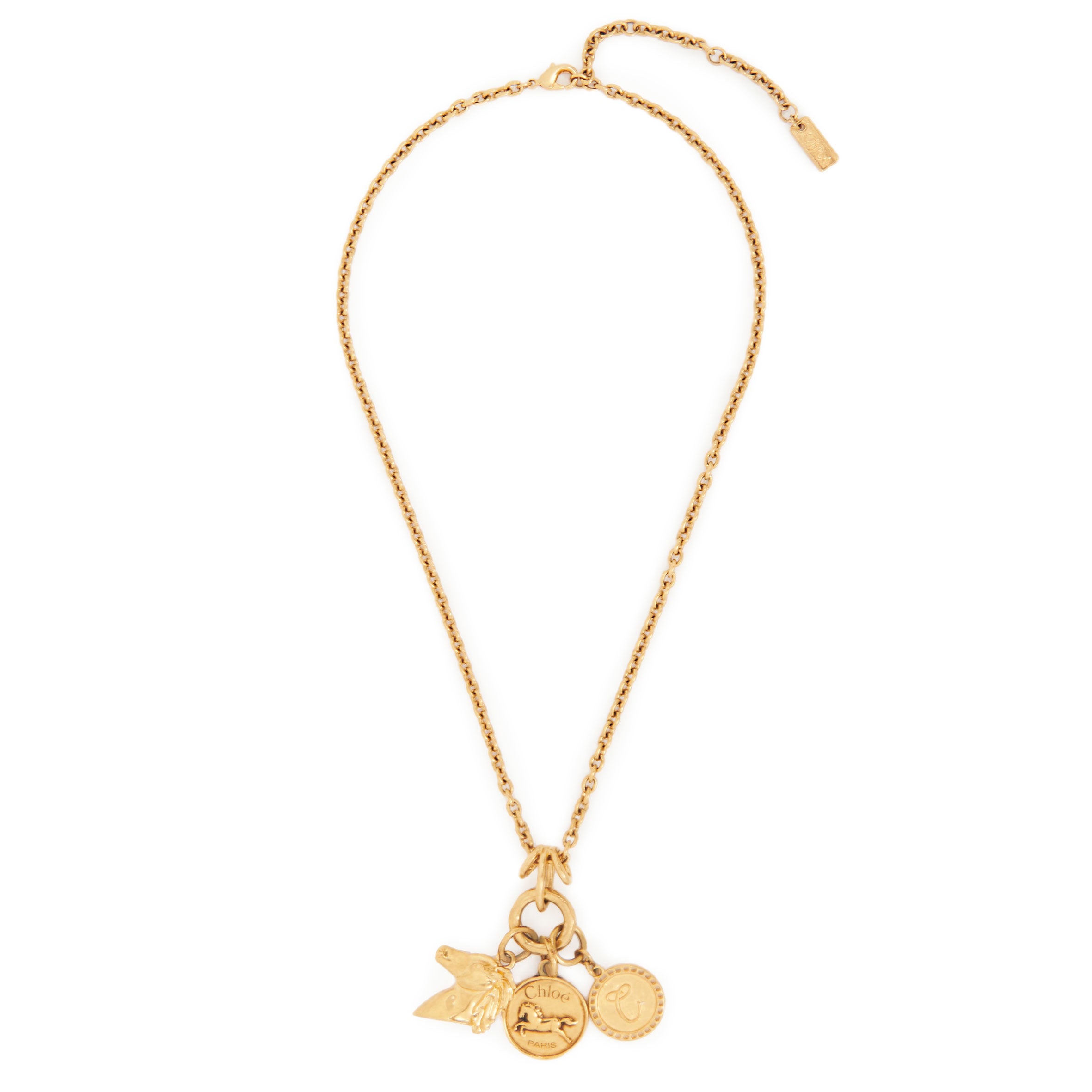 Chloé Charms necklace in vintage gold brass. A cluster of three pendants – a horse head, the letter C and a Chloé Horse Medal – is set on an adjustable chain in an exploration of the Maison's heritage. A gold-tone Chloé logo plate signs this piece.