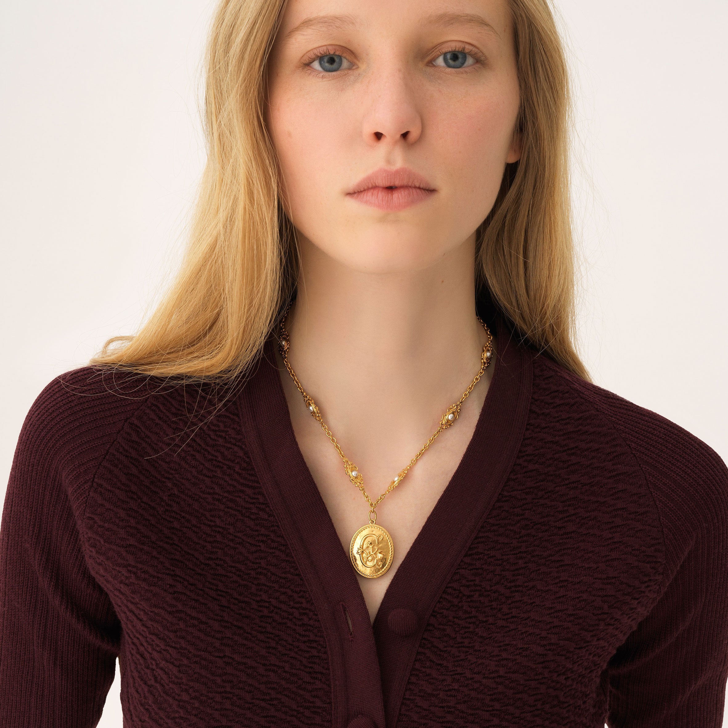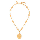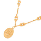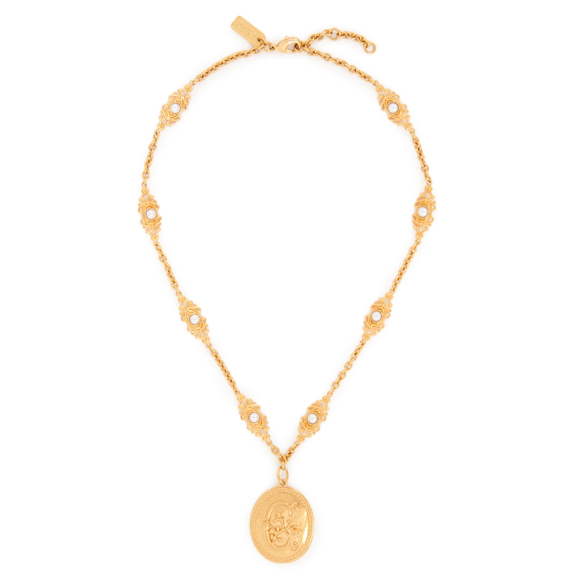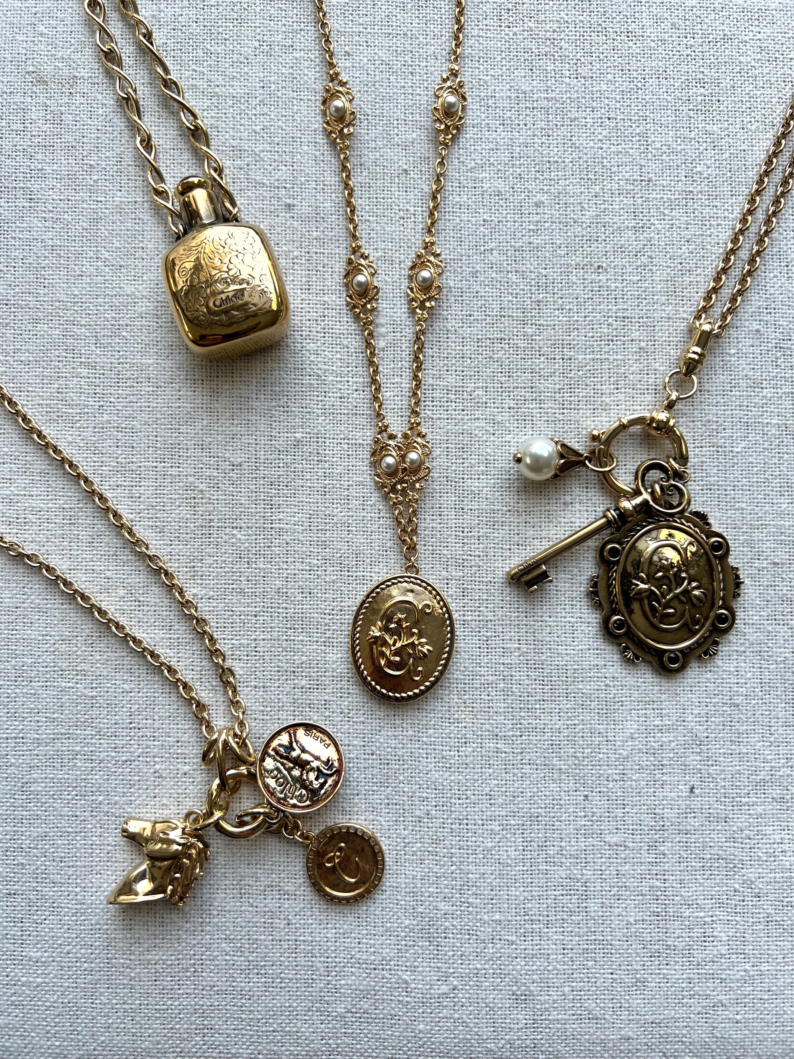 Château Treasures necklace in vintage gold brass featuring a double-sided floral "C" medal on a chain embellished with ornamental pieces and tiny inlaid resin pearls. A gold-toned Chloé logo plate signs this piece.