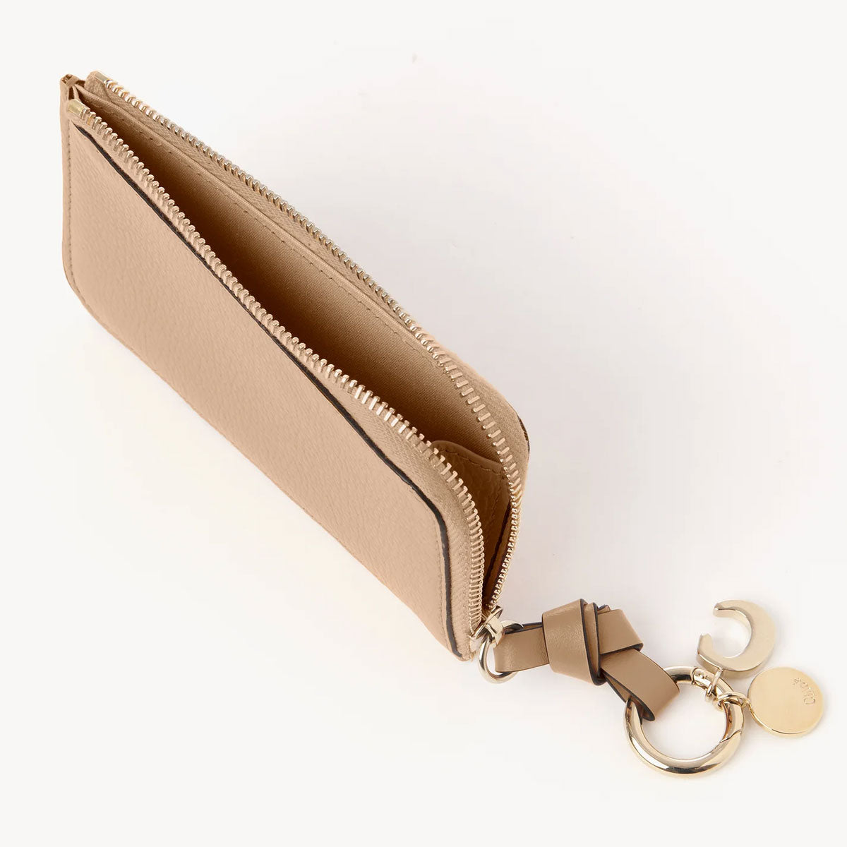 Chloé's Alphabet zip card holder in grained leather. Featuring 1 bill/note compartment, 6 card slots and curved zip compartment. Finished with signature gold tone logo disc and cut out 'C' charm and gold hot-stamp logo.