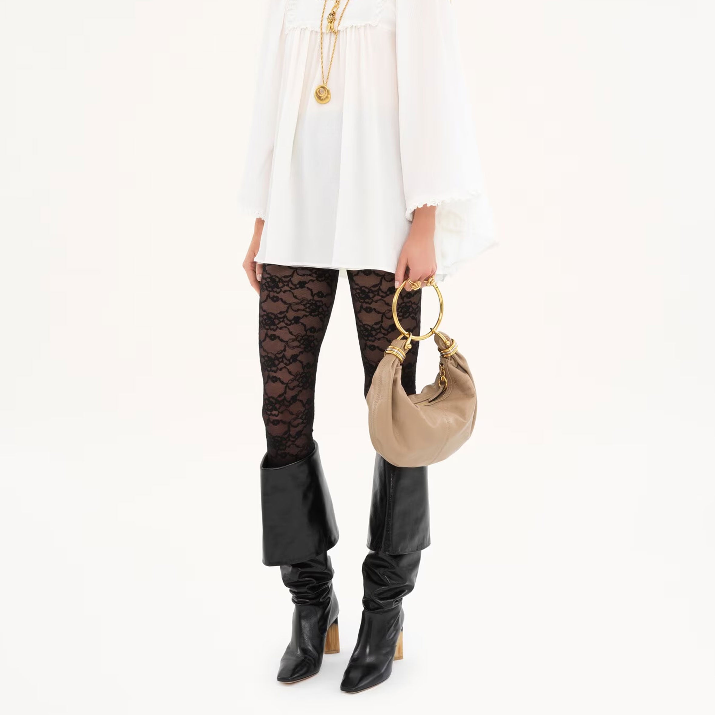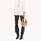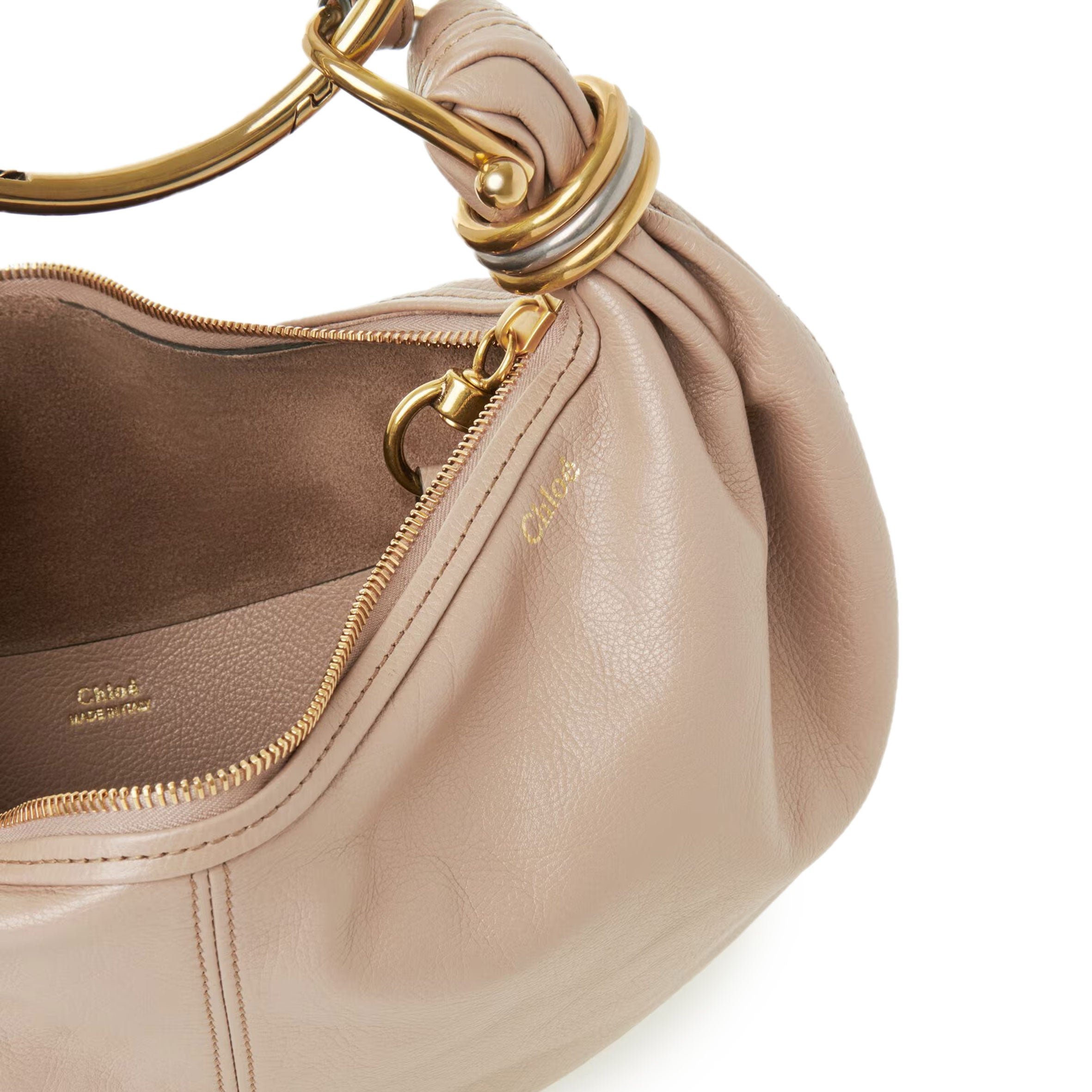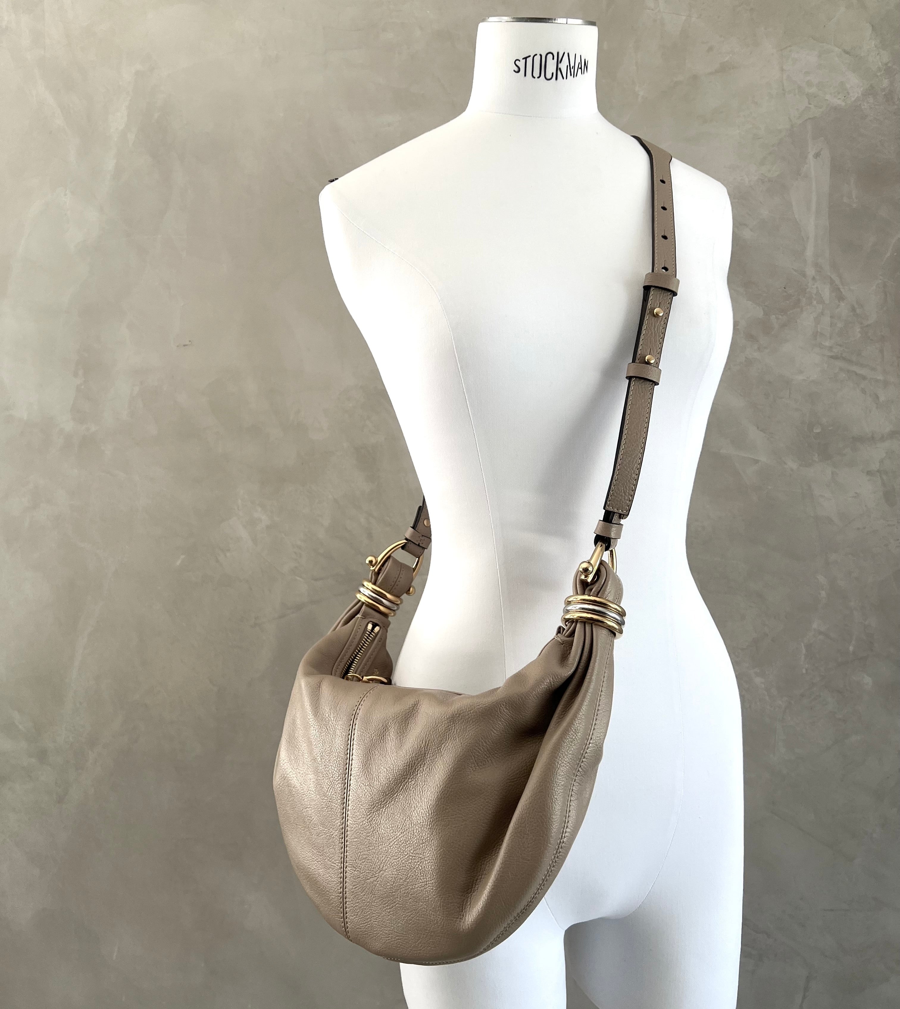 Inspired by the Maison's Archives, this small Bracelet Hobo bag is crafted from shiny grained calfskin. The supple, rounded shape is elevated by a bracelet handle and stacked bi-colour rings at the ends.