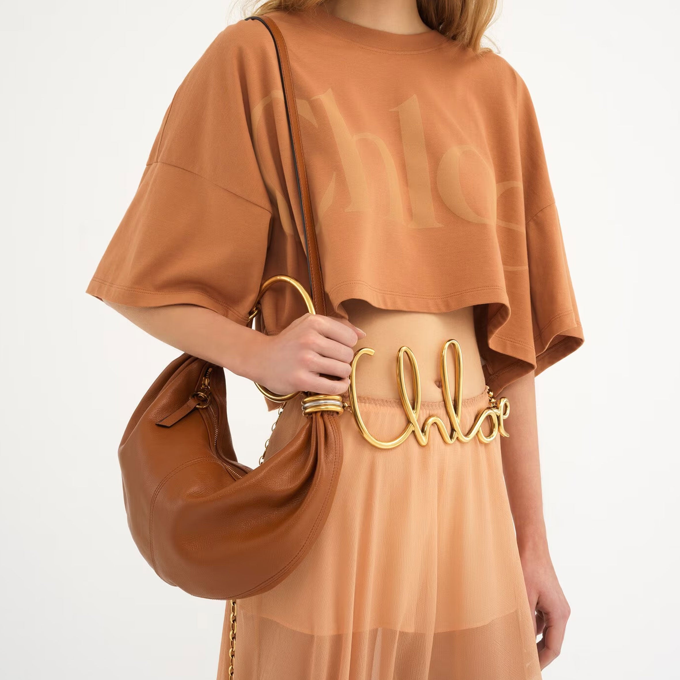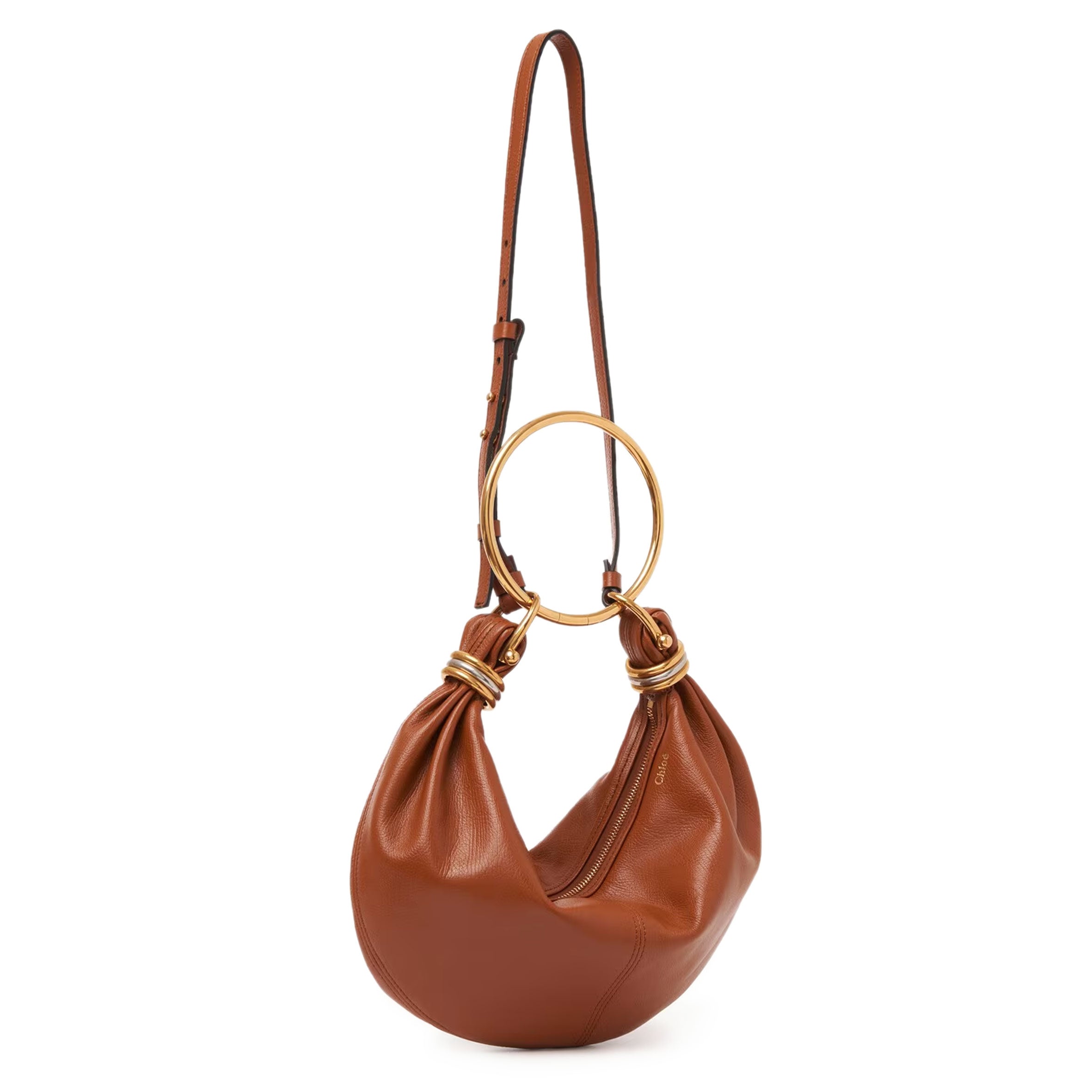 Carry the small Bracelet bag in the hand or on the shoulder. Remove the ring and wear as a casual crossvody banana style bag.