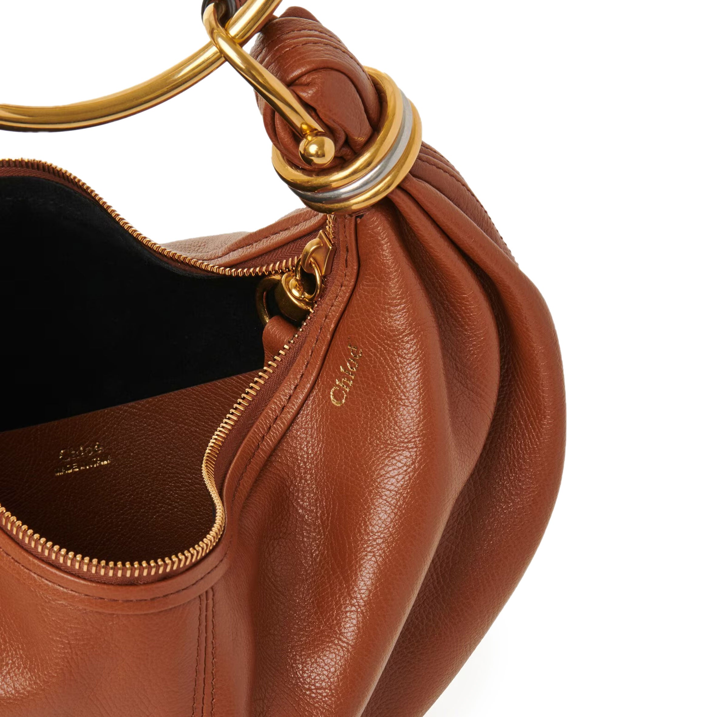 Inspired by the Maison's Archives, this small Bracelet Hobo bag is crafted from shiny grained calfskin. The supple, rounded shape is elevated by a bracelet handle and stacked bi-colour rings at the ends.