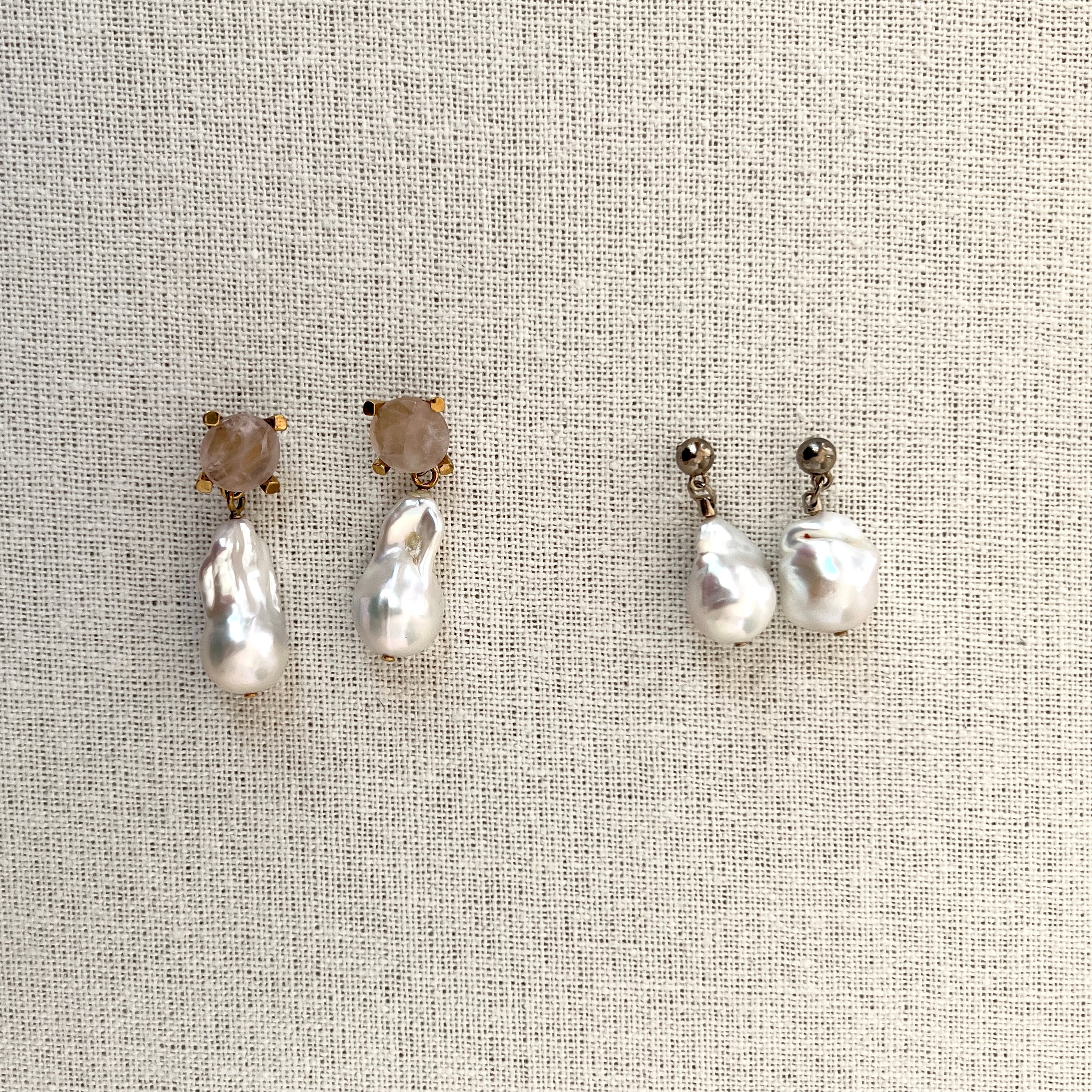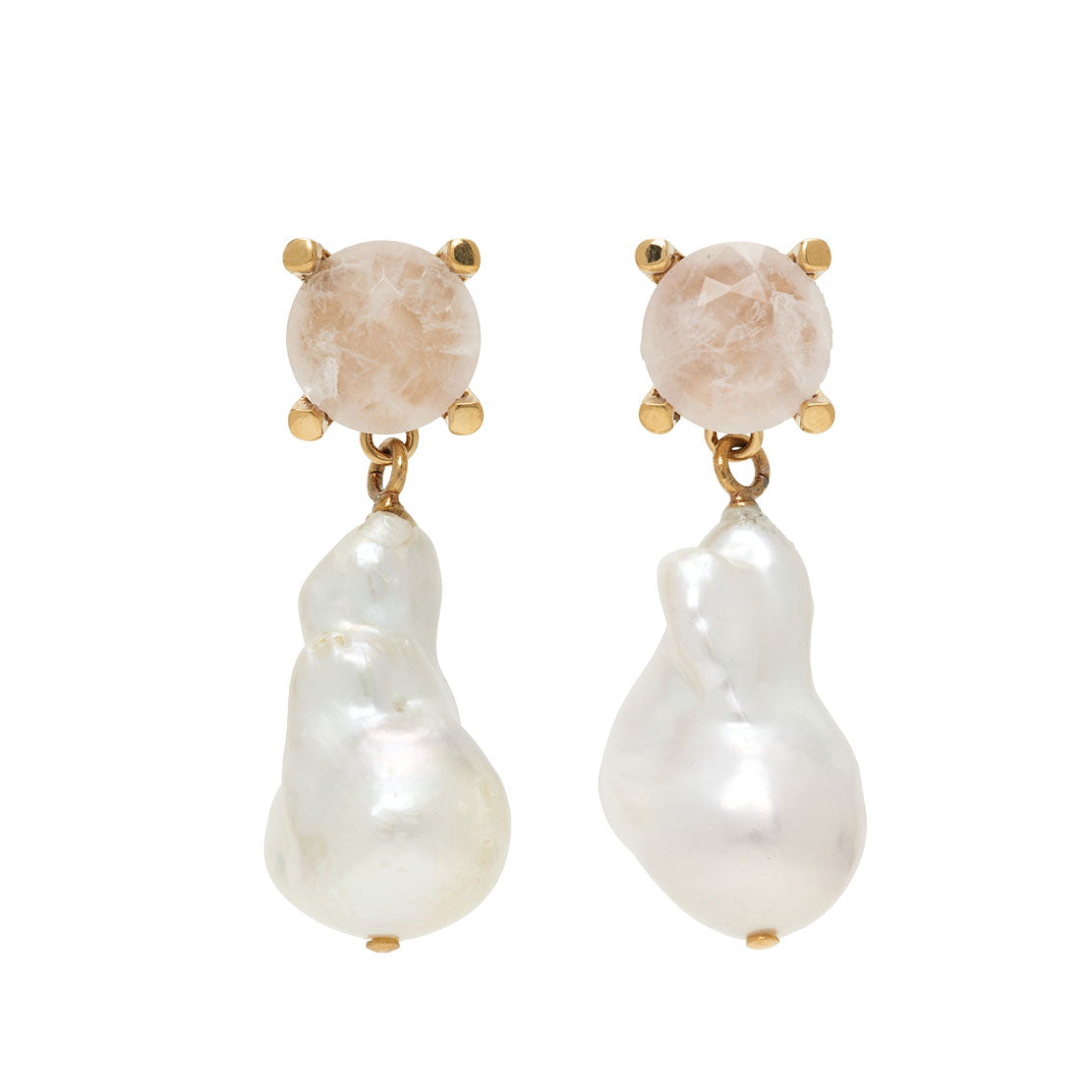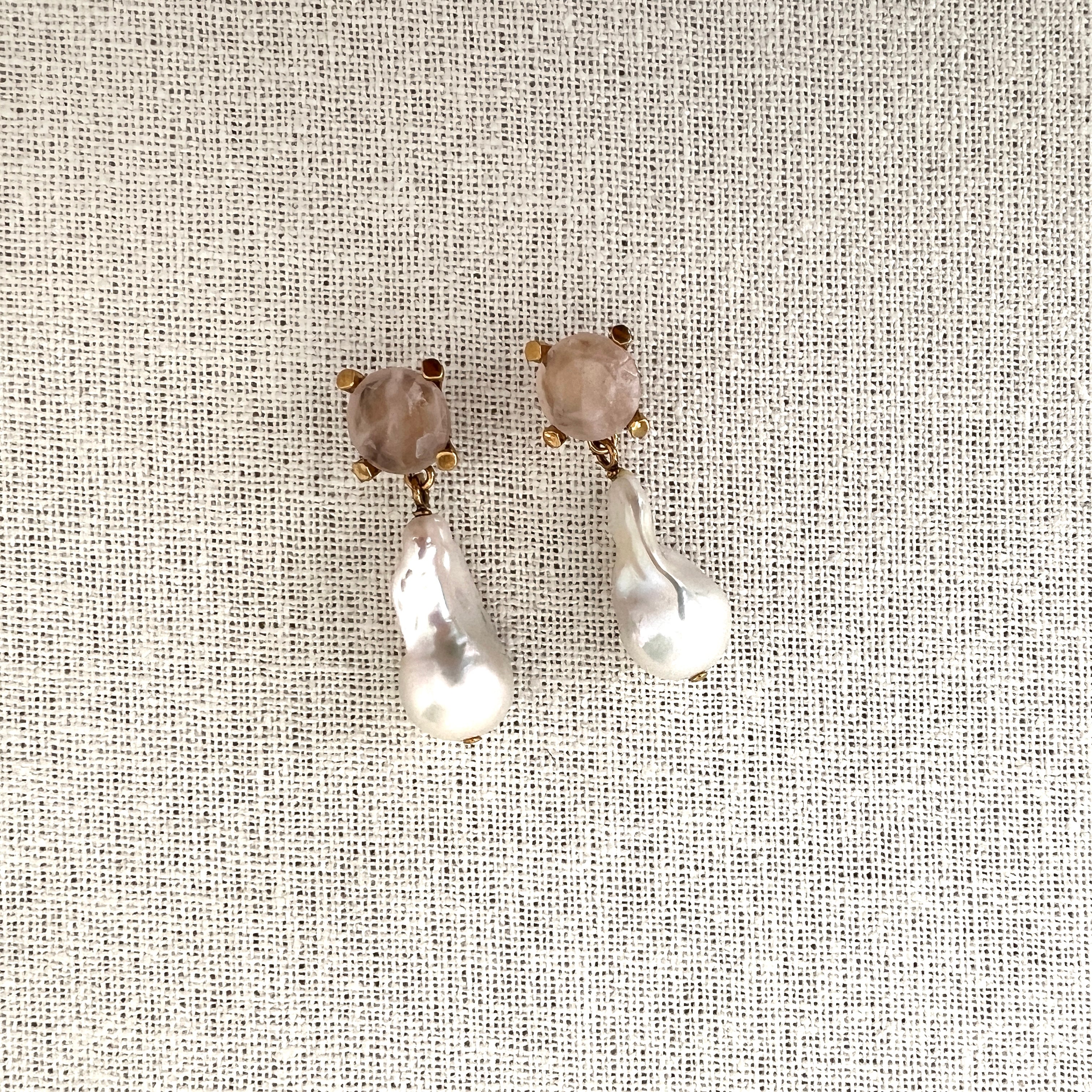 Pearl earrings in brass & freshwater baroque pearl with quartz detail.