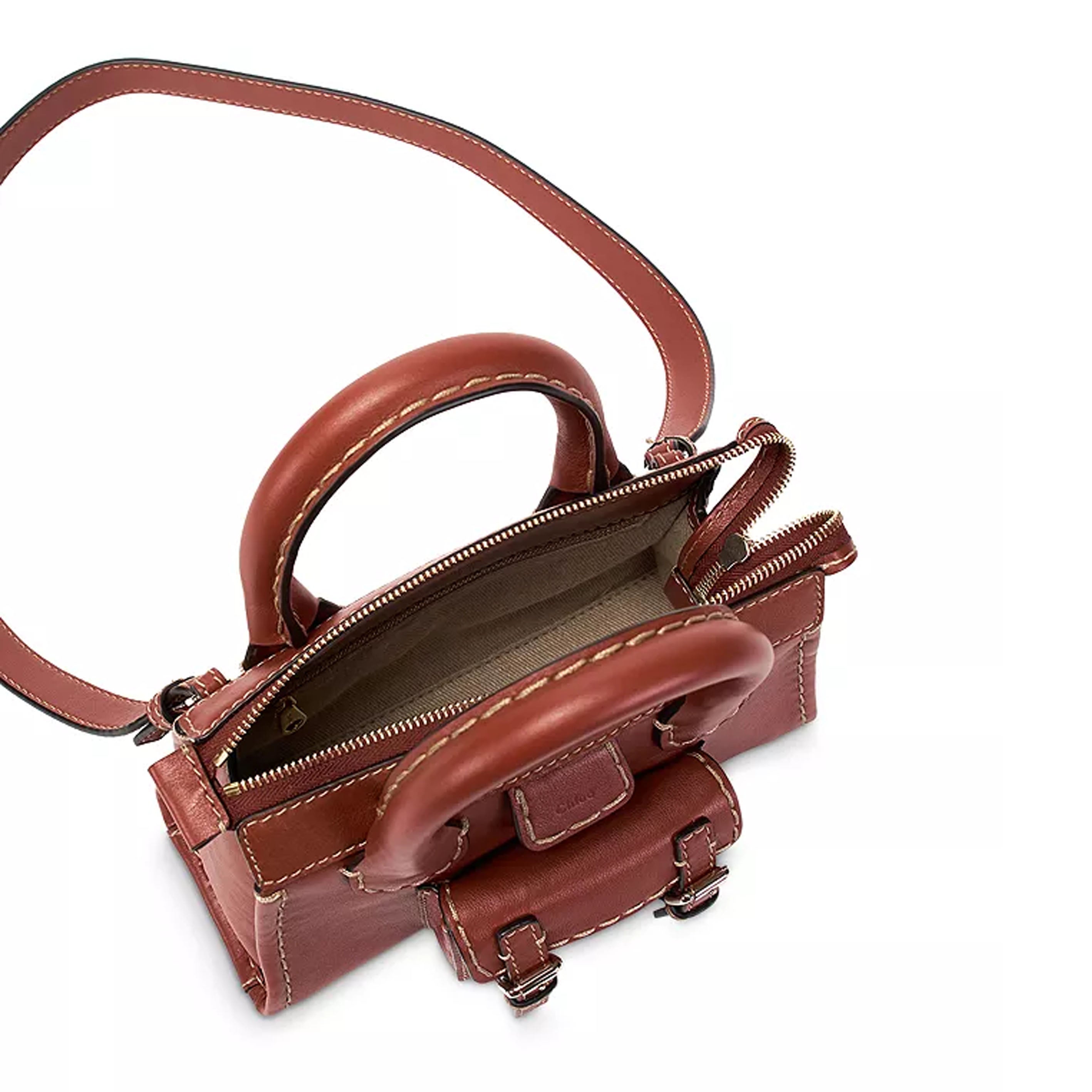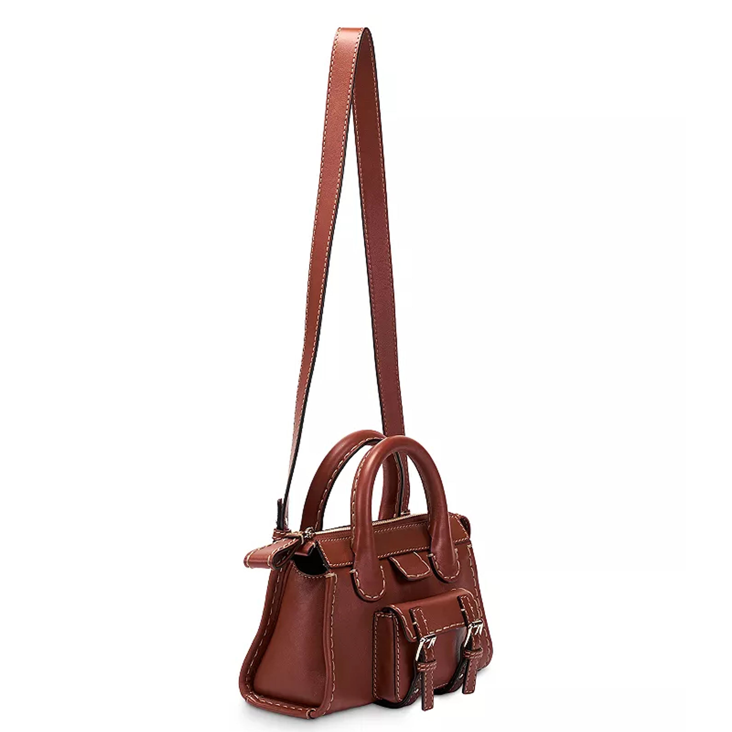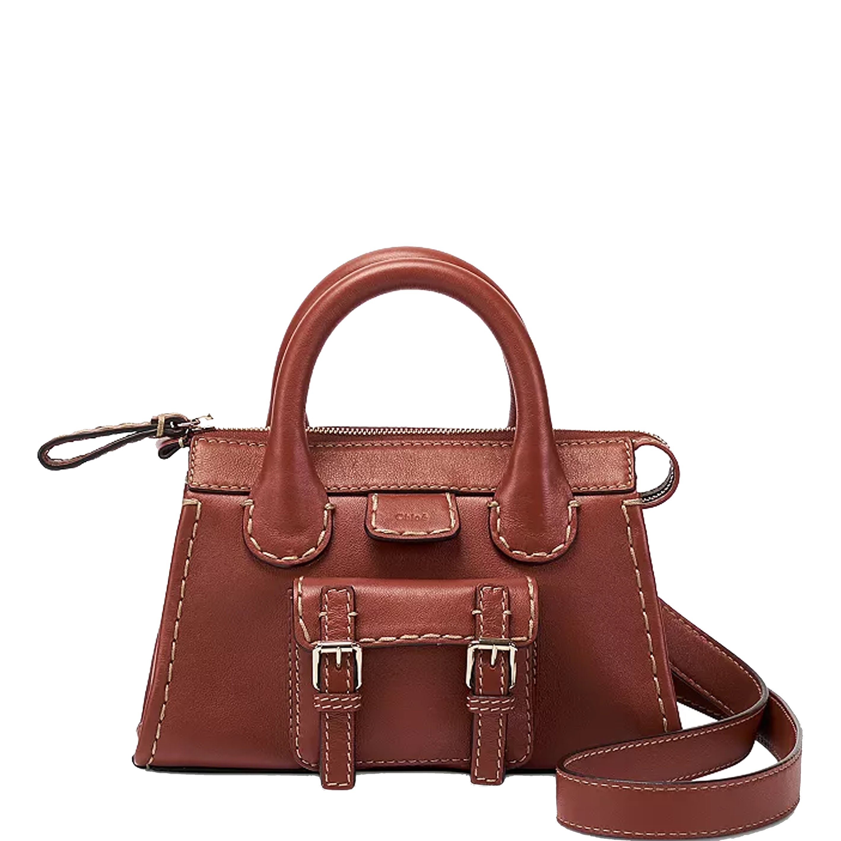 The iconic Chloe Edith bag has been reworked with contrast stitching that defines the shape of this bowling-style bag, crafted in supple grained leather. Featuring double top handles a removable shoulder strap and top zip closure. Finished with antique brass hardware. The bag consists of an inside zip compartment and lined with linen.