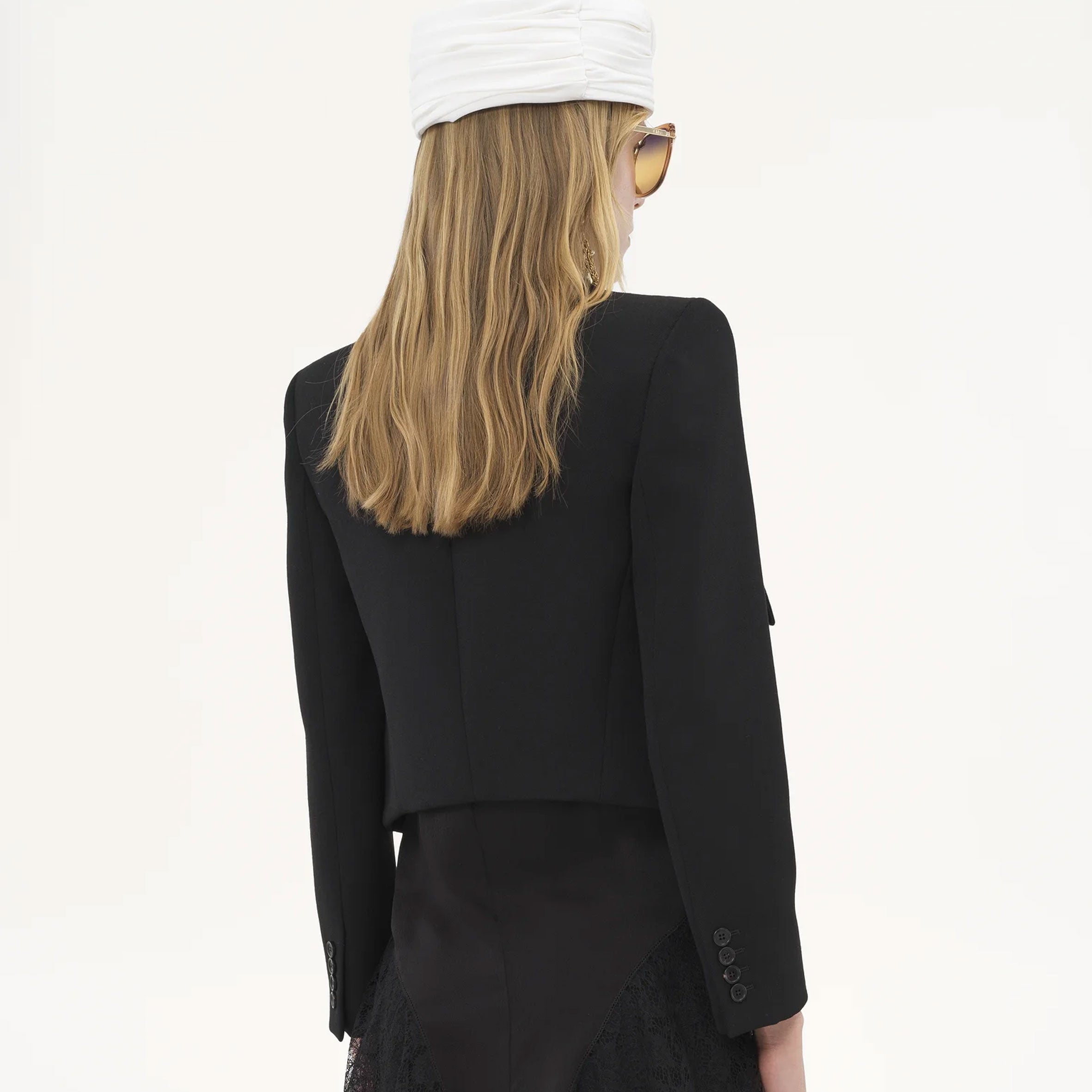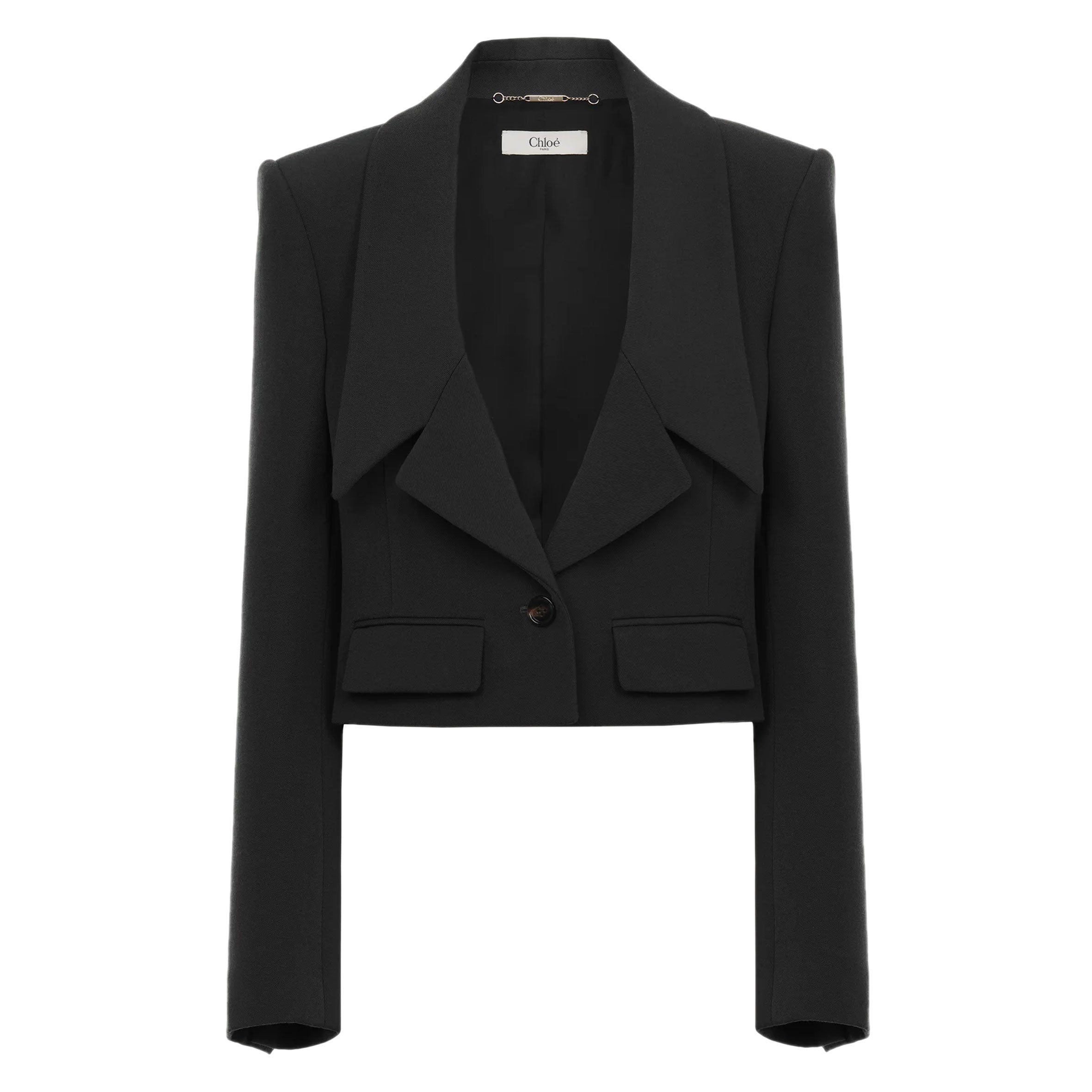 Cropped tailored jacket in lower-impact wool gabardine, inspired by the Maison's heritage. Mini flap pockets, oversized lapels and engraved horn buttons finish this piece.