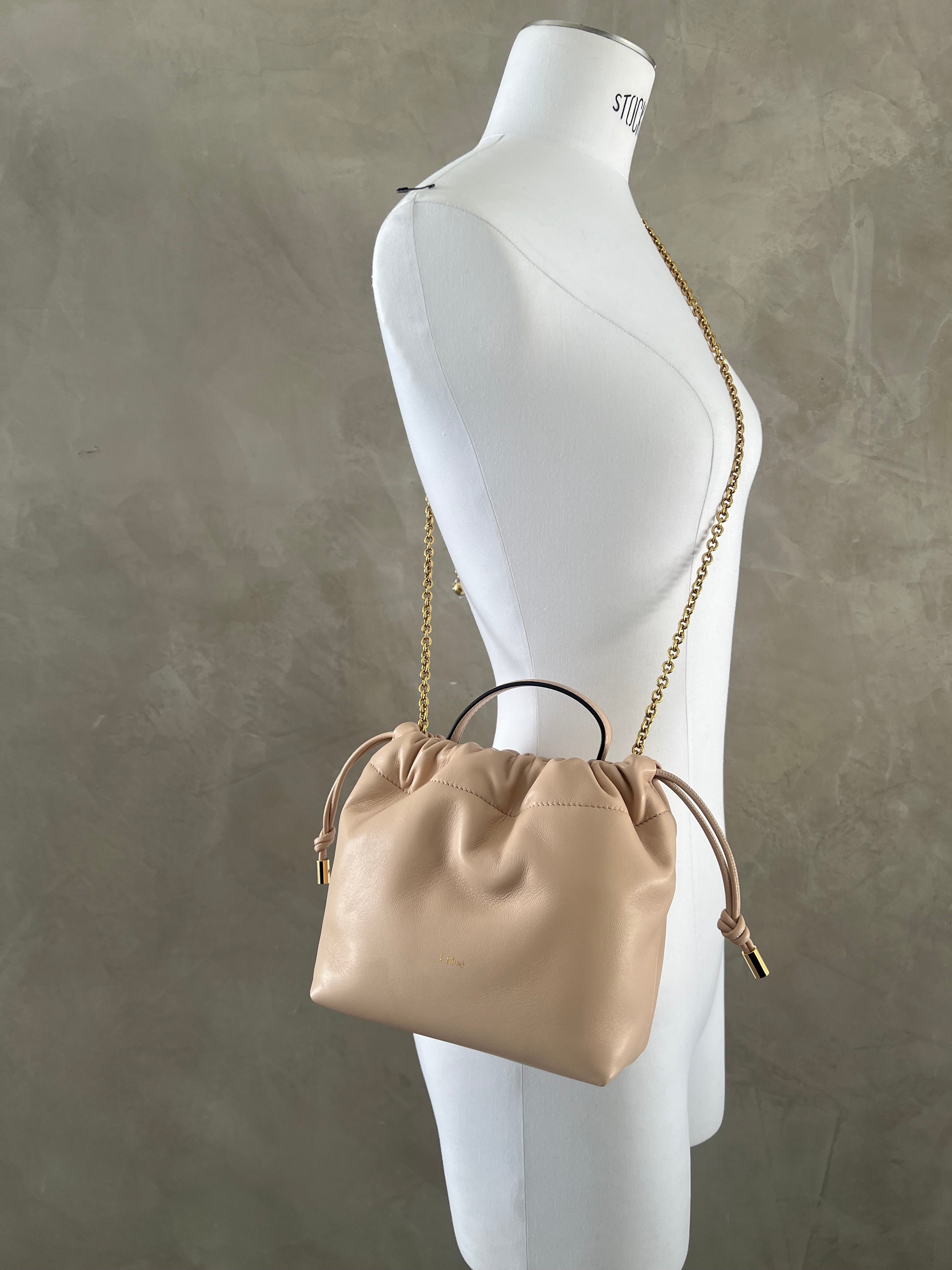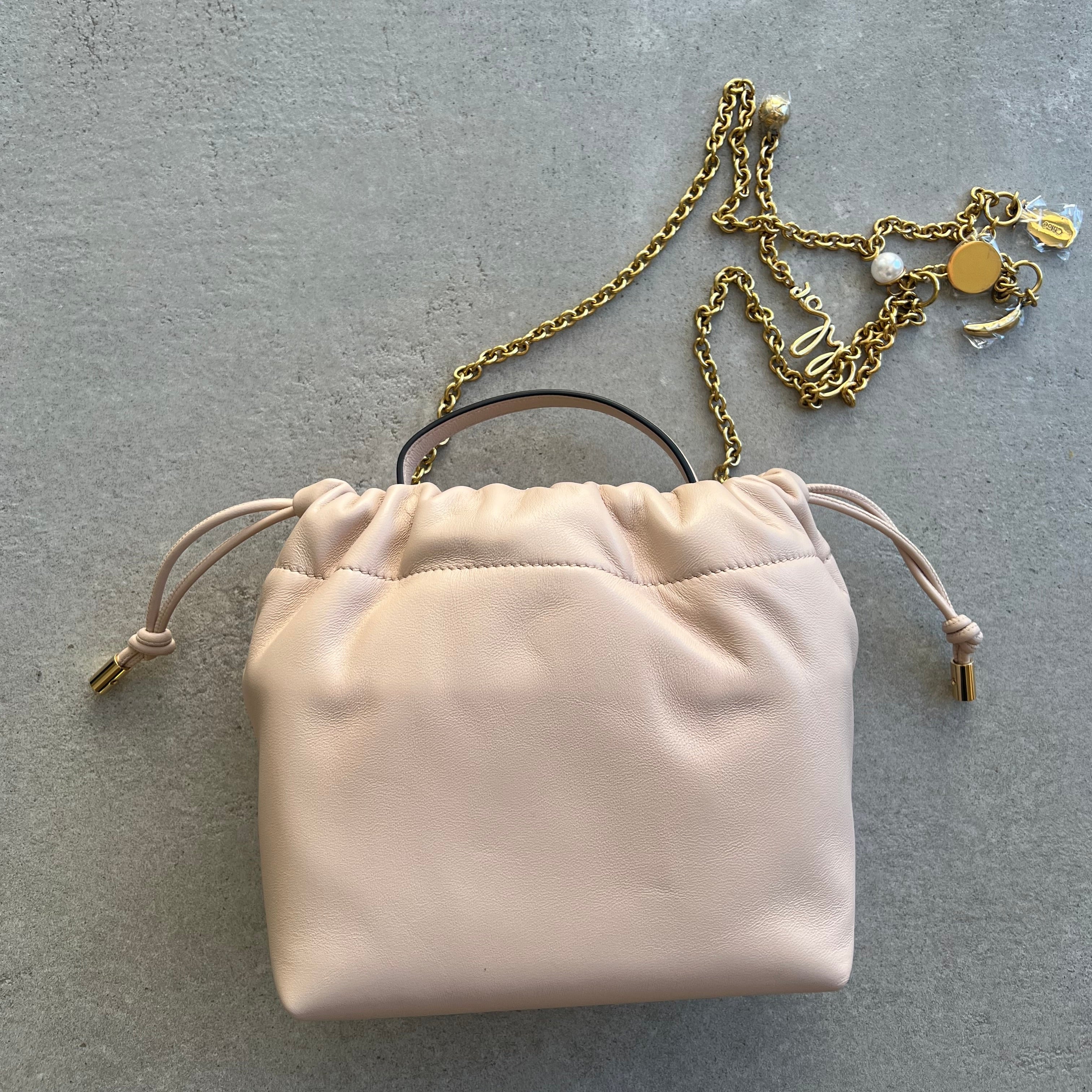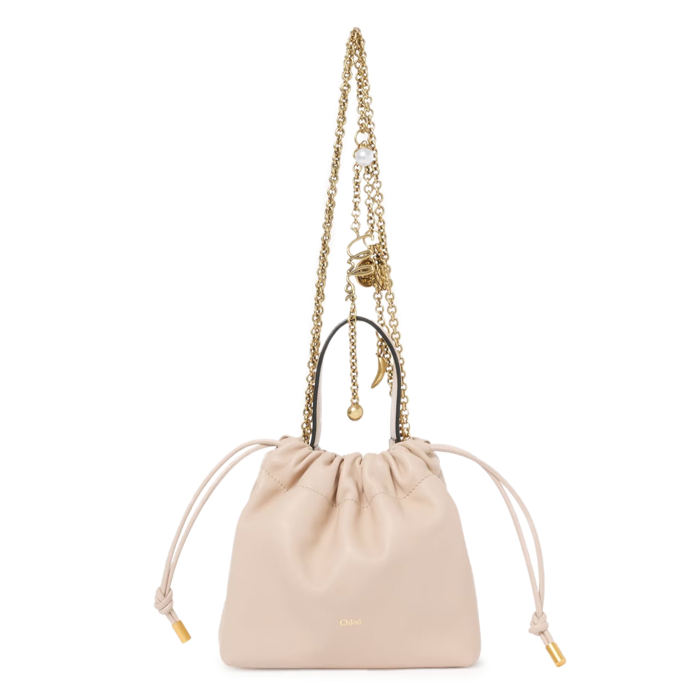 This mini Chloé Icons shoulder bag with chain is crafted from smooth nappa lambskin with a drawstring closure. In a nod to the Maison's DNA, the gold-tone chain is embellished with a Horse Medal, miniature charms and the Chloé signature.