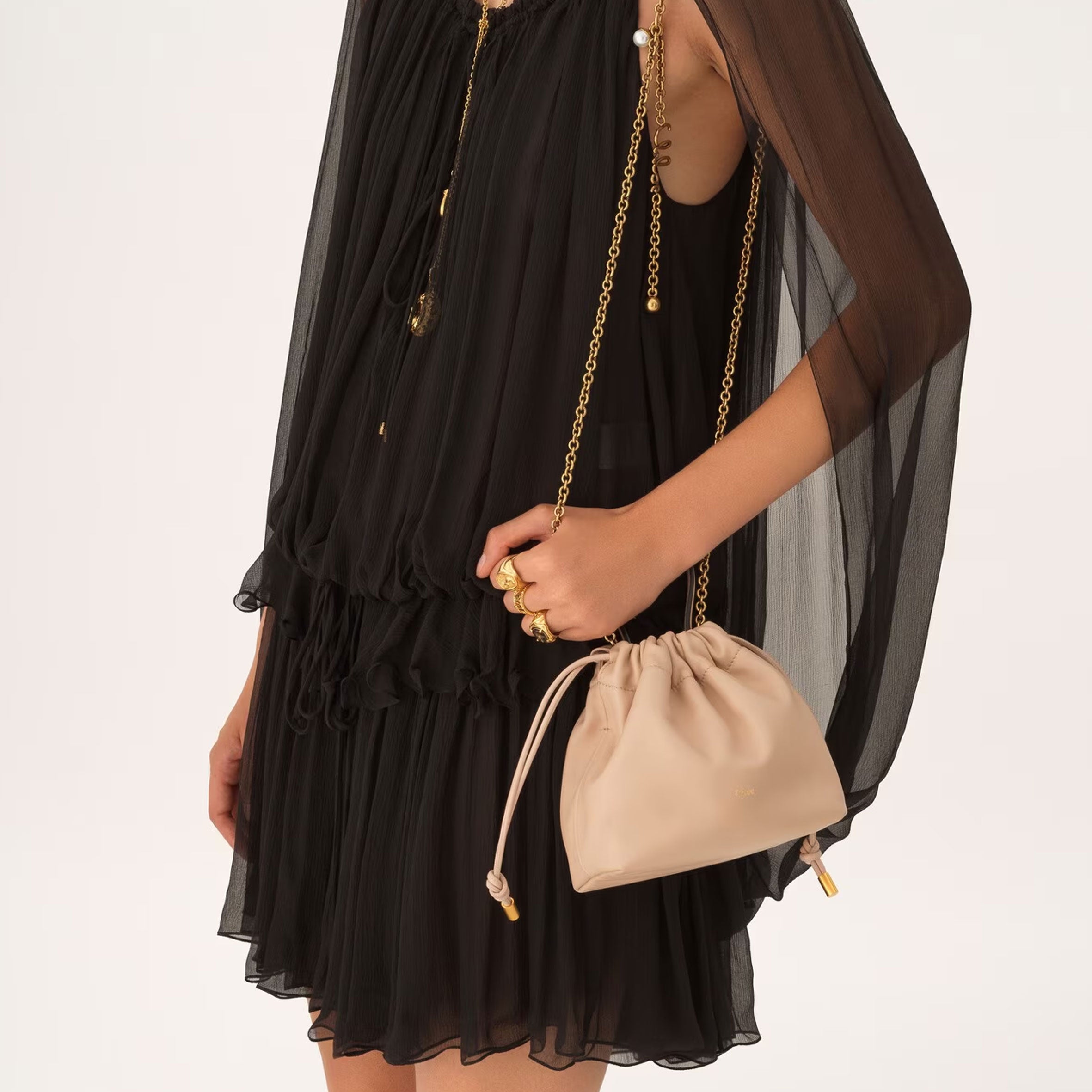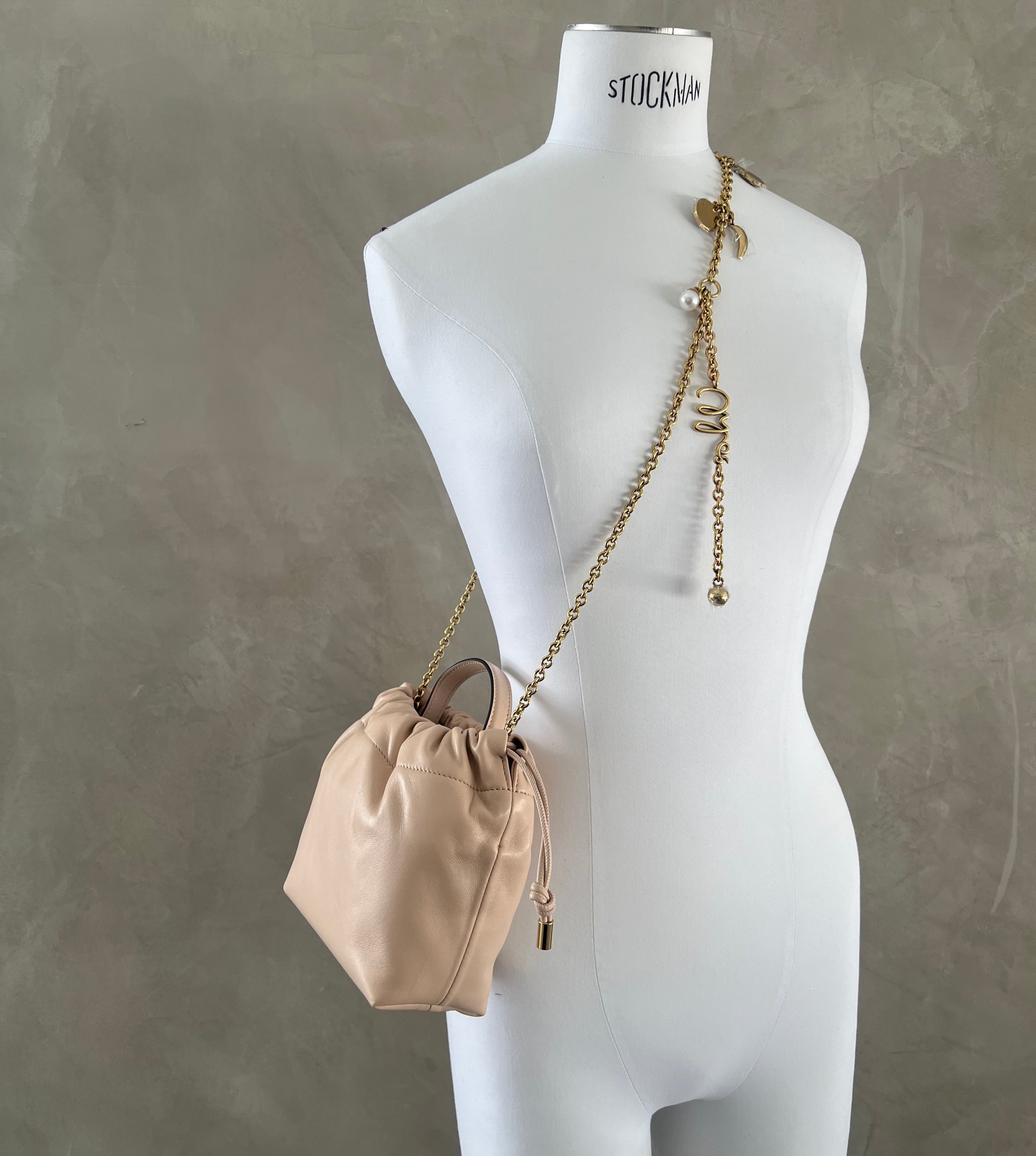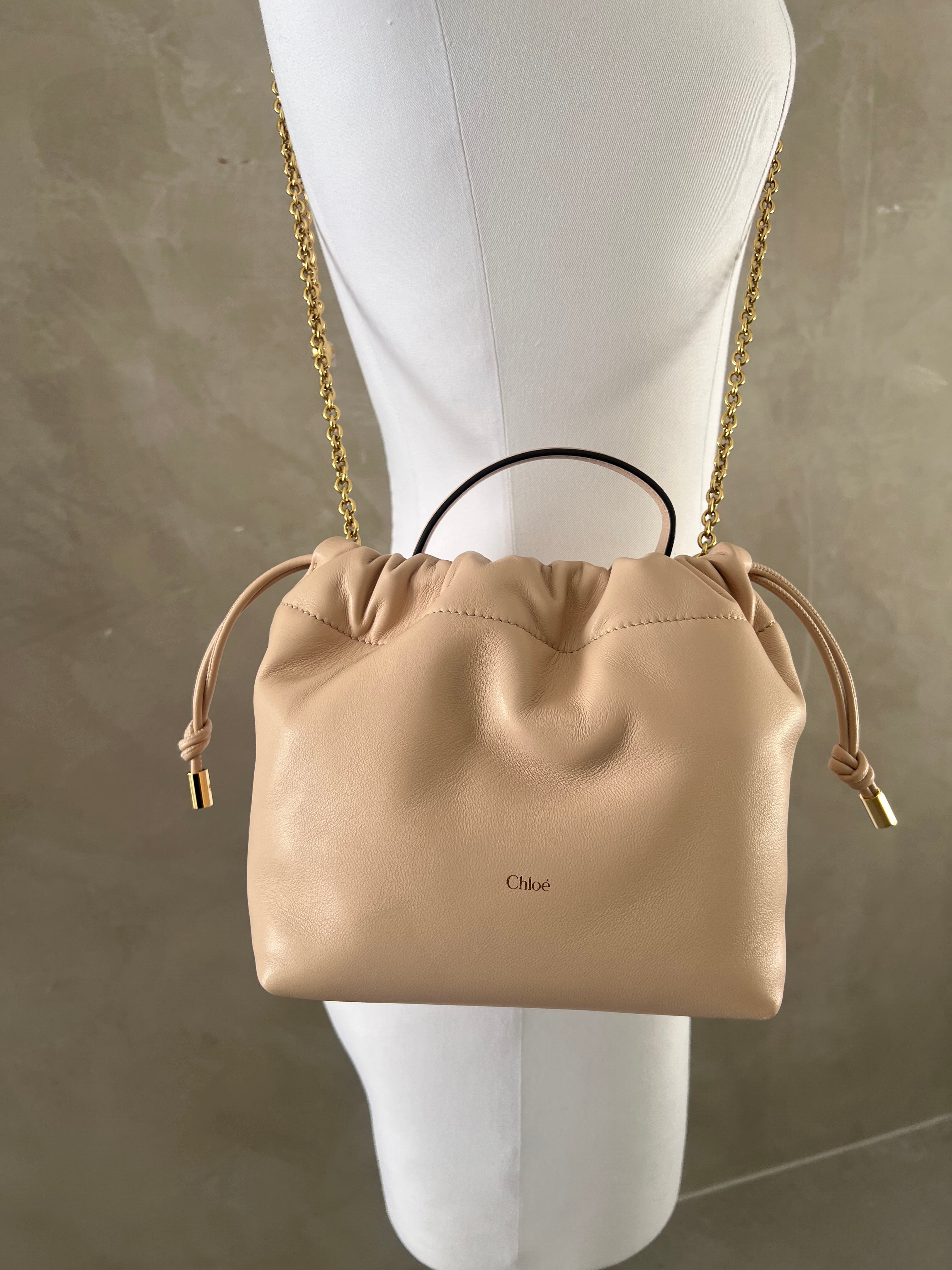 This mini Chloé Icons shoulder bag with chain is crafted from smooth nappa lambskin with a drawstring closure. In a nod to the Maison's DNA, the gold-tone chain is embellished with a Horse Medal, miniature charms and the Chloé signature.