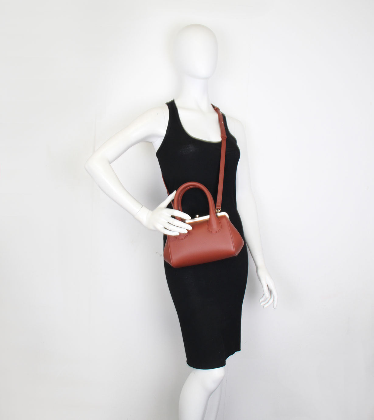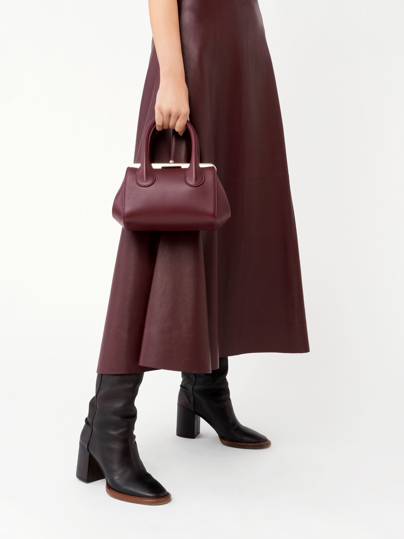 Sophisticated and elegant with an elaborate brass frame, the small Joyce frame handbag has a jewelry allure. The main compartment is detailed with a flat pocket, while the removable strap allows for multiple styling options. This version is crafted from luxurious shiny calfskin.