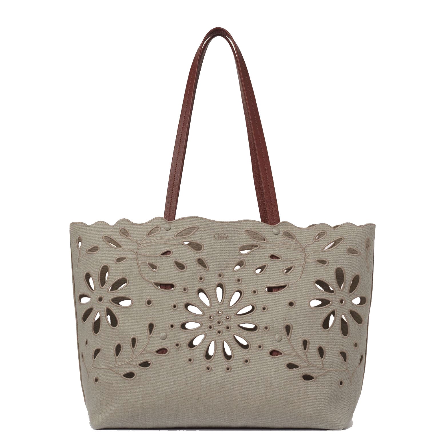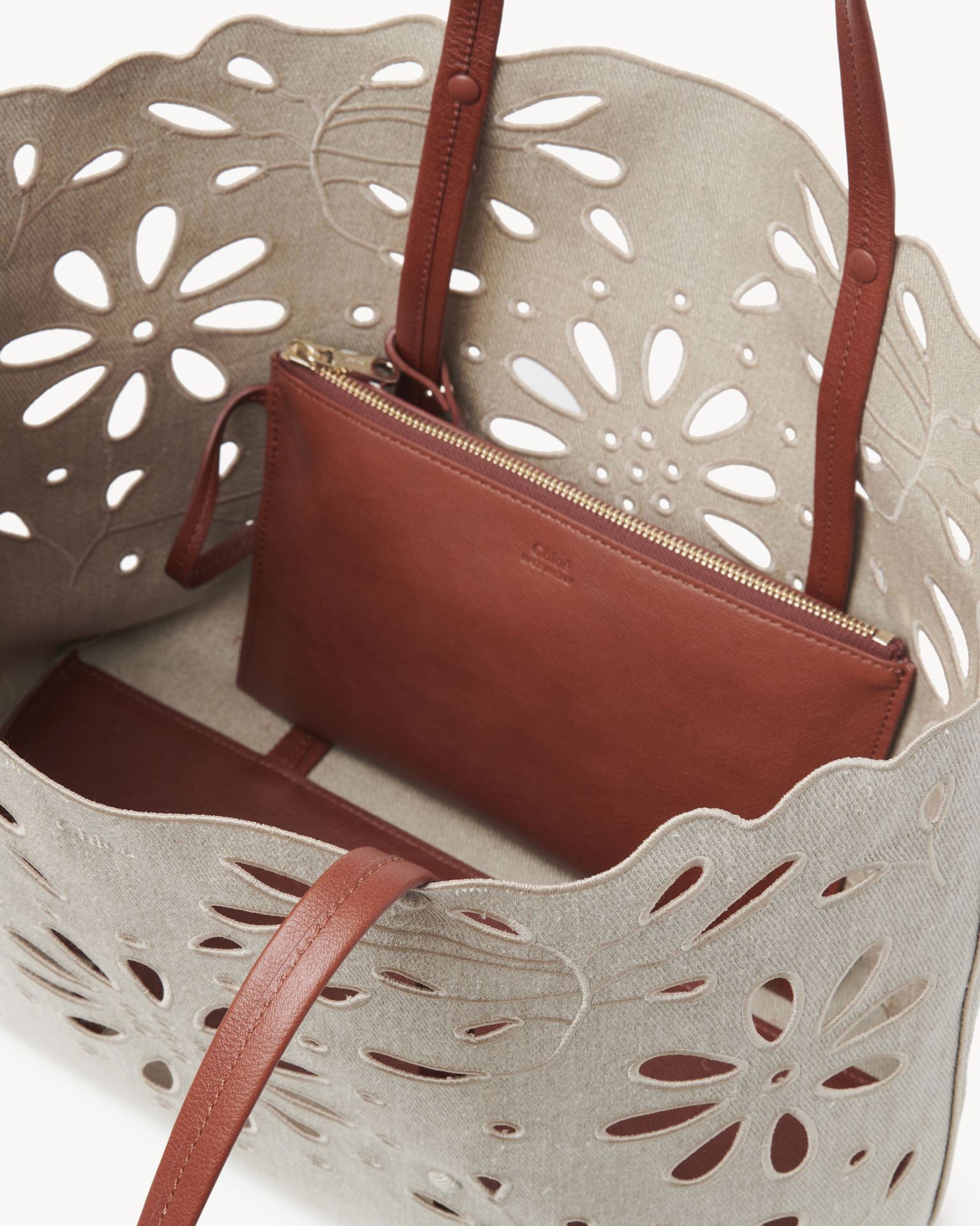 Crafted in a luxurious broderie anglaise linen, detailed with supple leather accents and the brand's iconic scallops. Perfect to carry all you need in style, this bag has arrived just in time for summer in the beautiful and classic, sepia brown.