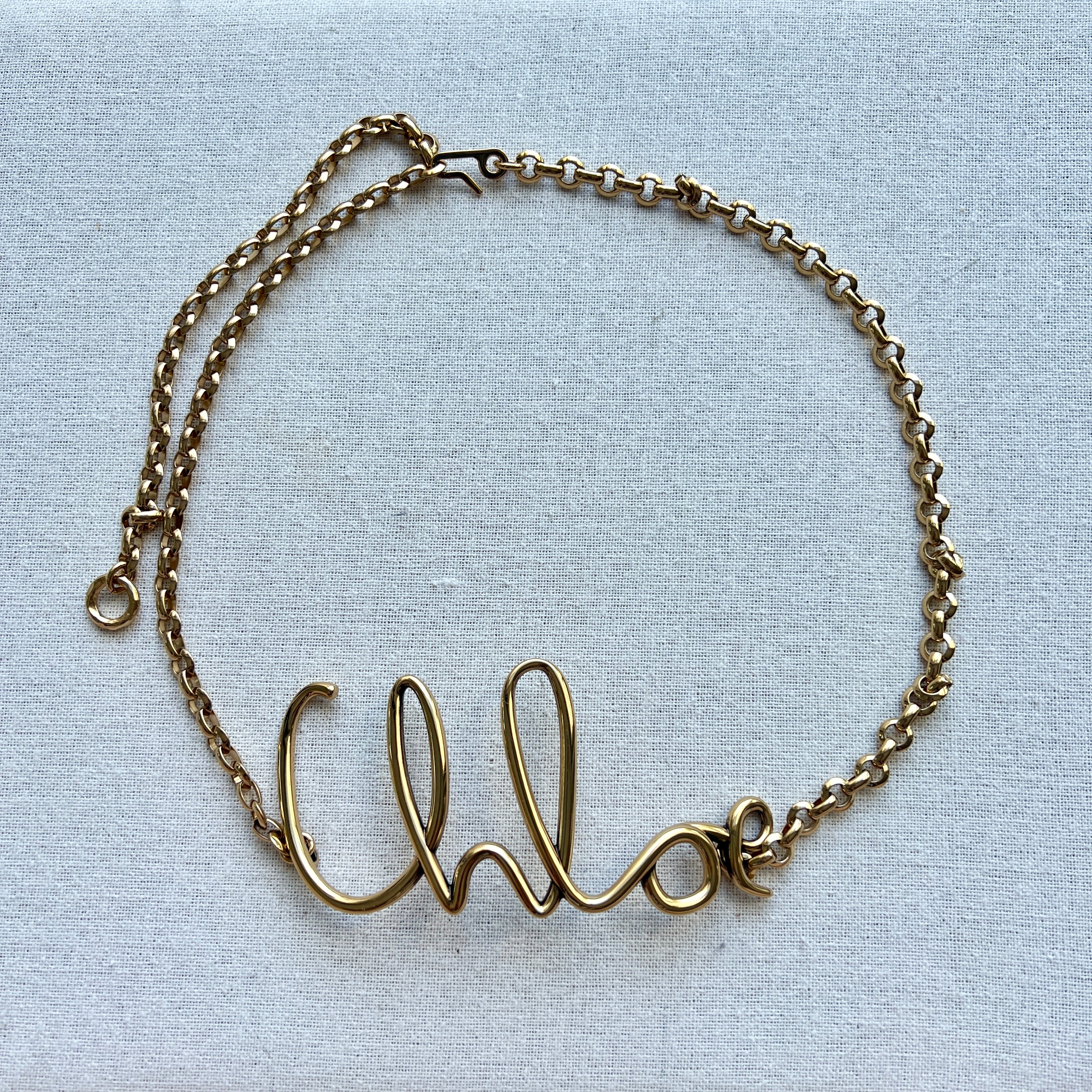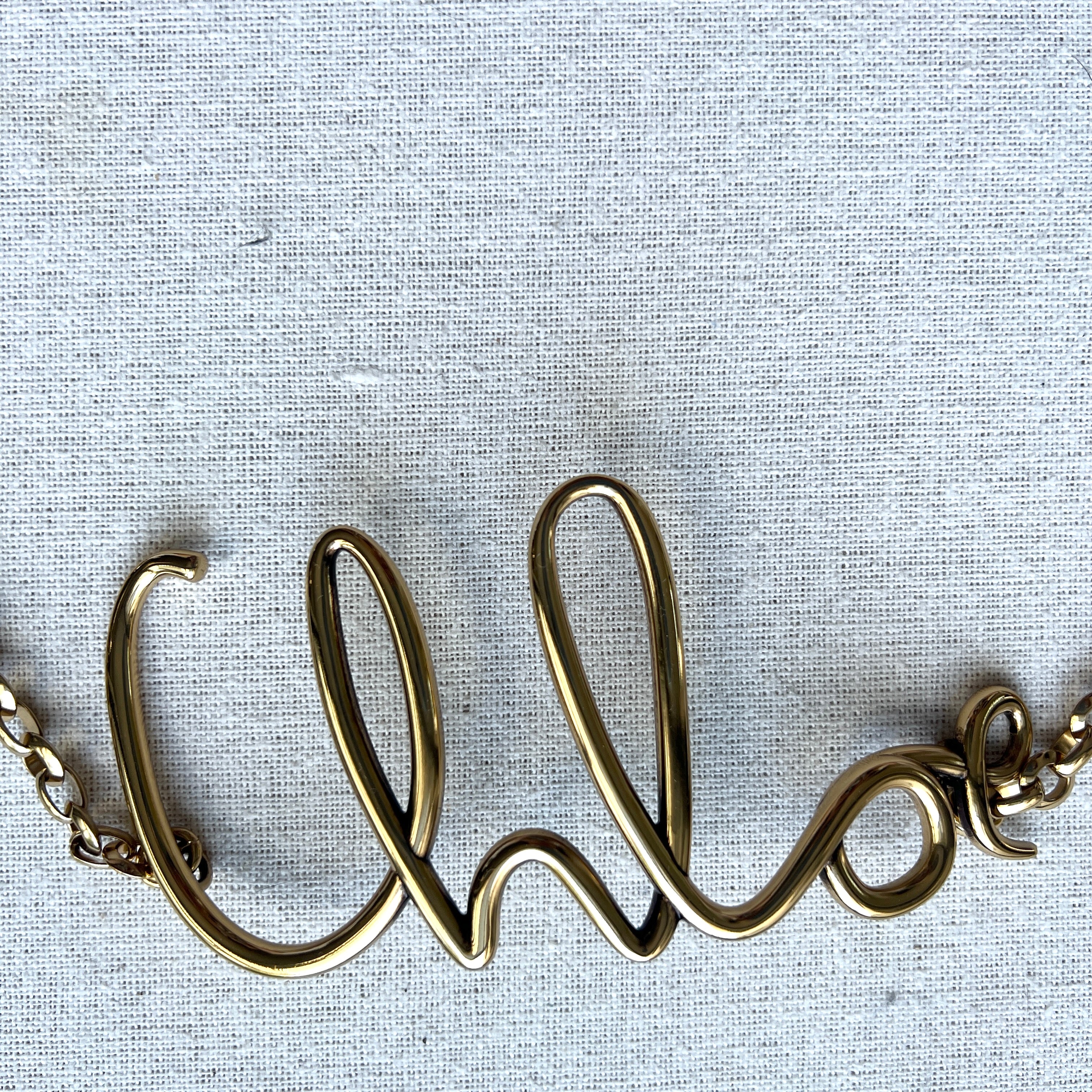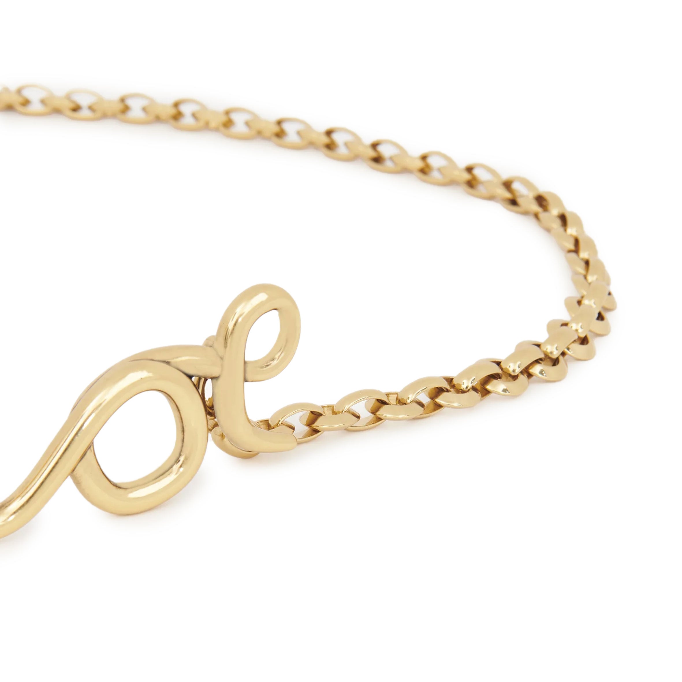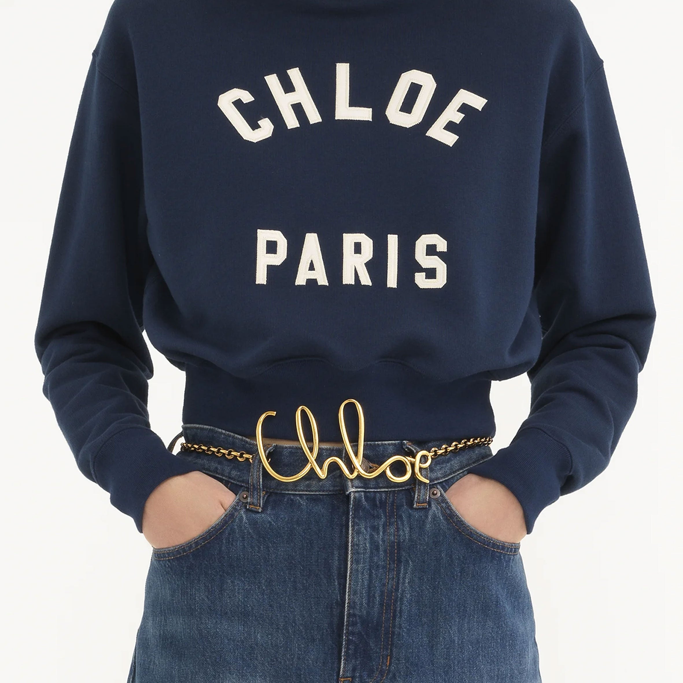 Chloé Iconic chain belt featured on the Fall-Winter 2024 runway, inspired by a design rooted in the Maison's heritage. The chain features small round links elevated by a Chloé logo in gold brass. This belt links to Chloé's jewelry line. Wear high on the waist or low on the hips.