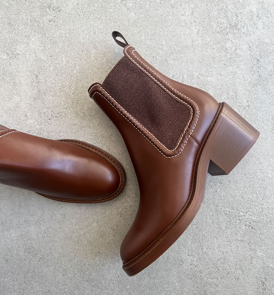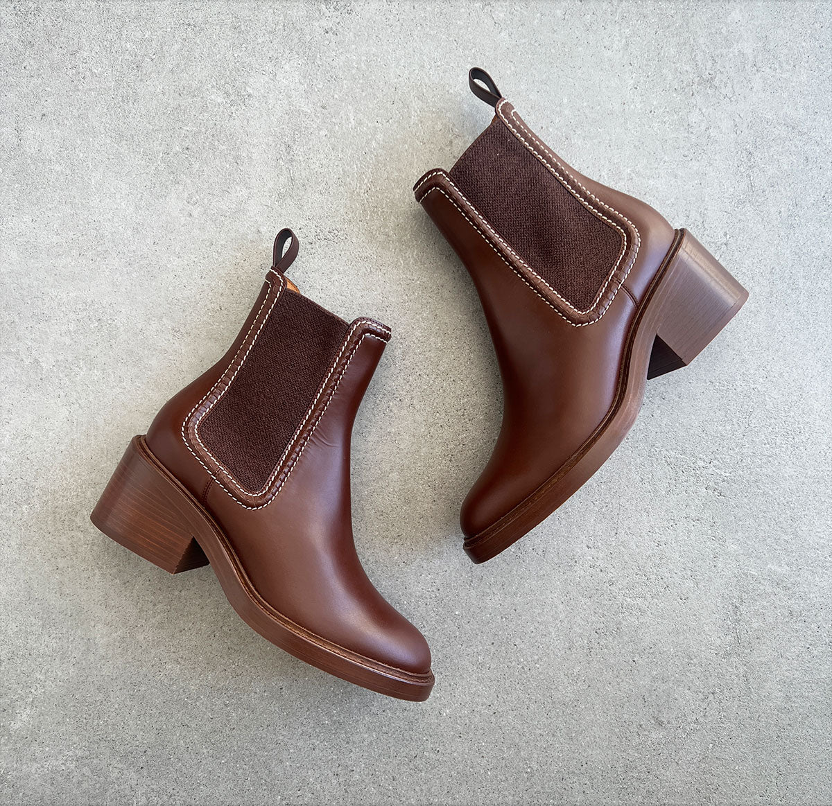 The Mallo ankle boot is crafted from natural-effect calfskin in an effortlessly chic design in soft brown leather. Features a stacked heel and sleek upper with characteristic chelsea boot elastic sides, back tongue making them easy to slip on and off. Finished with an almond shaped toe for a delicate feminine look.