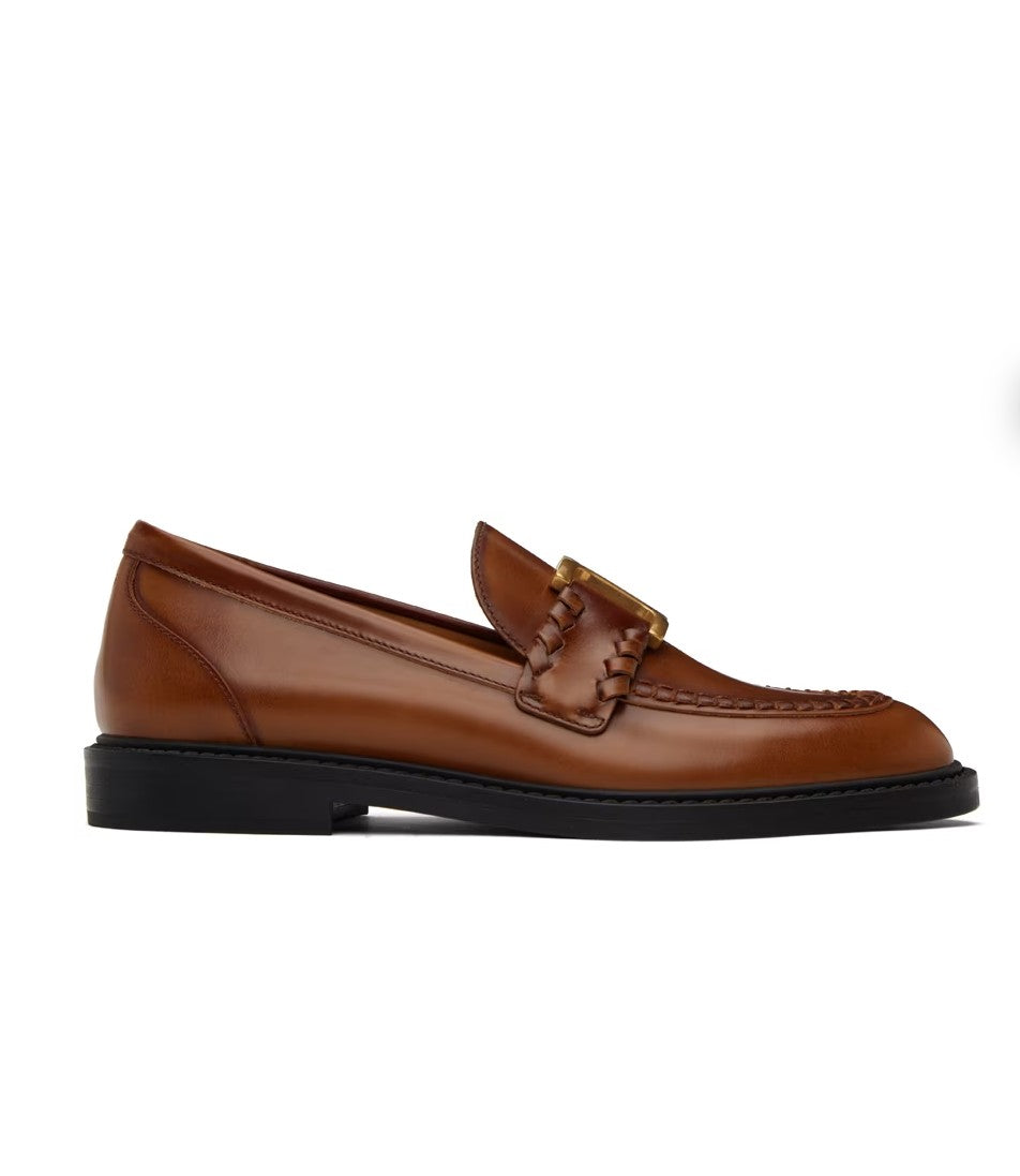 Reinterpreting the iconic leather goods line, this classic Marcie loafer is crafted from brushed calfskin elevated with the distinctive braided details and Chloé-engraved gold-toned hardware found in the Maison's Marcie bags.