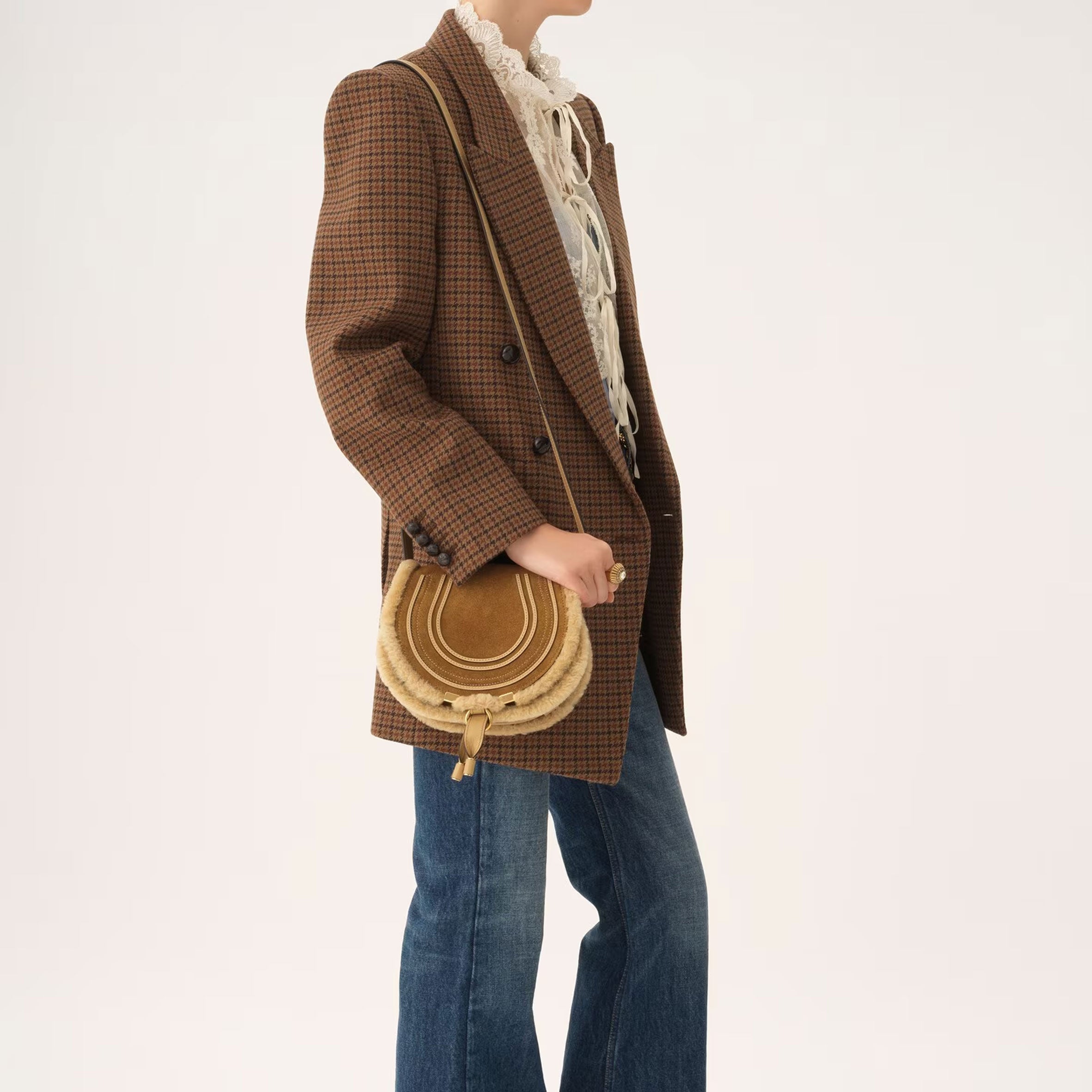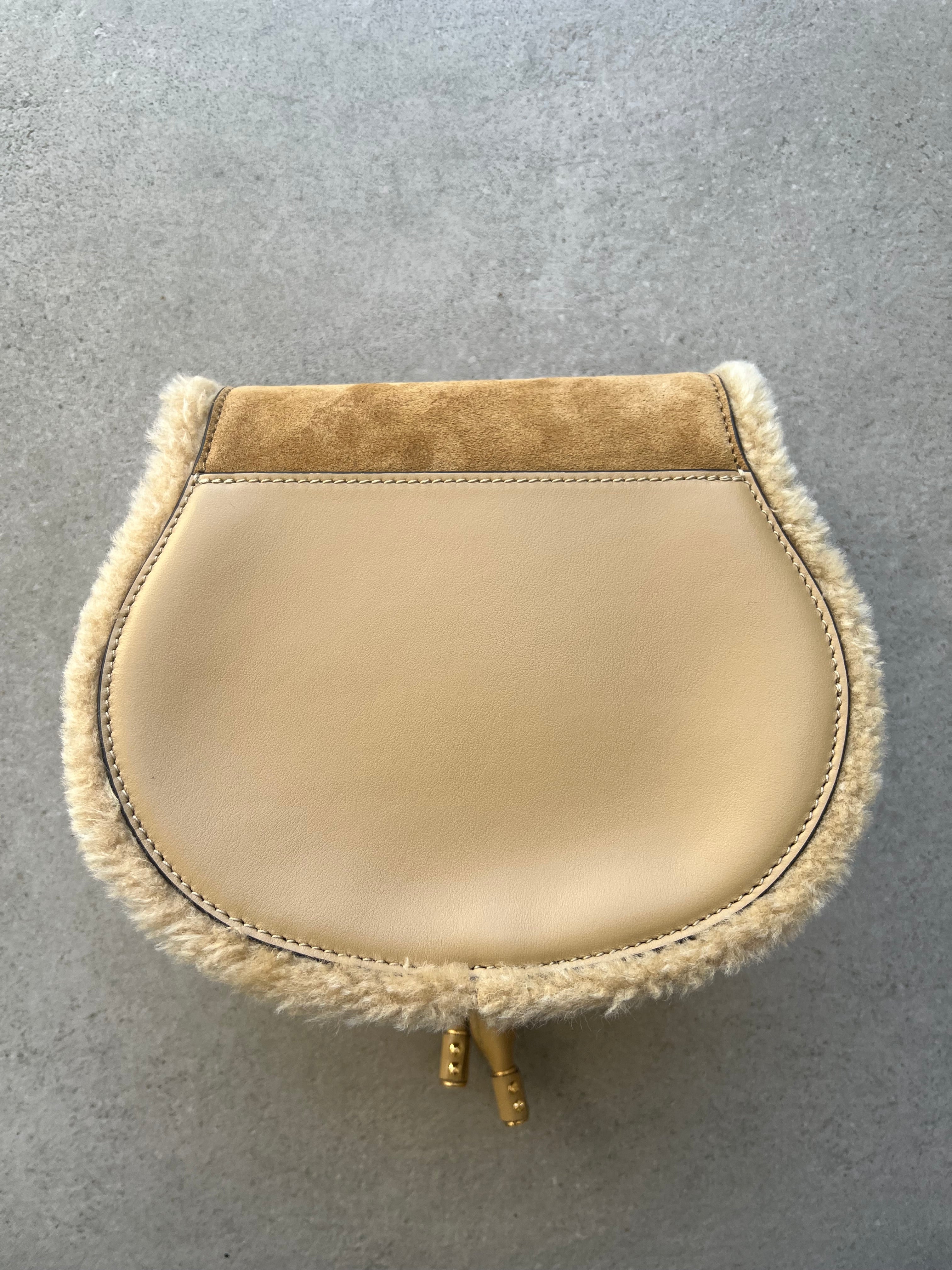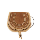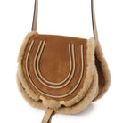 Crafted from suede calfskin with shearling trims, this small Marcie saddle bag pairs a rounded silhouette with a clean top line. The flap features the line's iconic saddle stitching, secured with signature dangling leather tassels.