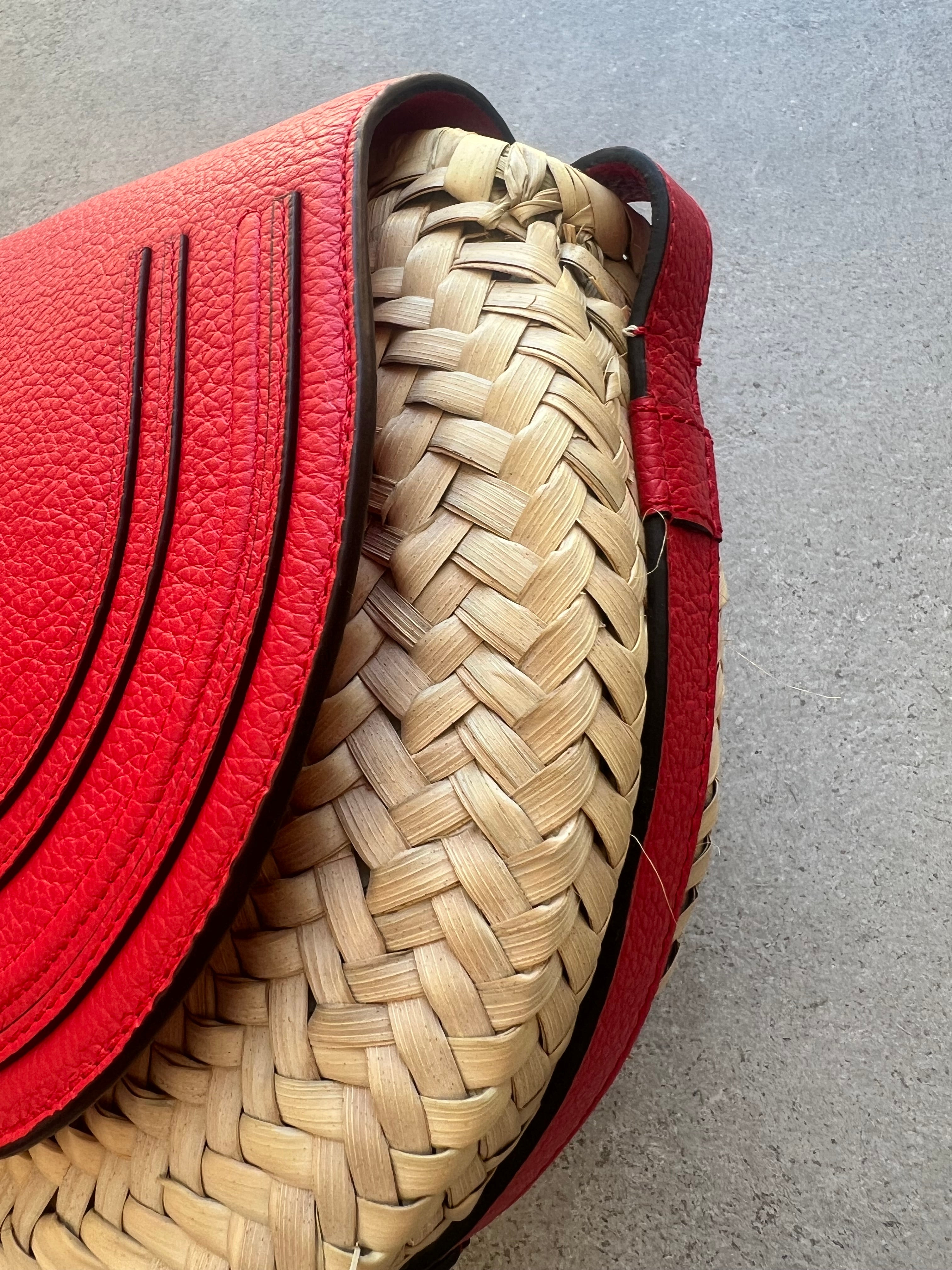 This basket bag has been carefully threaded with natural fibers by master artisans. Each piece has been carefully selected for its natural beauty. Any irregularities and color variations are inherent to this kind of natural fiber and a result of artisanal finishing. Protection from direct light, heat and rain is advised. Should the item become wet, dry it immediately with a soft cloth. Due to its slightly abrasive surface, we advise you to avoid contact with delicate materials. Avoid intense rubbing with abrasive materials. Fill the bag with tissue paper to help maintain its shape and store in the provided dust bag. Leather parts can be cleaned using a soft and dry cloth.