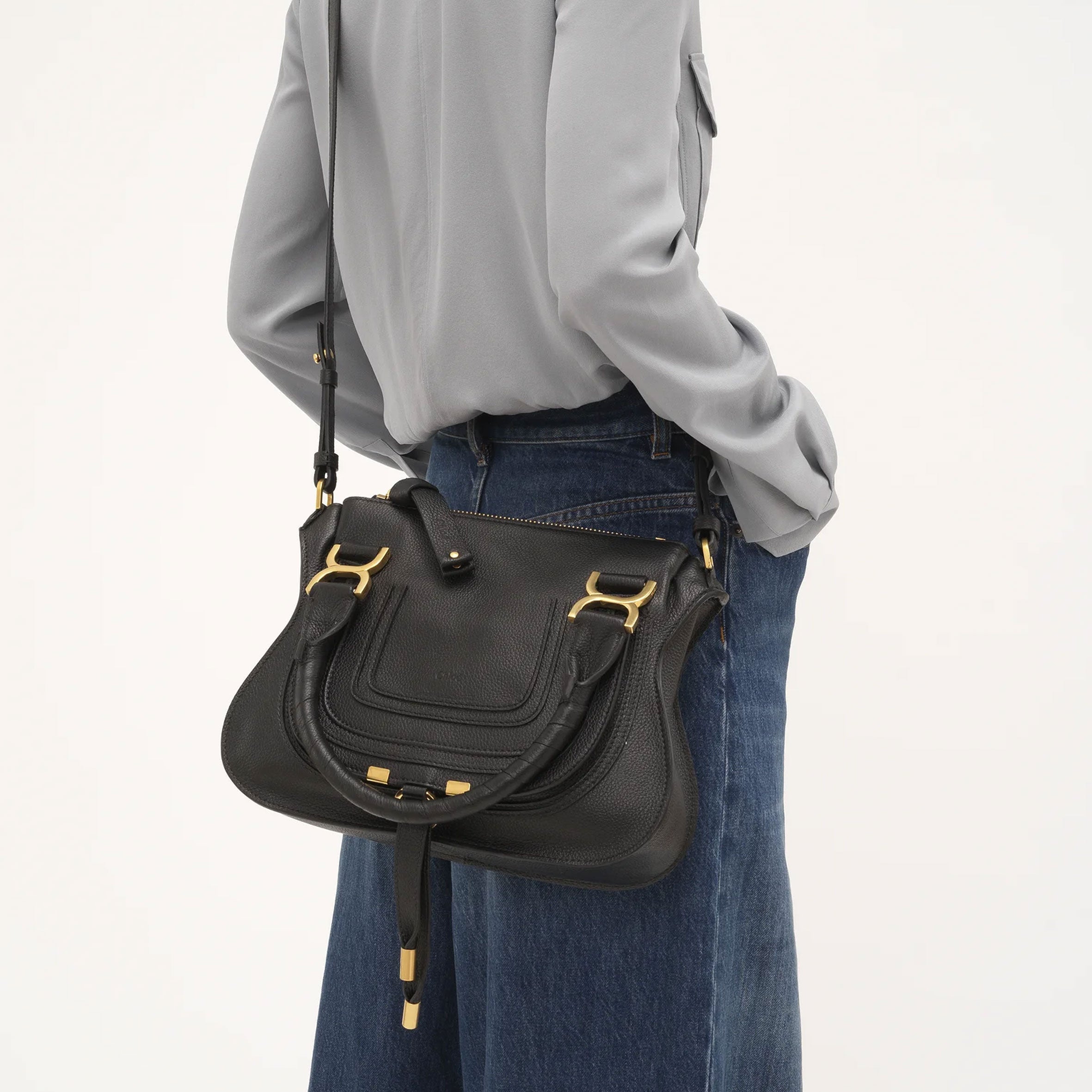 Small Marcie double carry bag in grain calfskin with antique brass hardware.