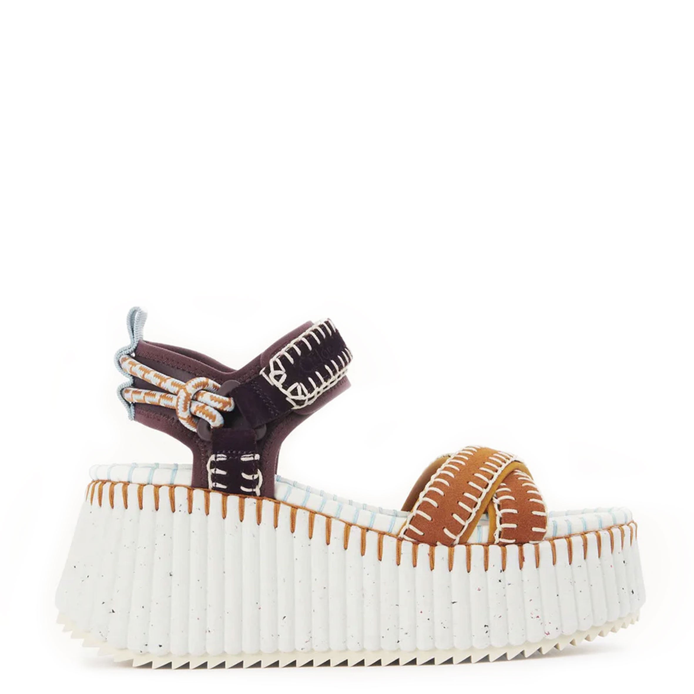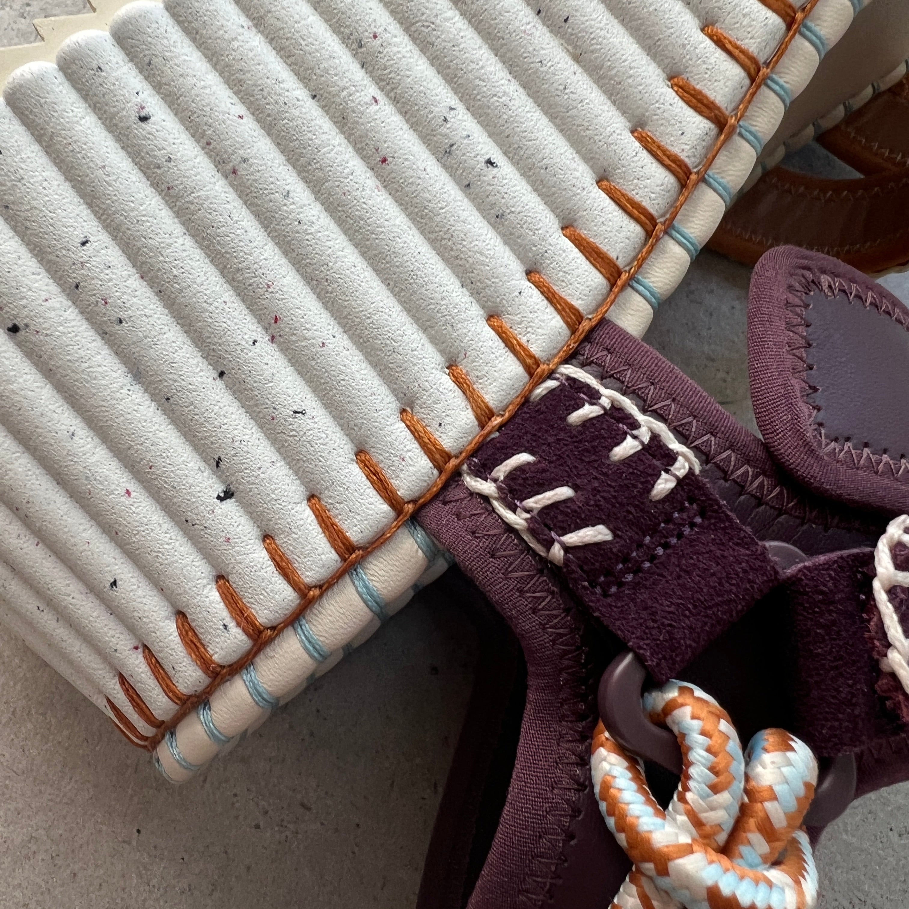 Bold and lightweight, the ultra-comfortable recycled platform sole has a ridged texture that is complemented by the line's distinctive hand-stitching. The suede calfskin upper matches criss-cross front straps with an adjustable ankle strap and a sporty back loop, along with tonal laces tied in nautical knots.