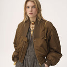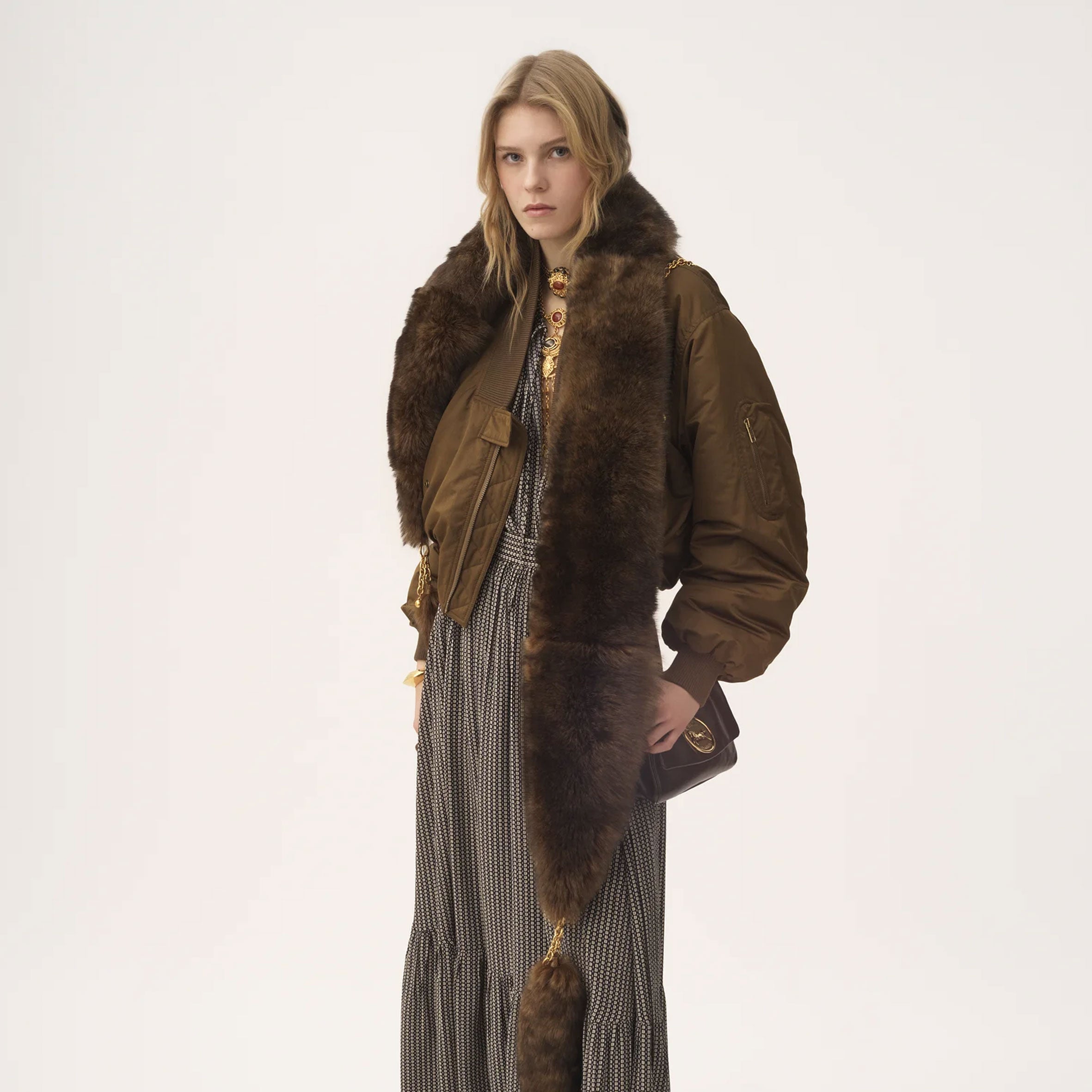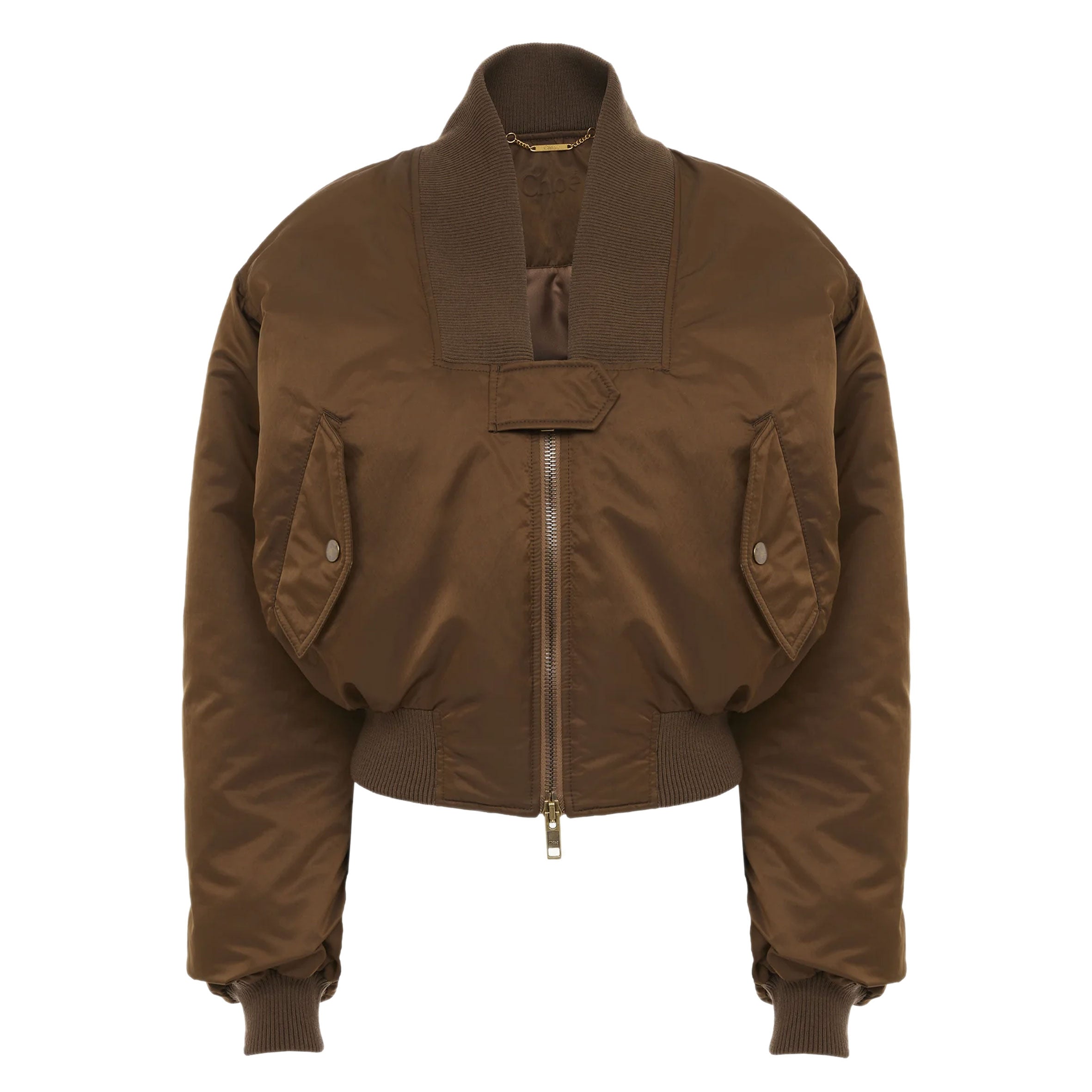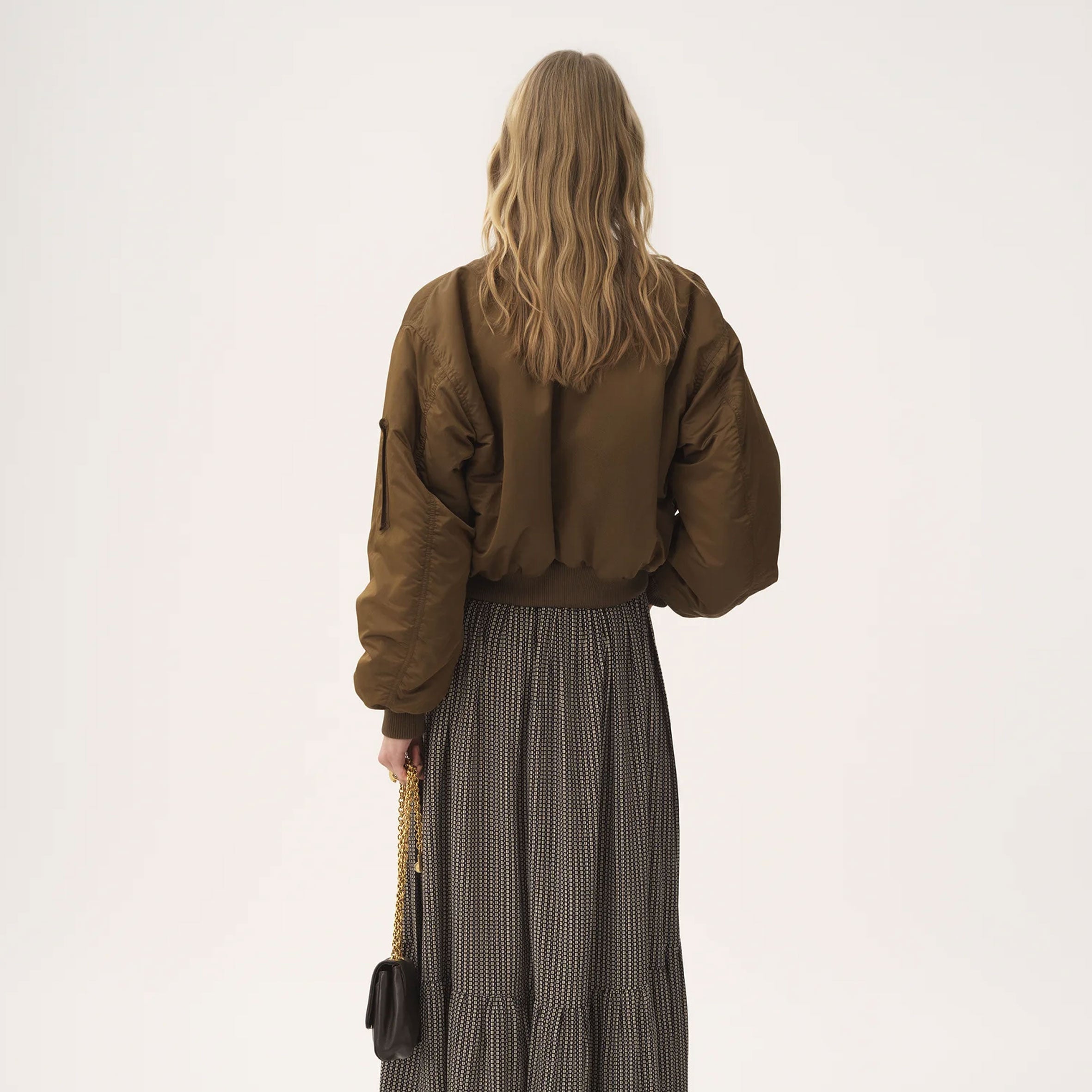 Bomber jacket in nylon with contrast ribbed trims at the maxi collar, waist and cuffs. Snap-button flap pockets and a zippered sleeve pocket finish this piece.