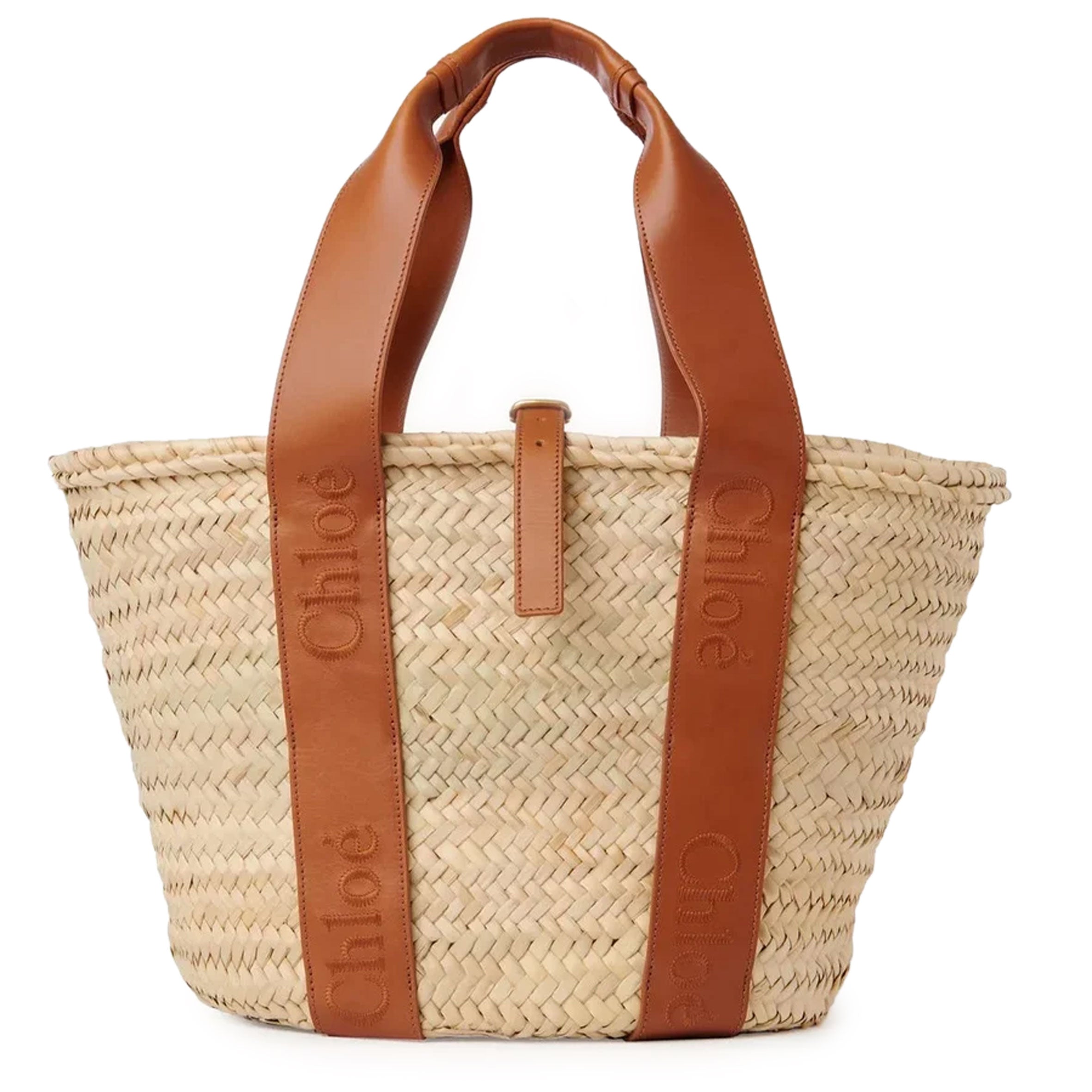 Encapsulating a carefree summer attitude, this Chloé Sense small basket is a compact accessory crafted from handbraided raffia. Smooth calfskin strips and comfortable handles add luxurious contrast, while the Chloé logo embroidery lends a signature finish. A leather link closure secures the open top.