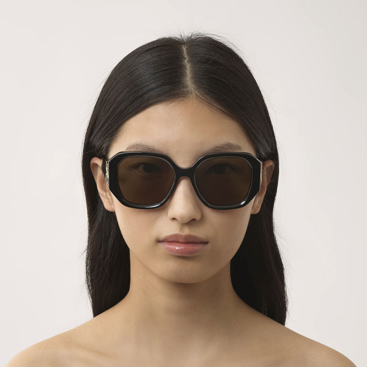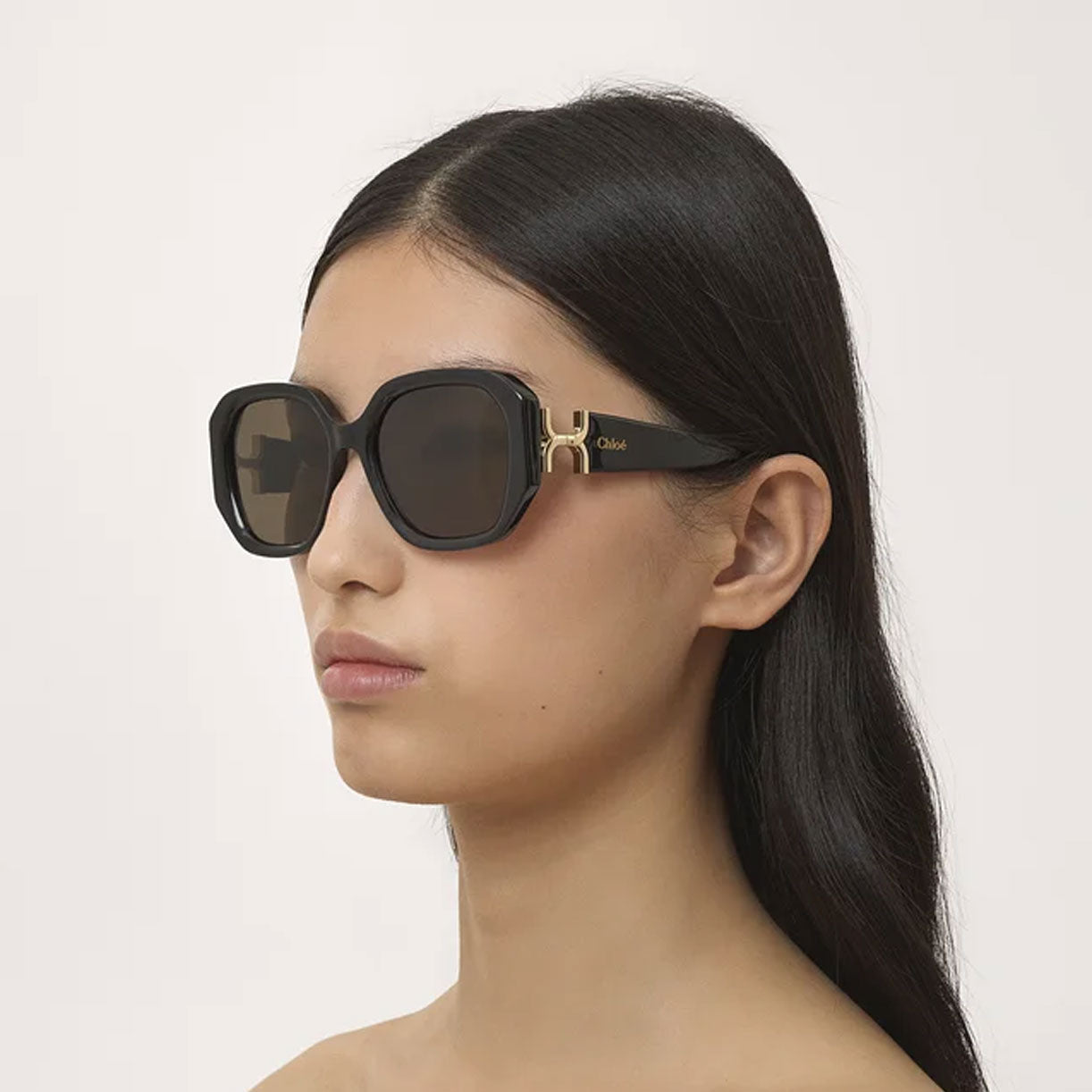 Round recycled acetate frame in black with Marcie temple and brown lens. Chloé logo engraved on the left temple