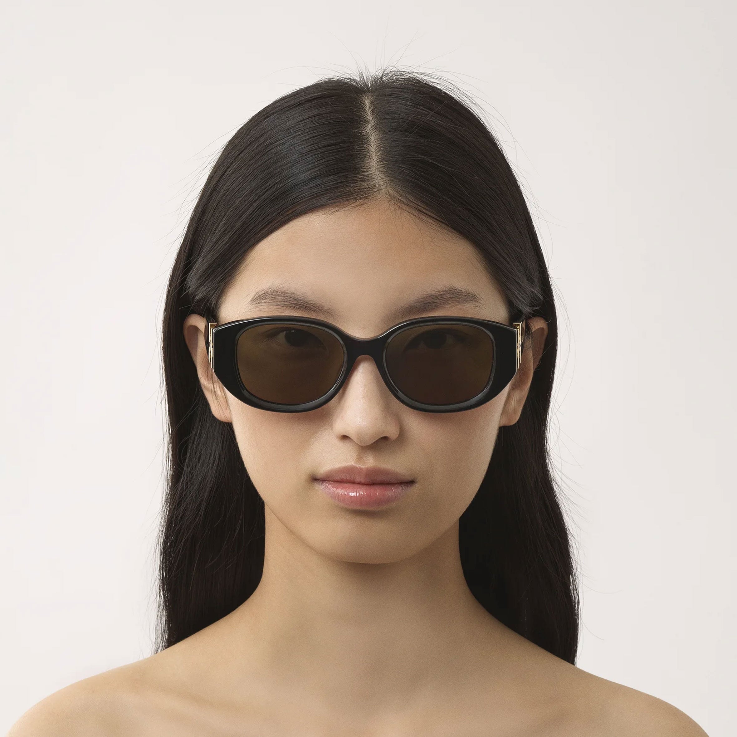 Rectangle recycled acetate frame in black with Marcie temple and brown lens.
