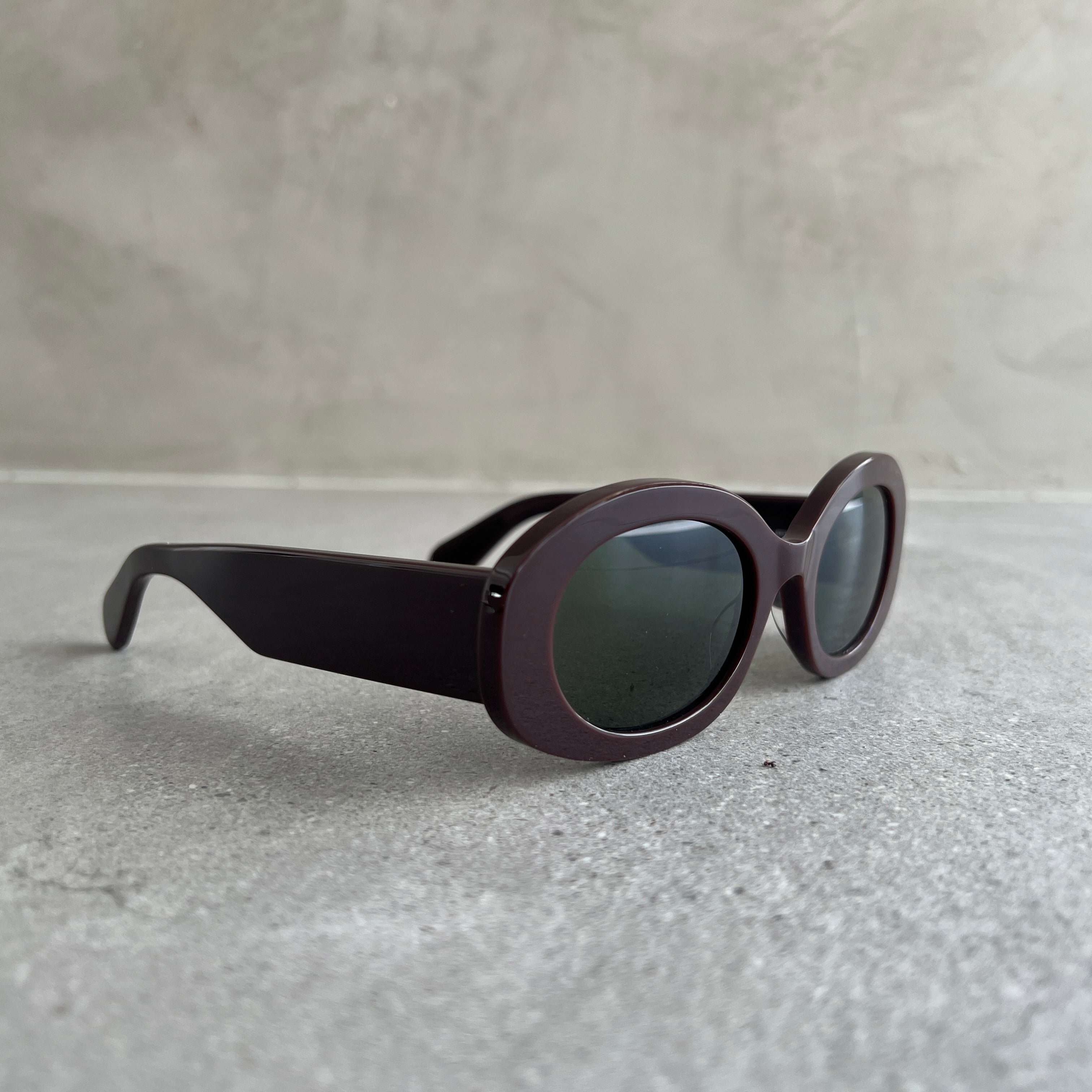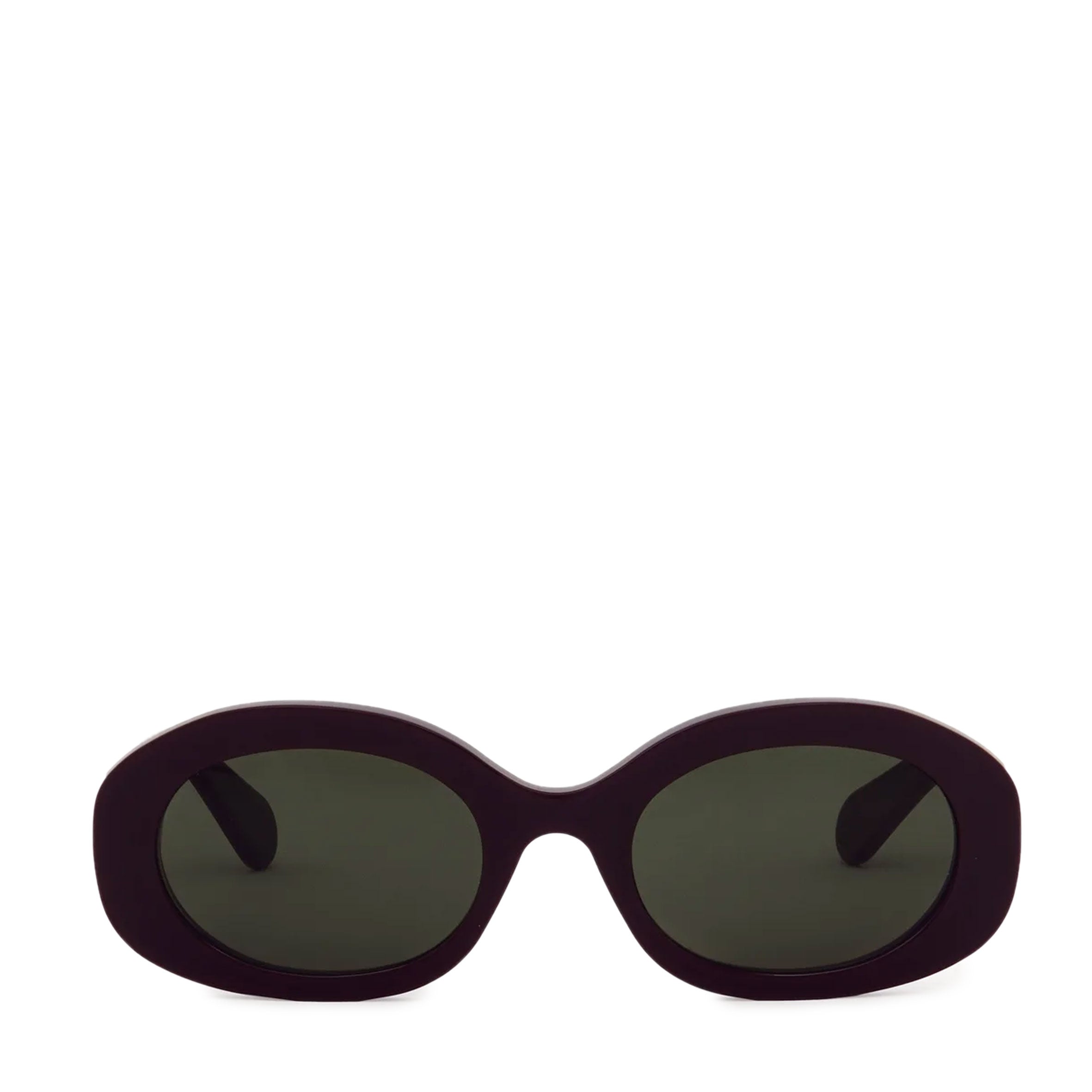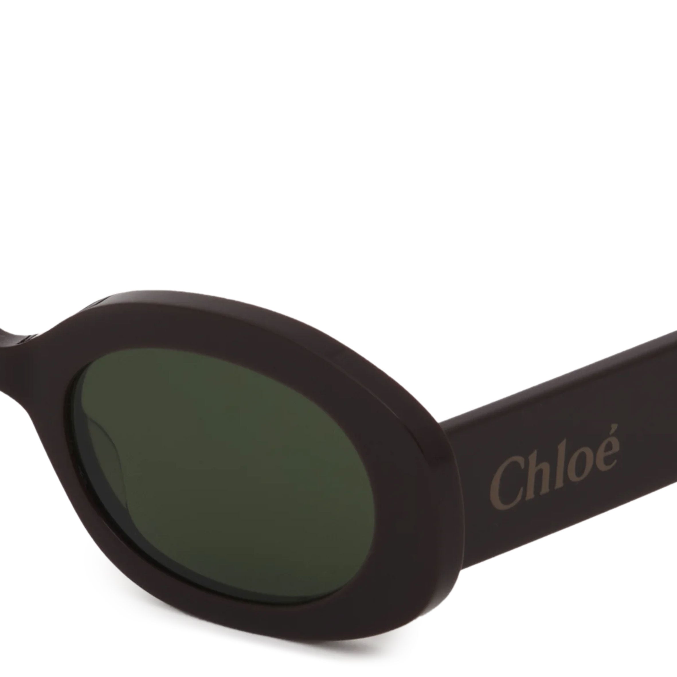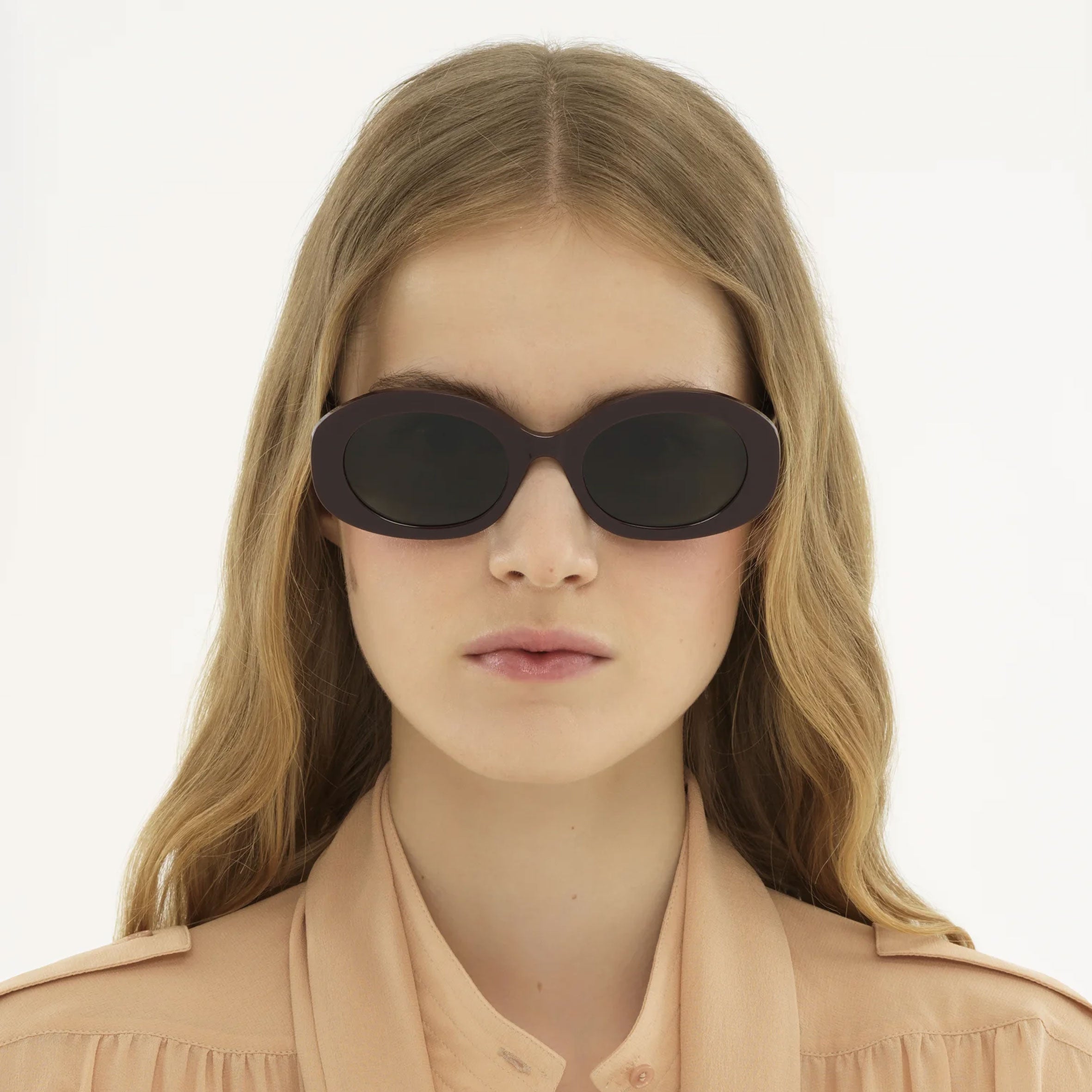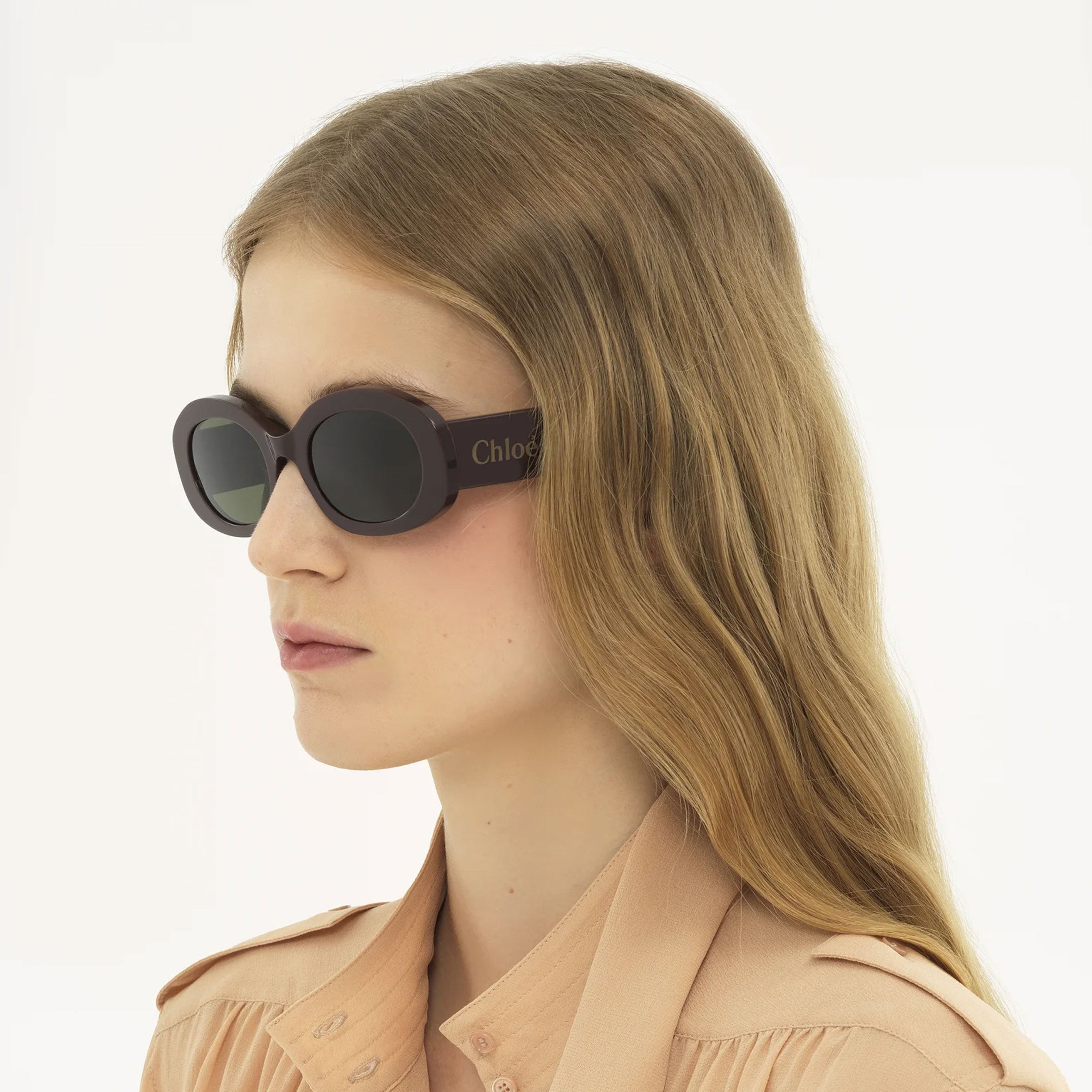 These Naomy sunglasses make a bold, modern statement. Oval shape the shiny burgundy frame is crafted from lower-impact acetate, featuring extra-large temples stamped with a big contrasting Chloé logo on the left.