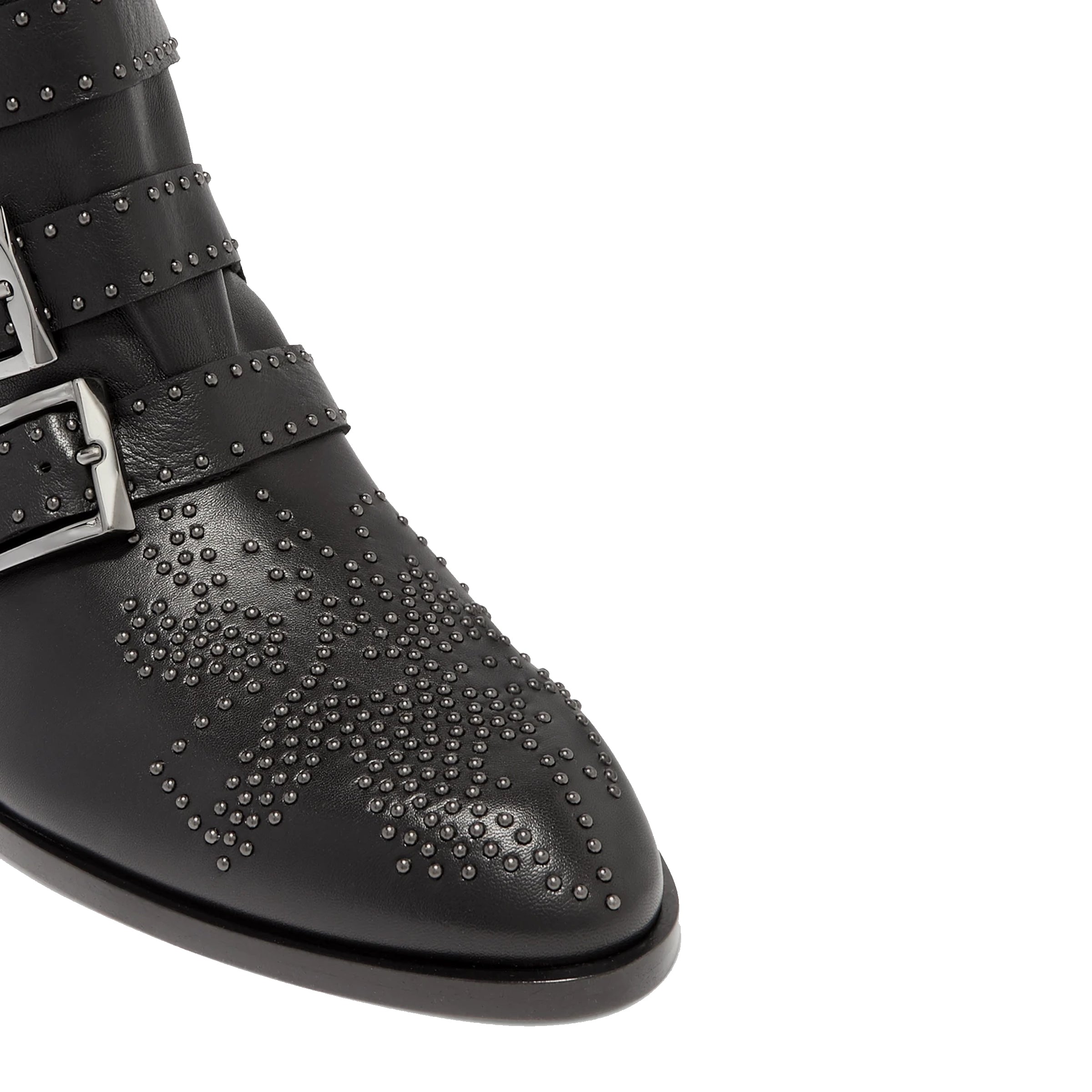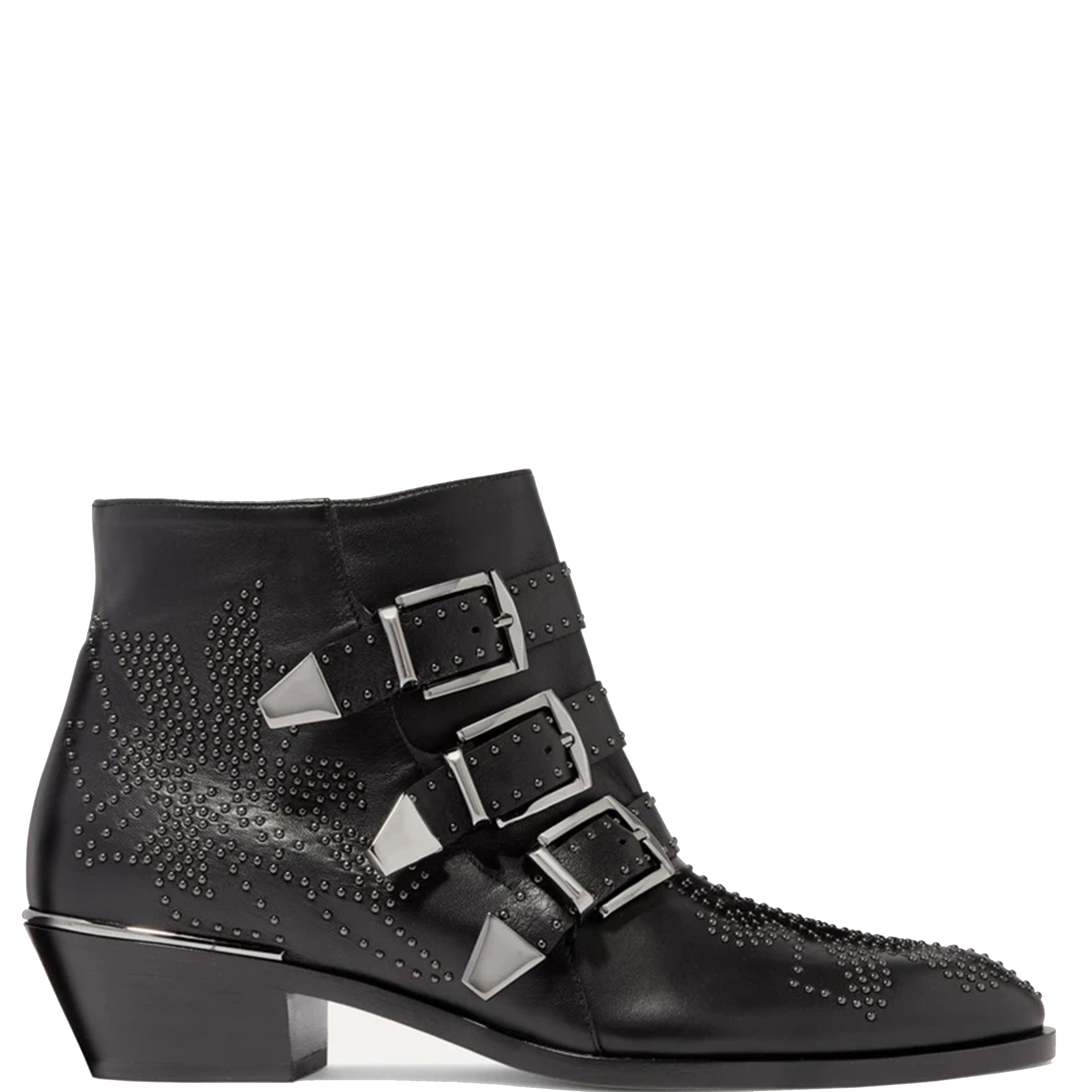 The statement Susanna Boots have a trio of buckled straps and elongated cowboy toe shape, and has a cool Western feel and sharp, yet feminine silhouette. Vintage metal pieces and gunmetal studs in the Maison's own emblematic floral pattern pair with a strong Cuban heel and thick masculine sole. Zip on the side for easy wear.