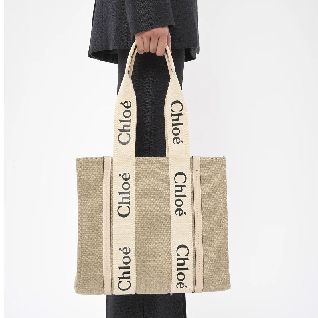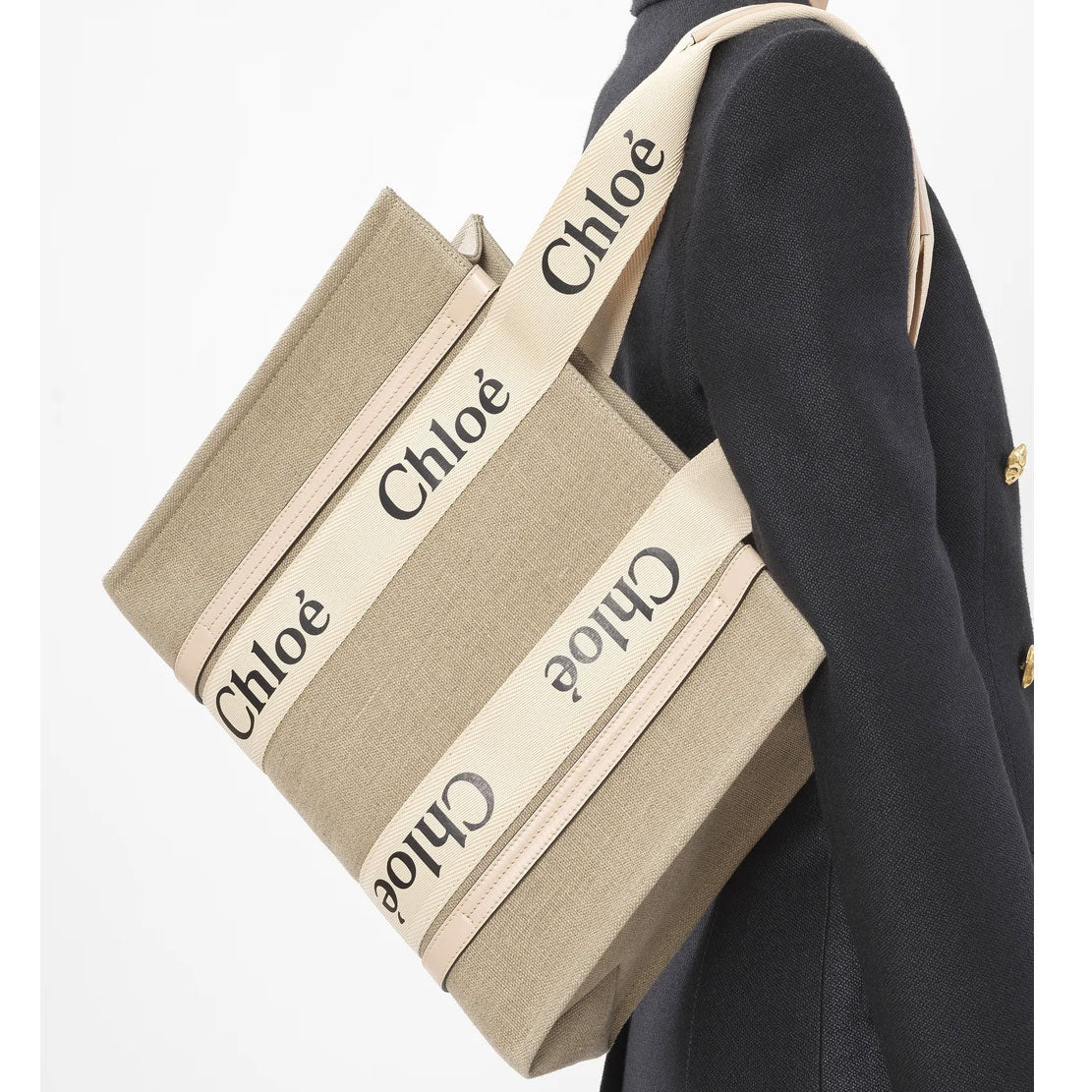 The bag's sharp, modern lines are emphasized by the contrasting vertical leather strips and the signature Chloé logo ribbon carried over from the Maison's Woody mule. Carry this tote bag comfortably on the shoulder. Can fit A4 format.