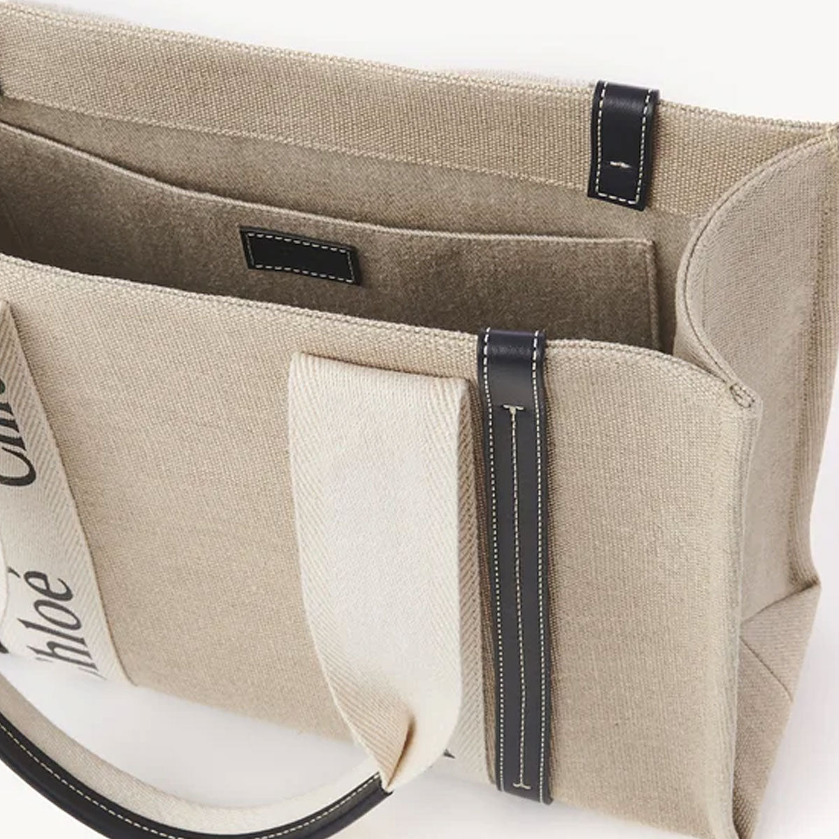 Crafted from subtly speckled cotton canvas detailed with shiny calfskin strips, this medium Woody tote bag is a spacious day-to-evening bag with a strong summer attitude. The roomy inside compartment includes a practical flat pocket.