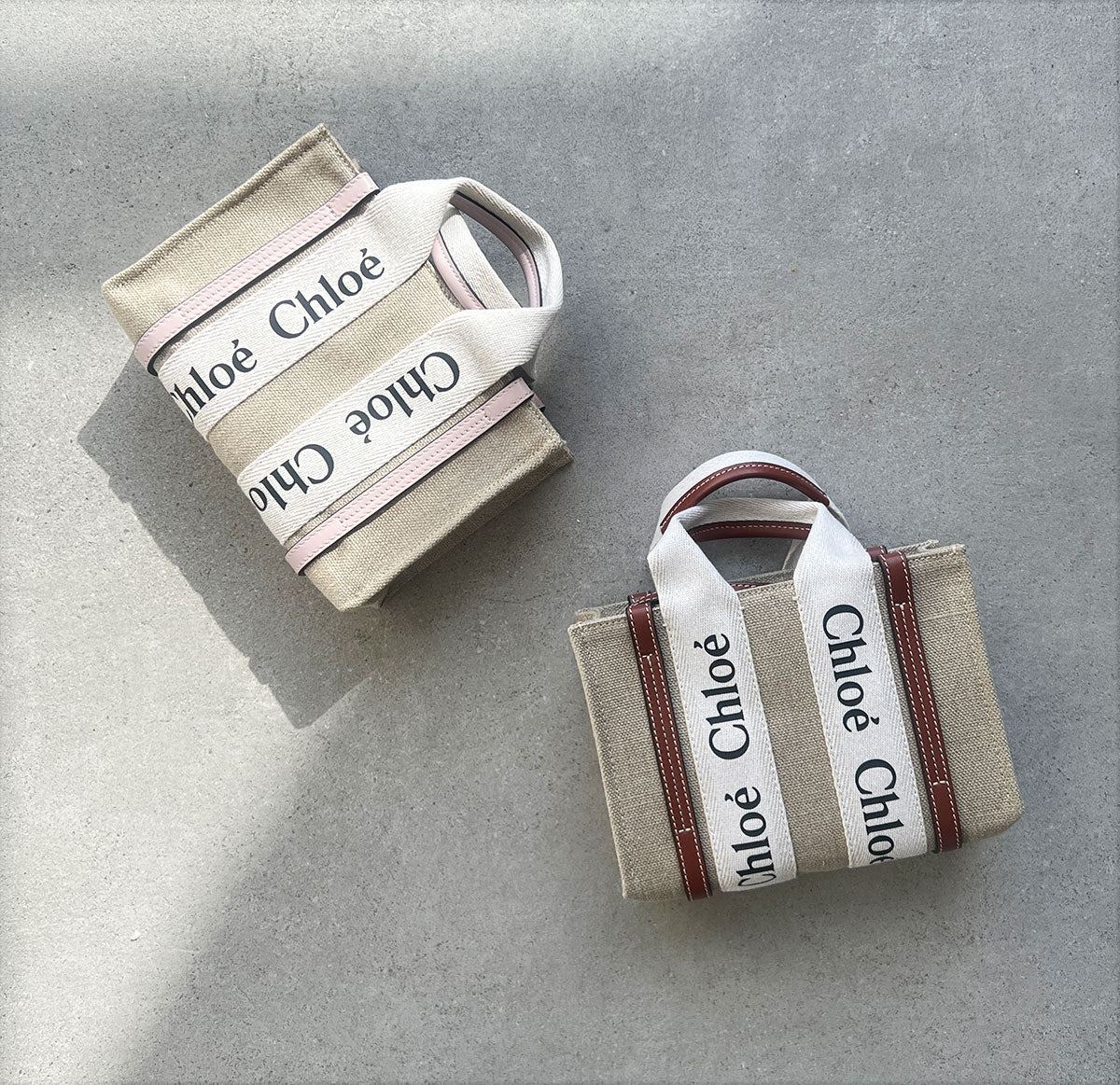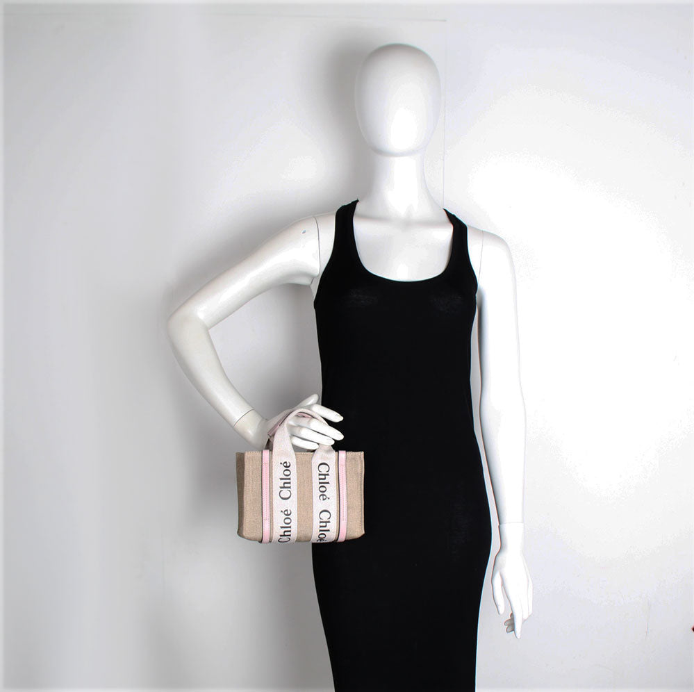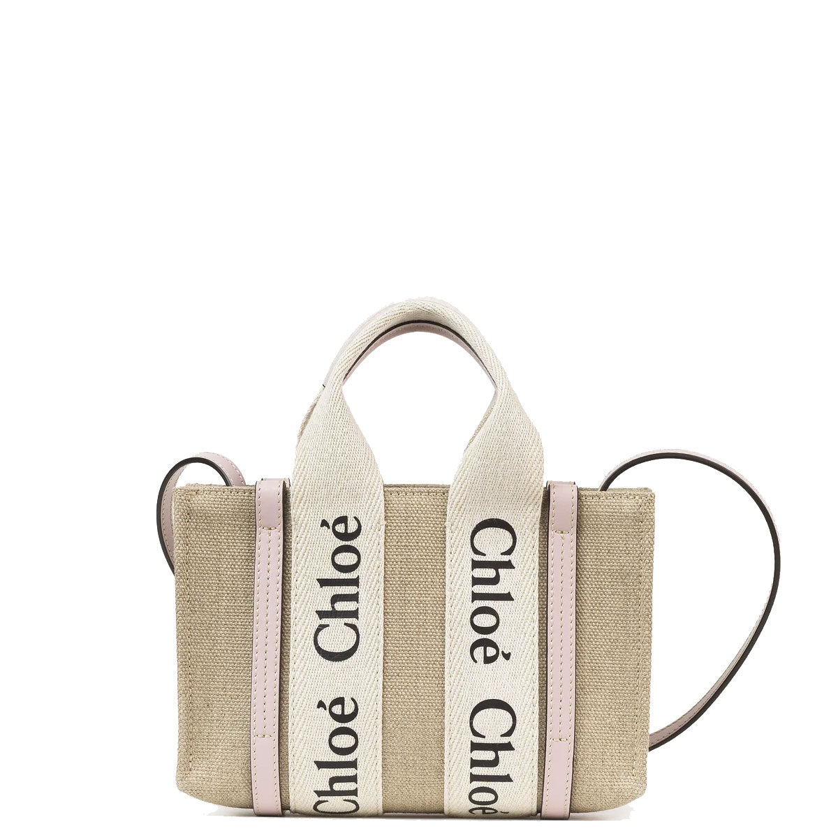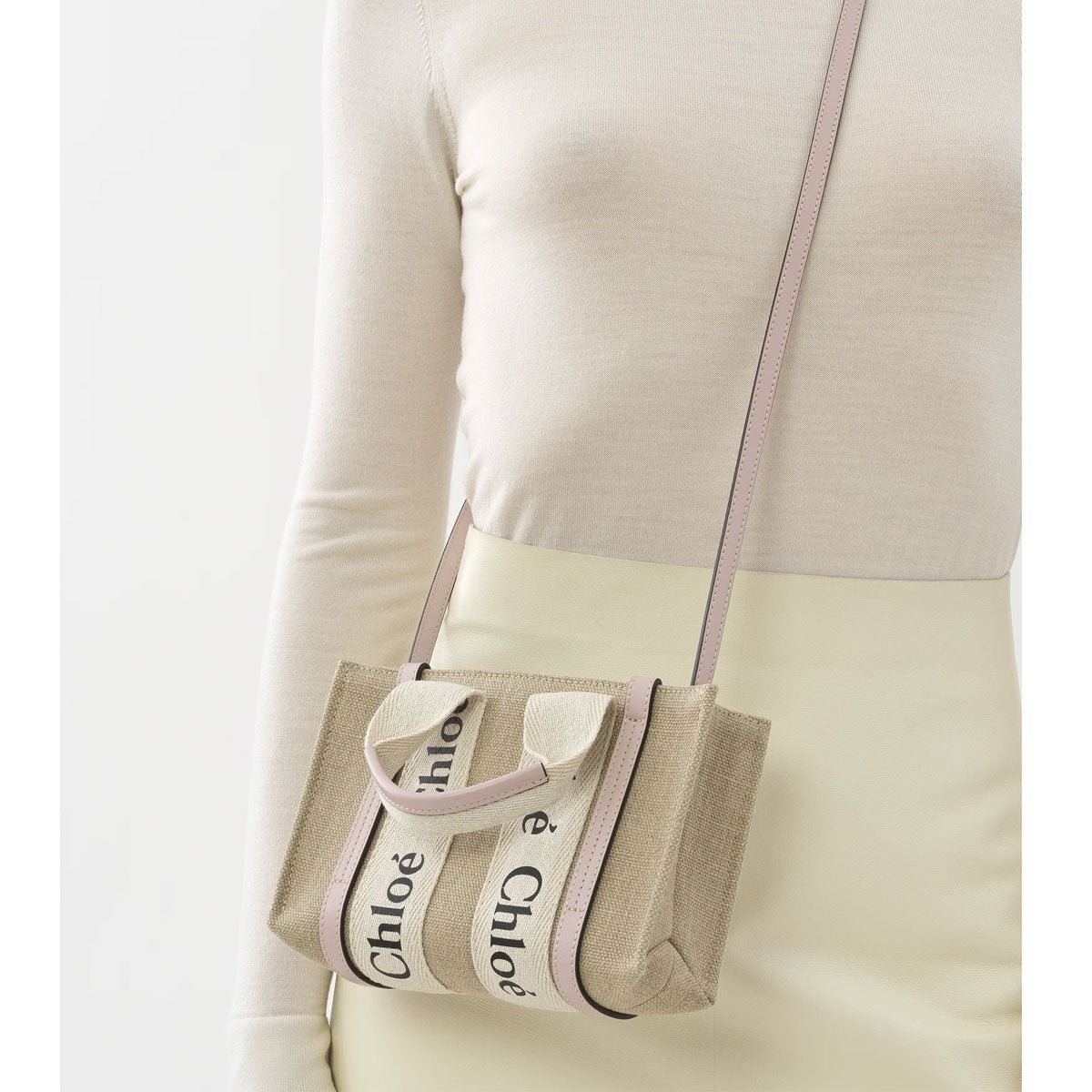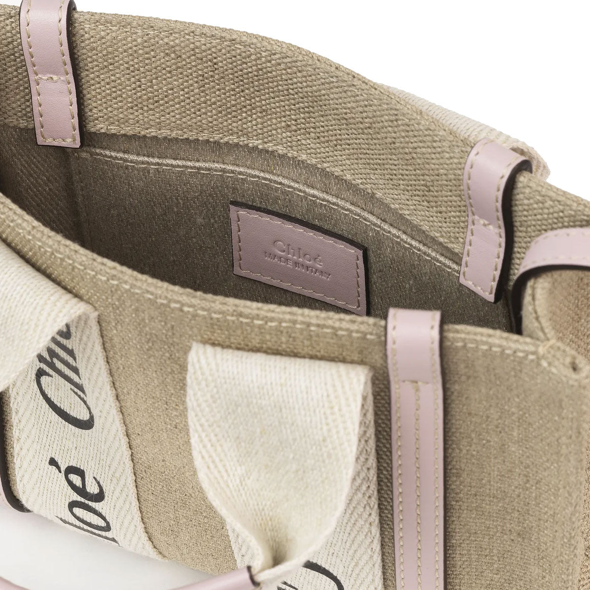 Crafted from linen canvas detailed with shiny calfskin strips, this mini Woody tote bag is a compact day to evening bag. The inside compartment fits a mobile phone.