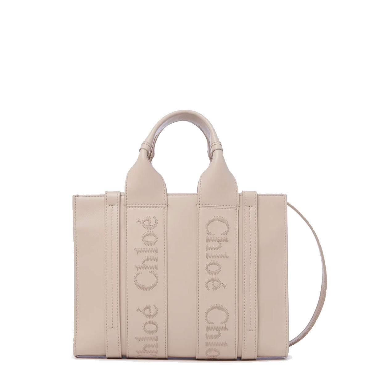 The Woody line is characterized by the signature Chloé logo carried over from the Maison's iconic mules. It showcases a modern, minimalist silhouette ranging from nano to large sizes.