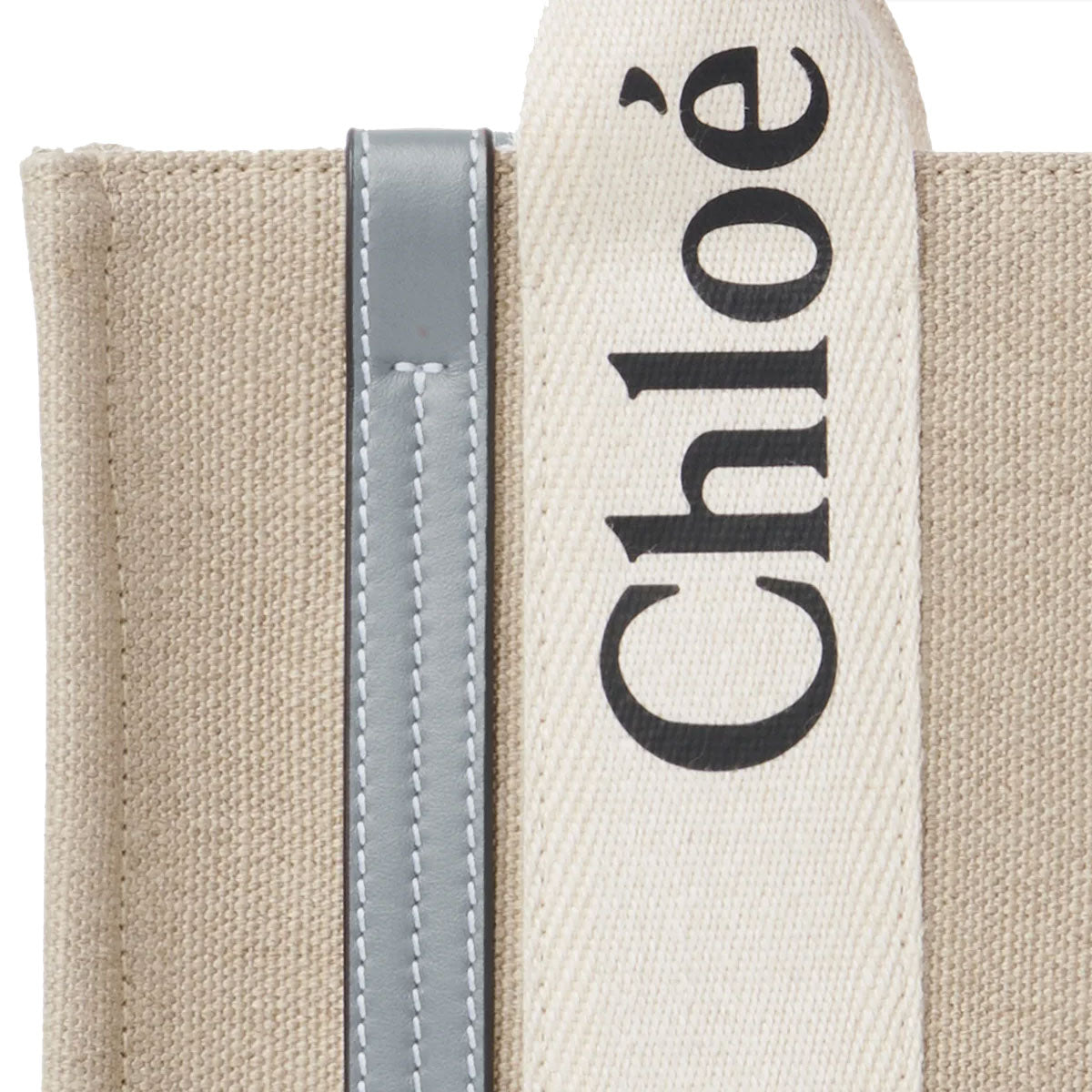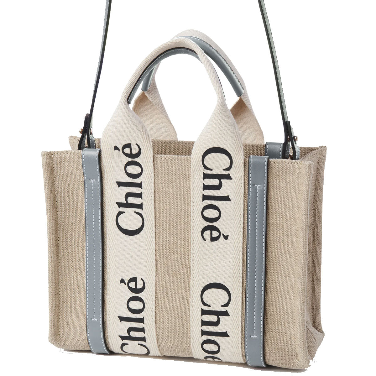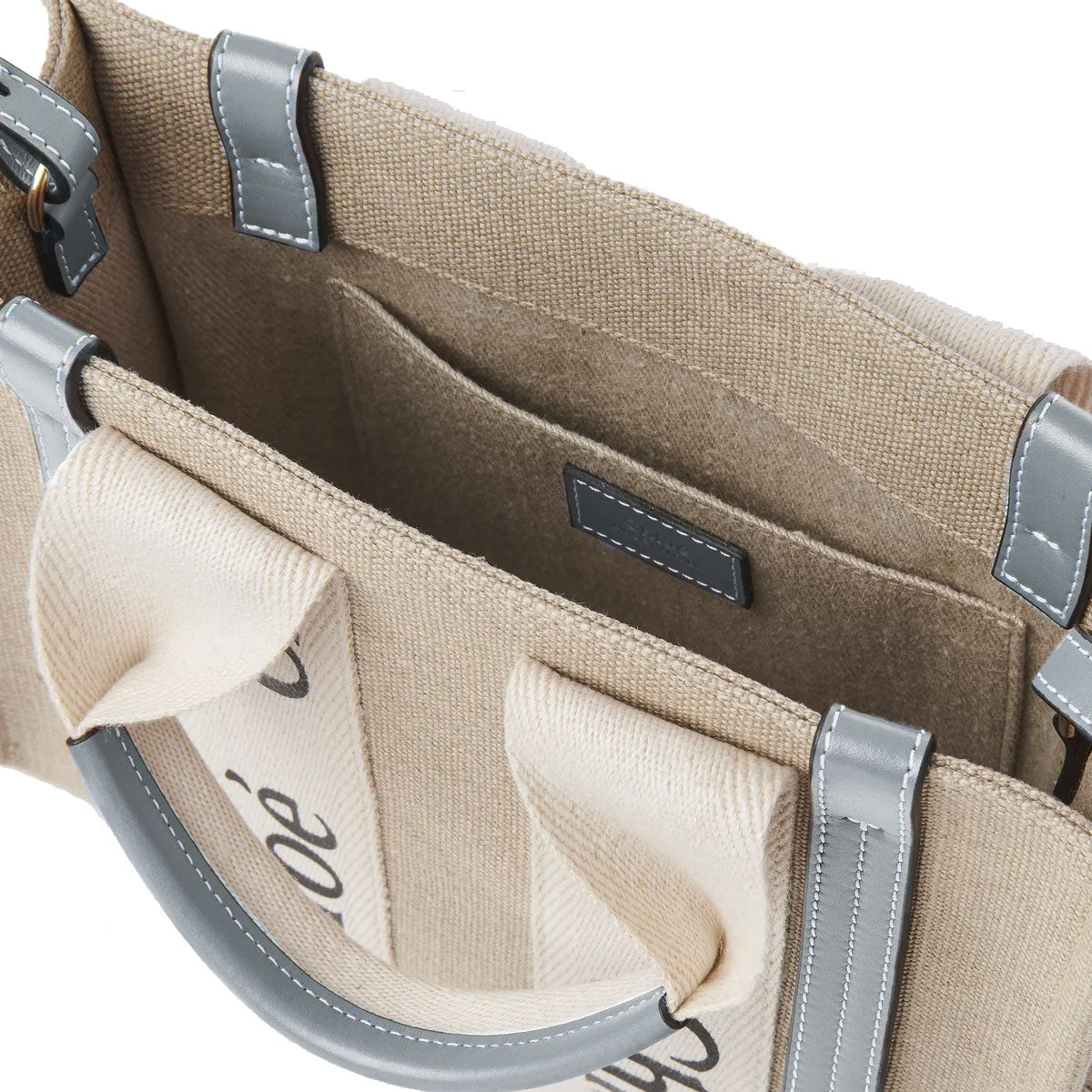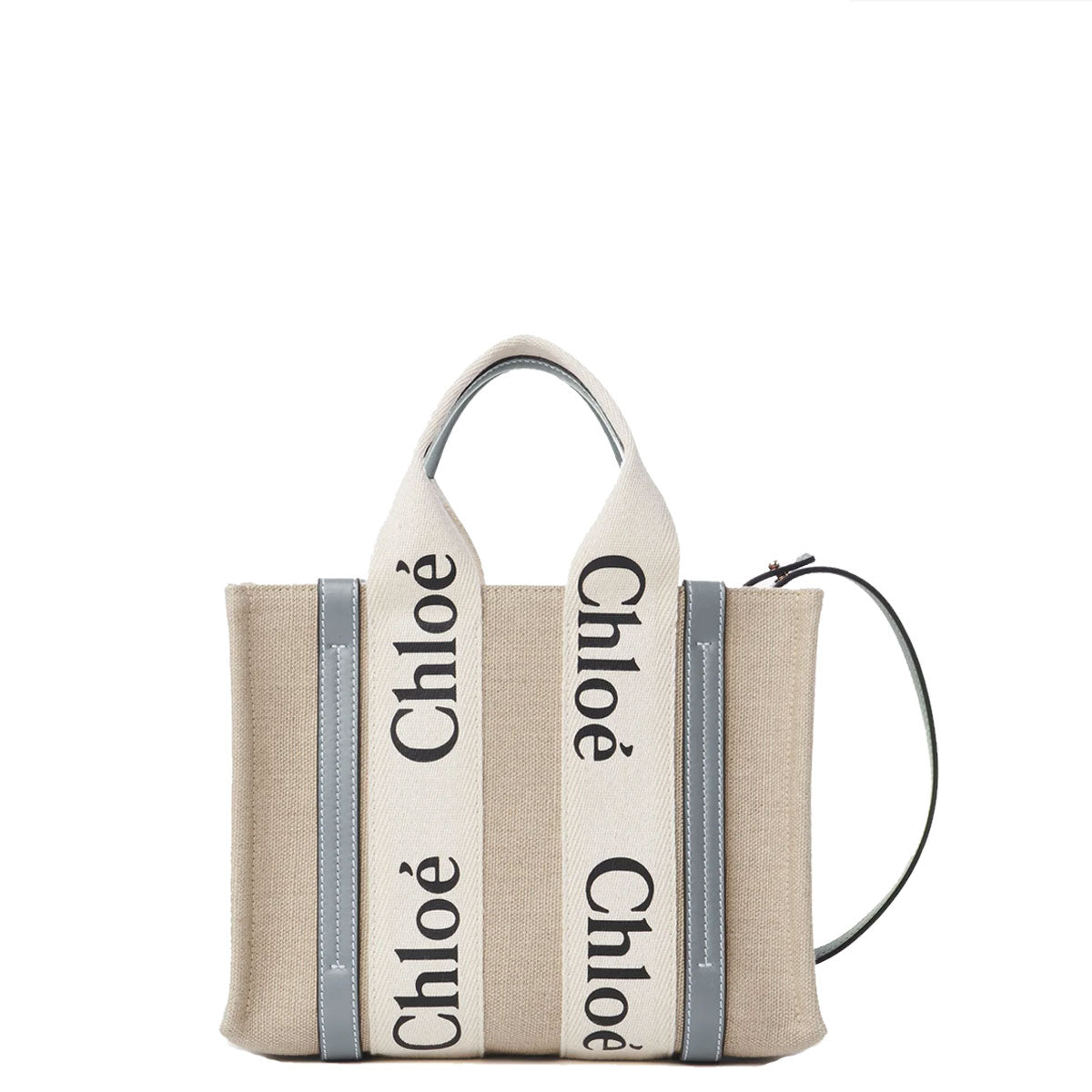 Crafted from Linen canvas detailed with shiny calfskin strips, this small Woody tote bag is a compact bag with a long, removable strap and a strong summer attitude. The roomy inside compartment includes a practical flat pocket.