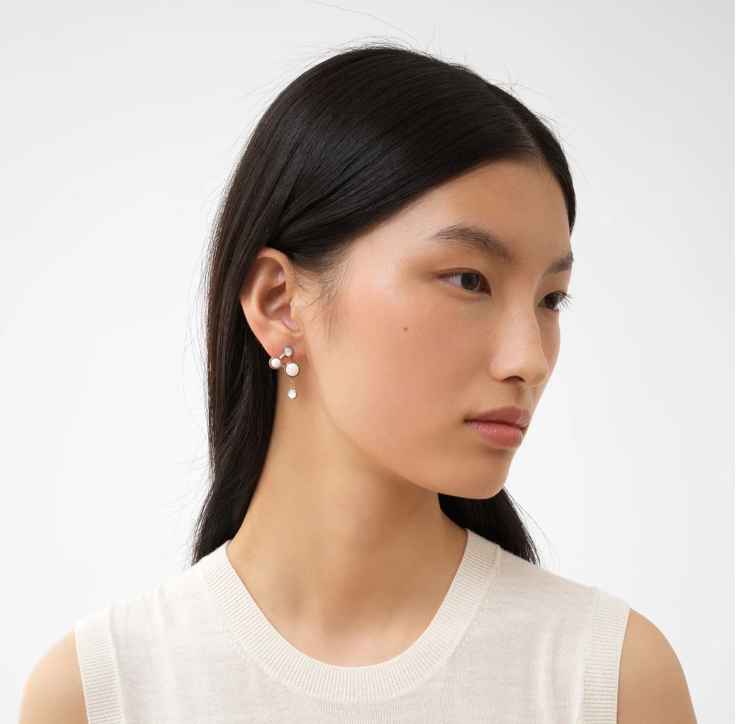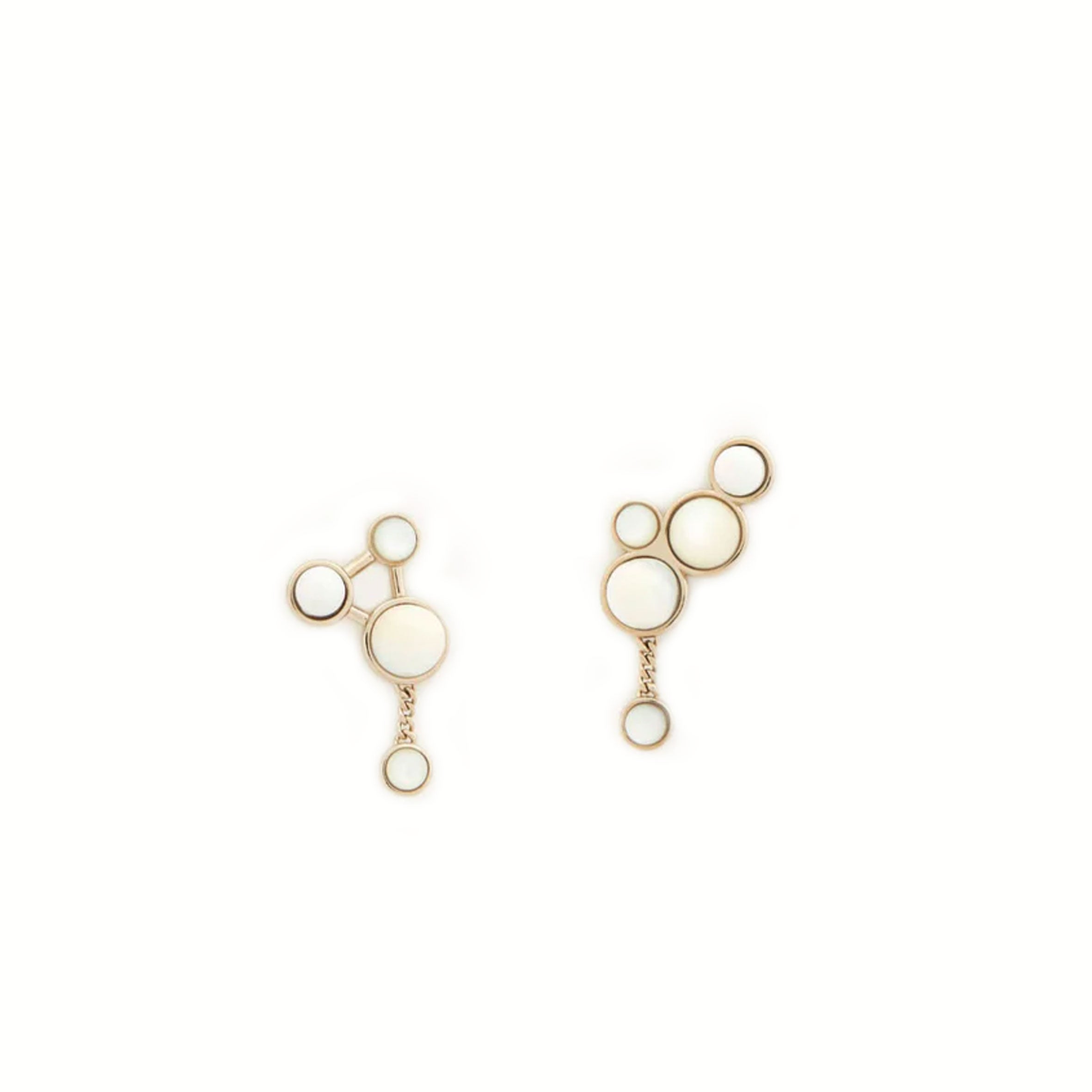 Set in gold brass, these sculptural earrings interpret the Gemini constellation in natural pearl and agate. Mix and match them with the Zodiac collection rings to create your own unique constellation.