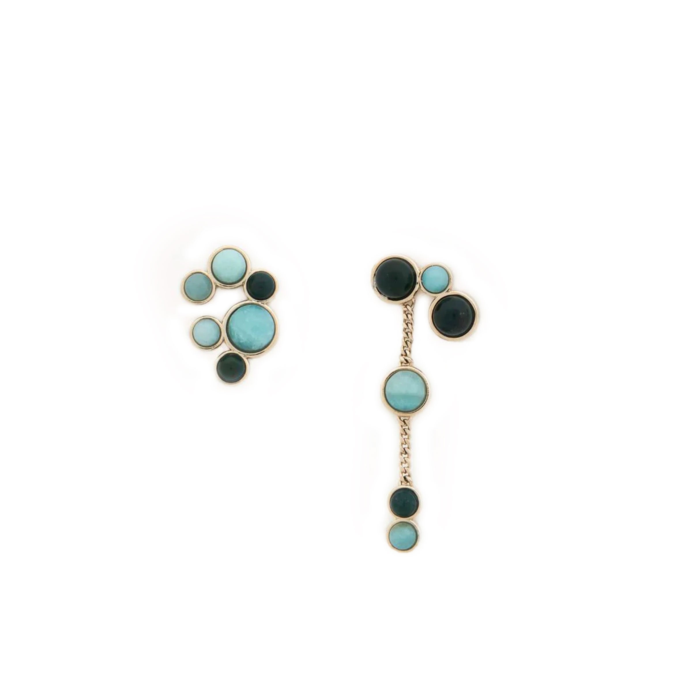 Set in gold brass, these sculptural earrings interpret the Pisces constellation in bloodstone & amazonite. Mix and match them with the Zodiac collection rings to create your own unique constellation.