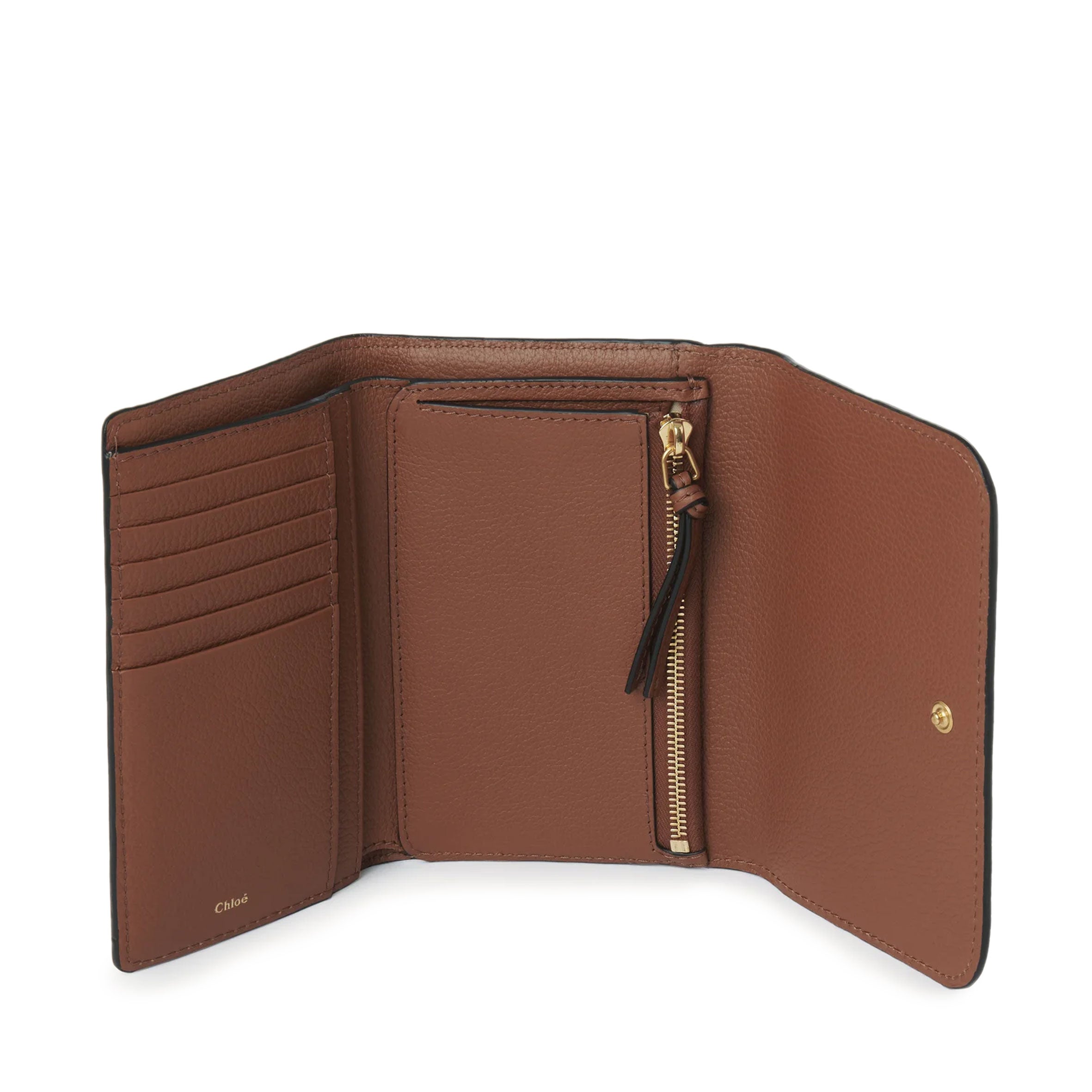 The Maison's iconic Marcie line is updated with this Marcie medium compact wallet, crafted from Chloé's signature soft, grained calfskin. A practical accessory, it has multiple compartments. The distinctive metallic piece adds bold hardware linked to the 70s-inspired Marcie bag, while the subtle embossed Chloé logo lends a finishing touch.