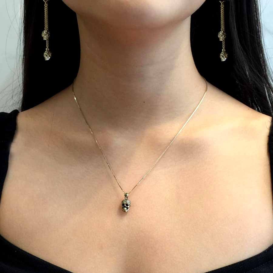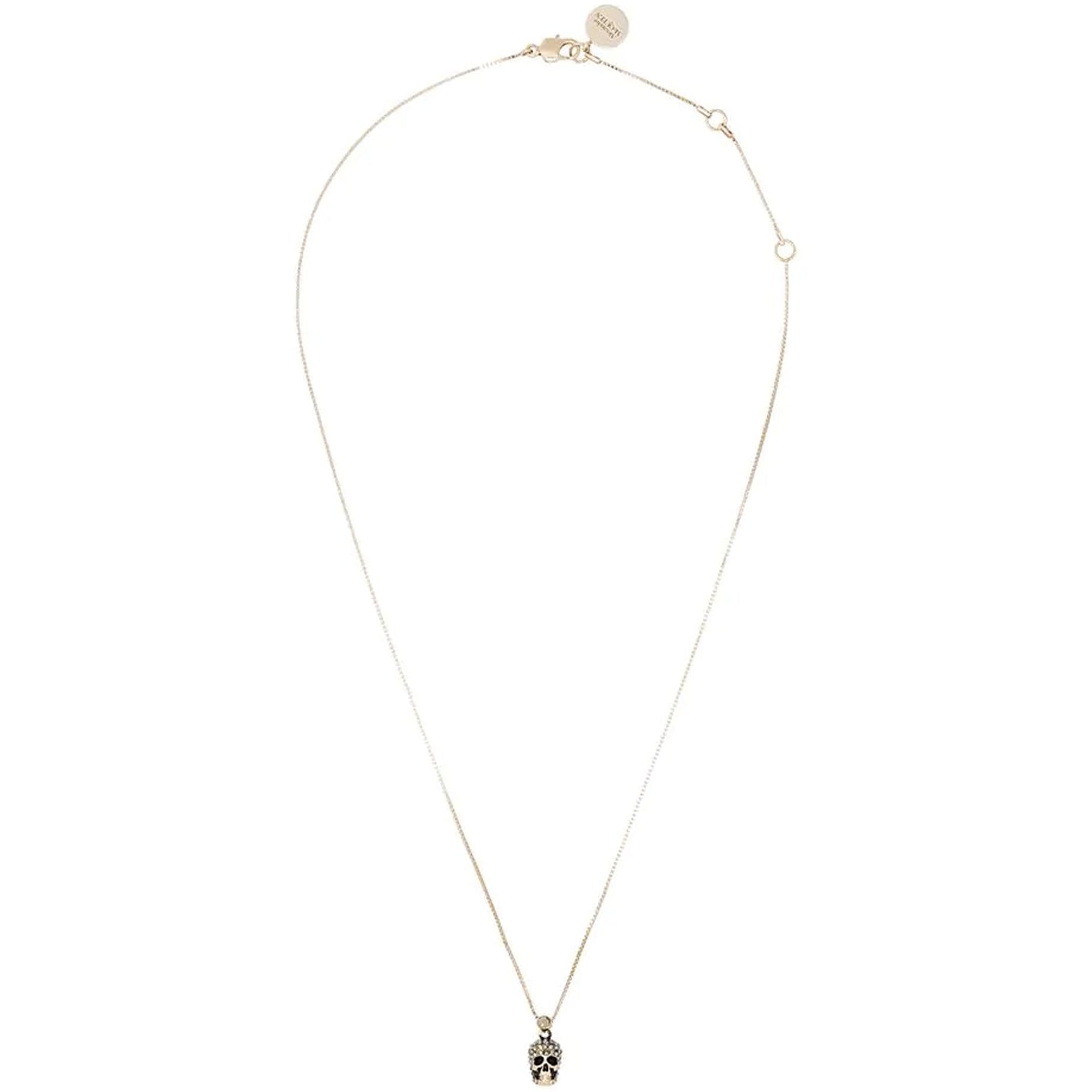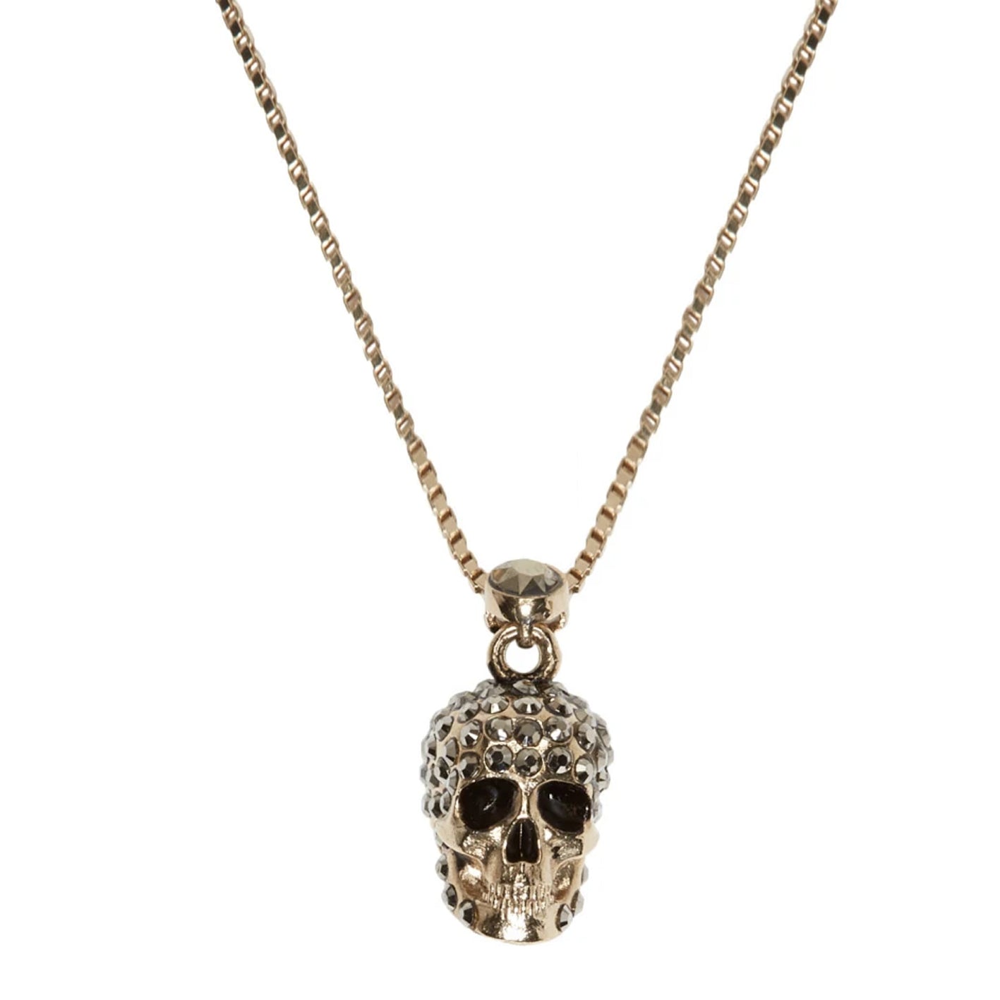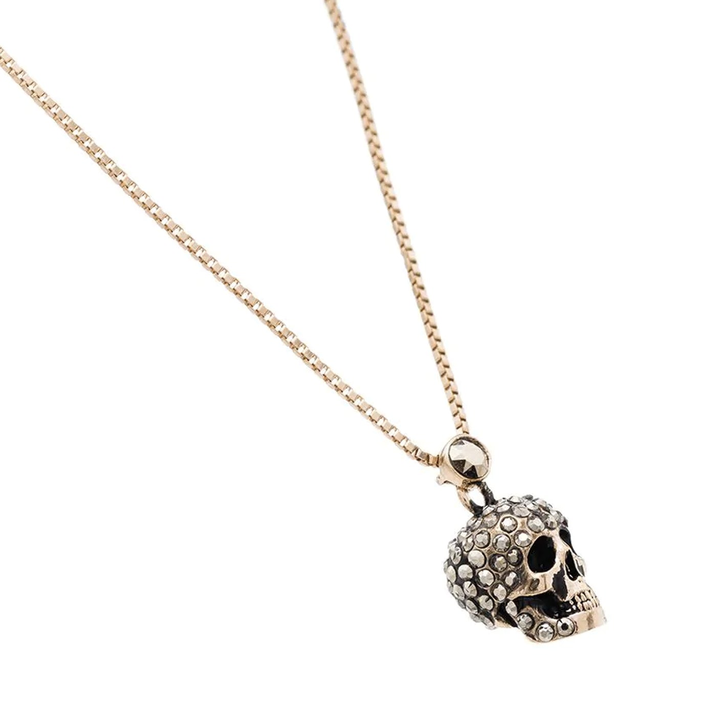 Skull pendant necklace from Alexander McQueen, with a signature coin on the clasp fastening, a delicate chain, engraved logo charm, and crystal accents.