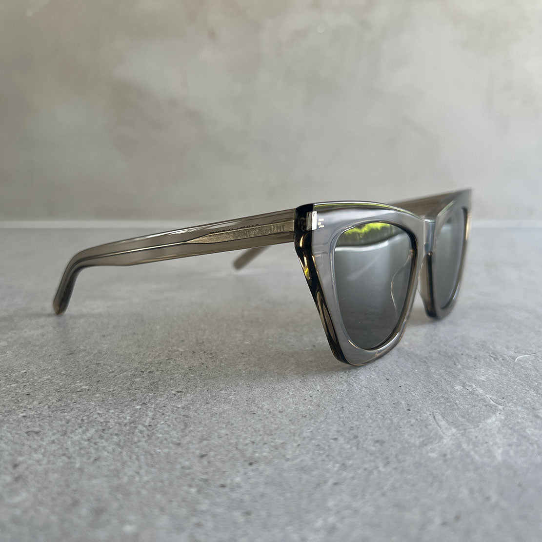 Thick-framed clear cat eye sunglasses featuring nylon lenses. Saint Laurent signature engraved arms. Frames are compatible with prescription lenses.