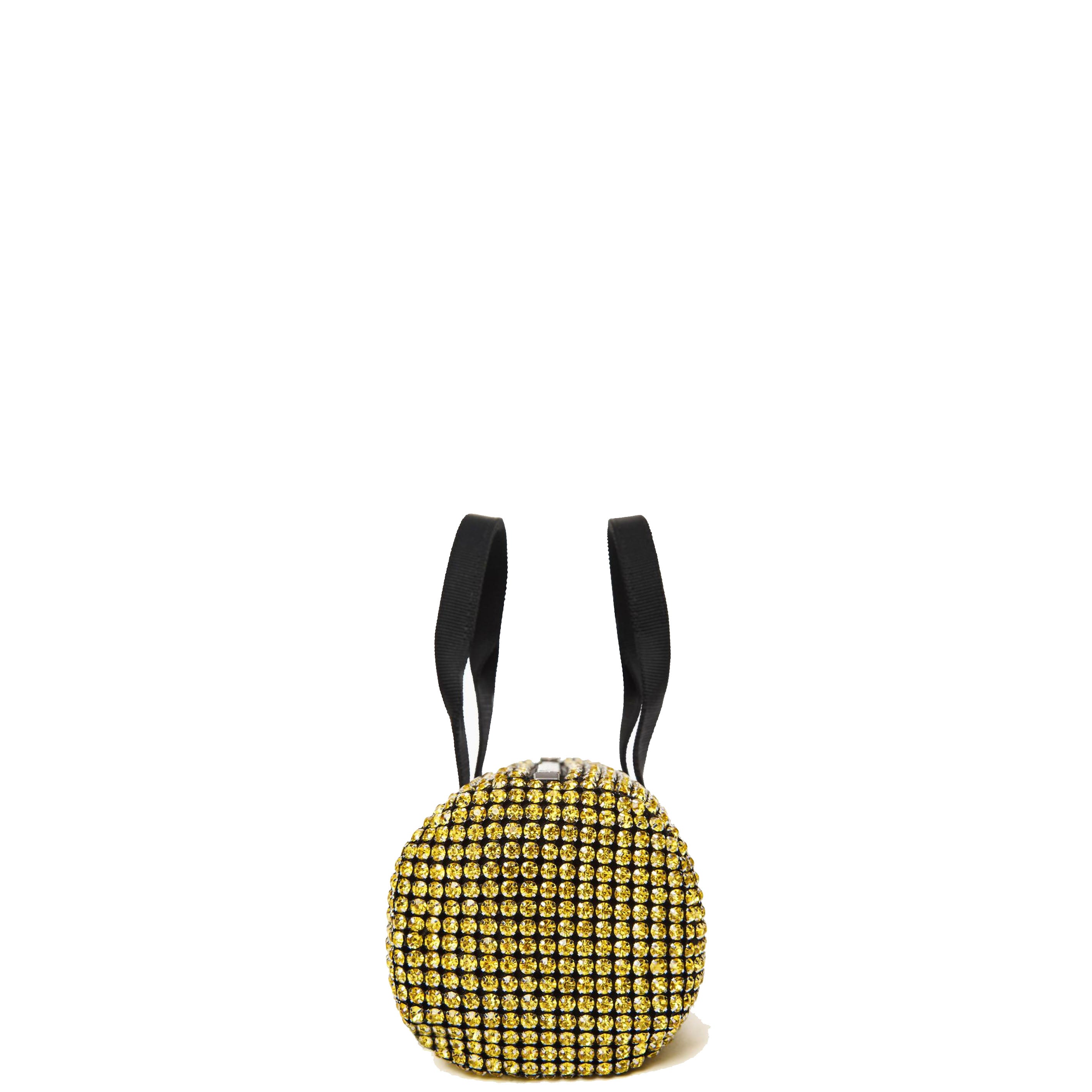An all over crystal embellished mini duffel with webbed nylon top handles and logo flag tag. Features a metal top zip closure and polyester jacquard logo lining.