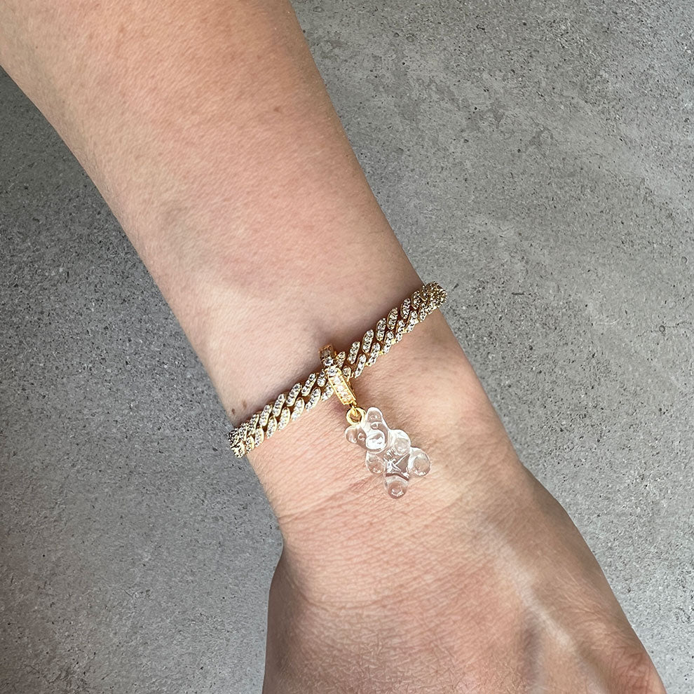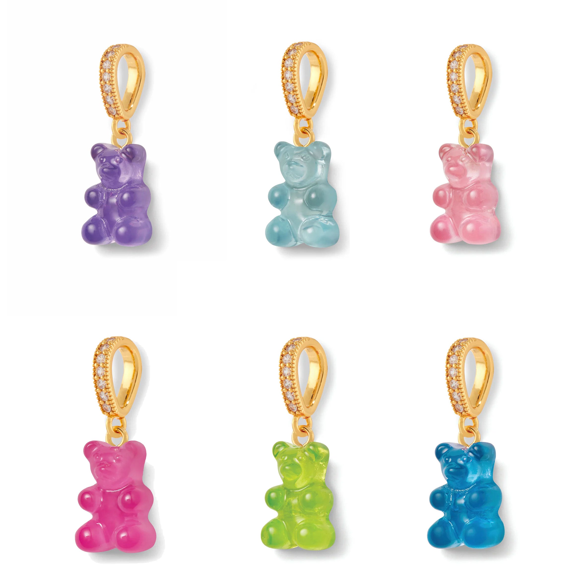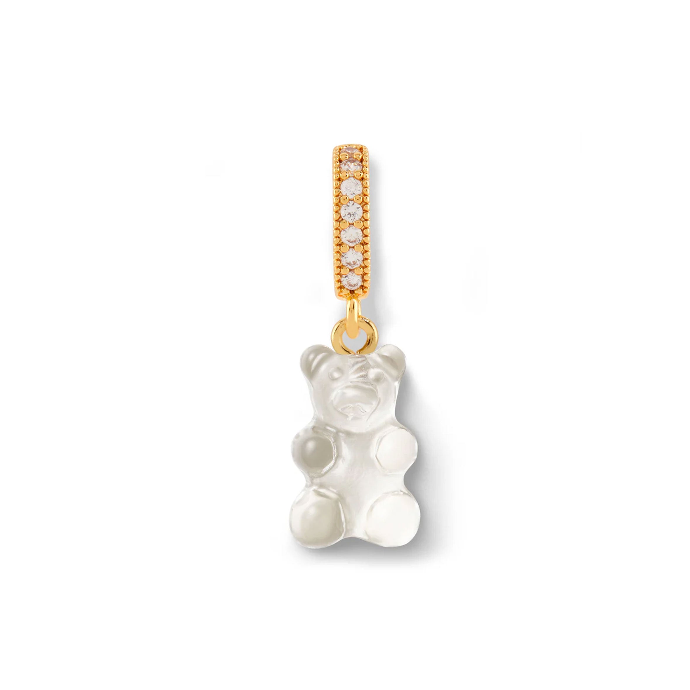 Signature Nostalgia bear in translucent glossy resin finish with gold plated pave connector.