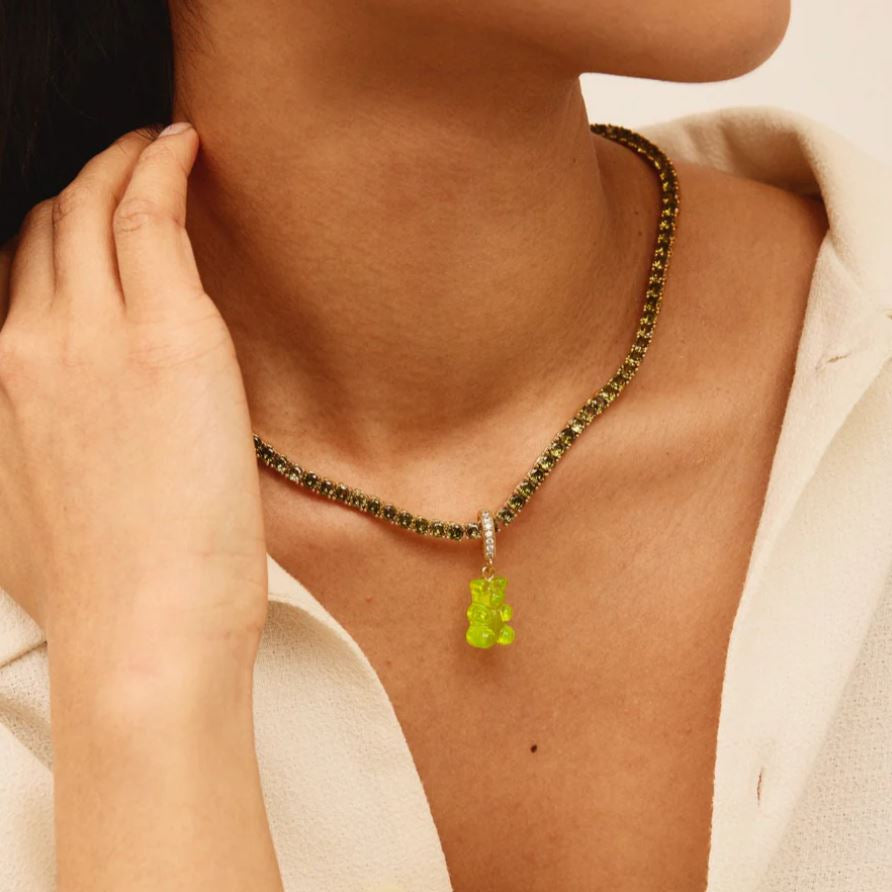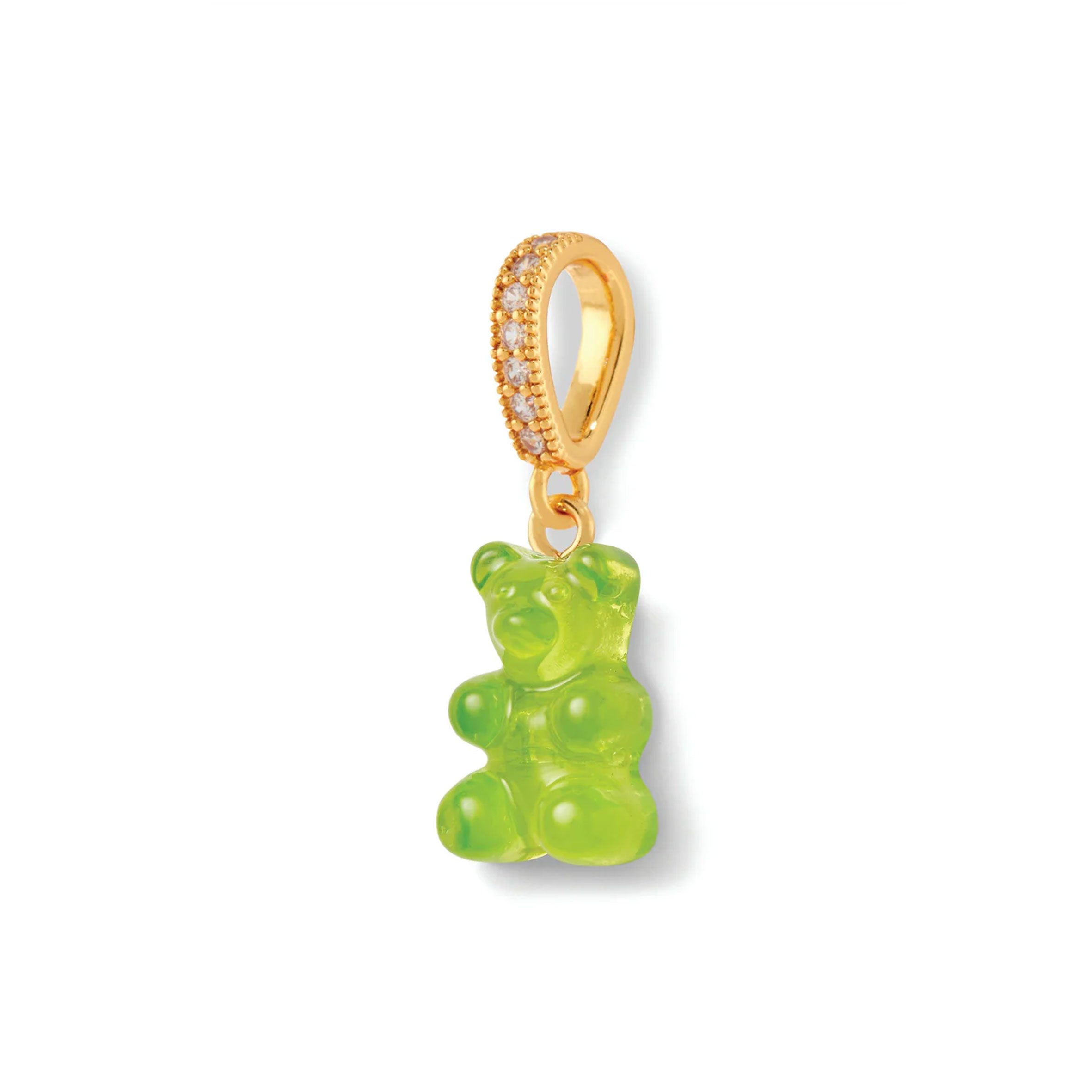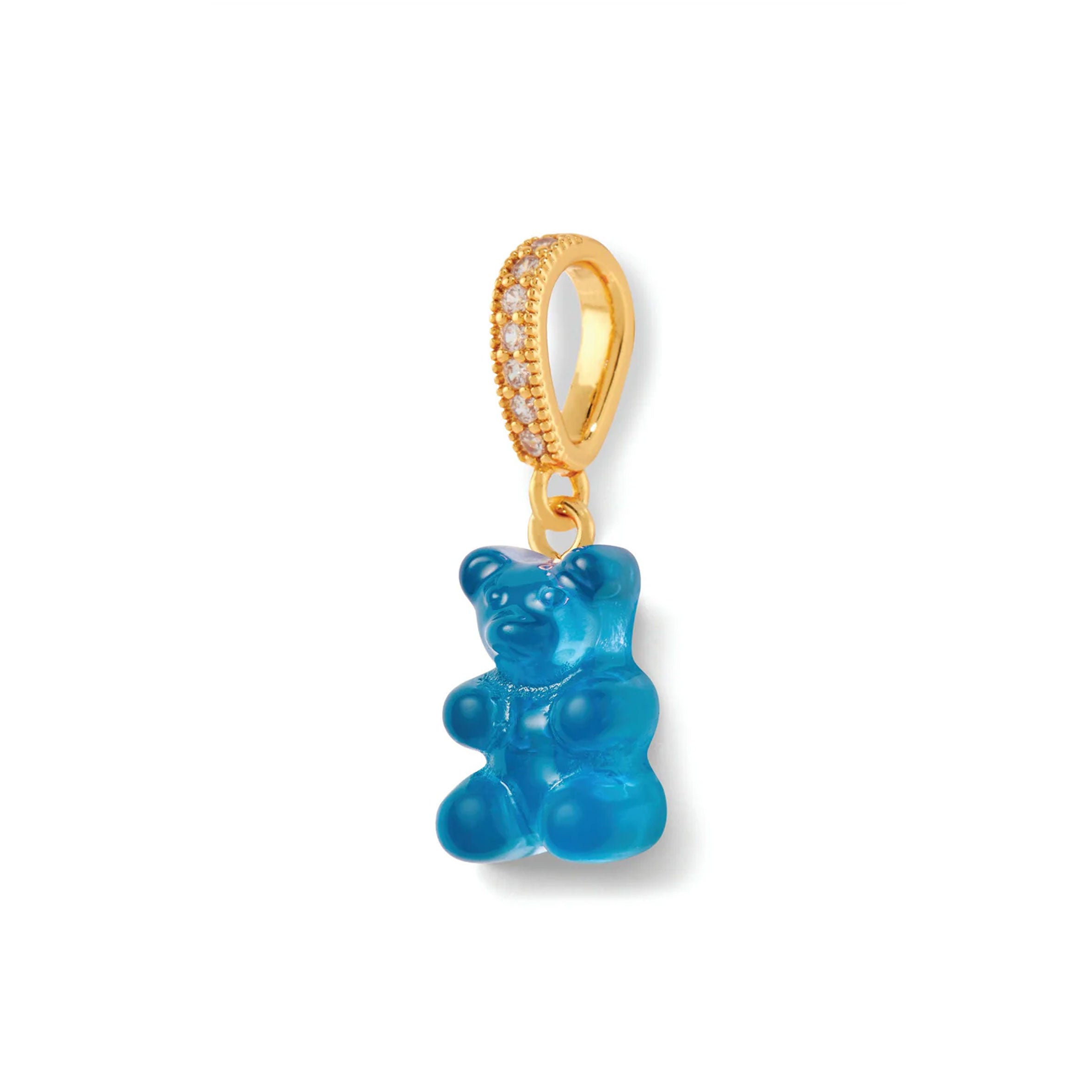 Signature Nostalgia bear in translucent glossy resin finish with gold plated pave connector.