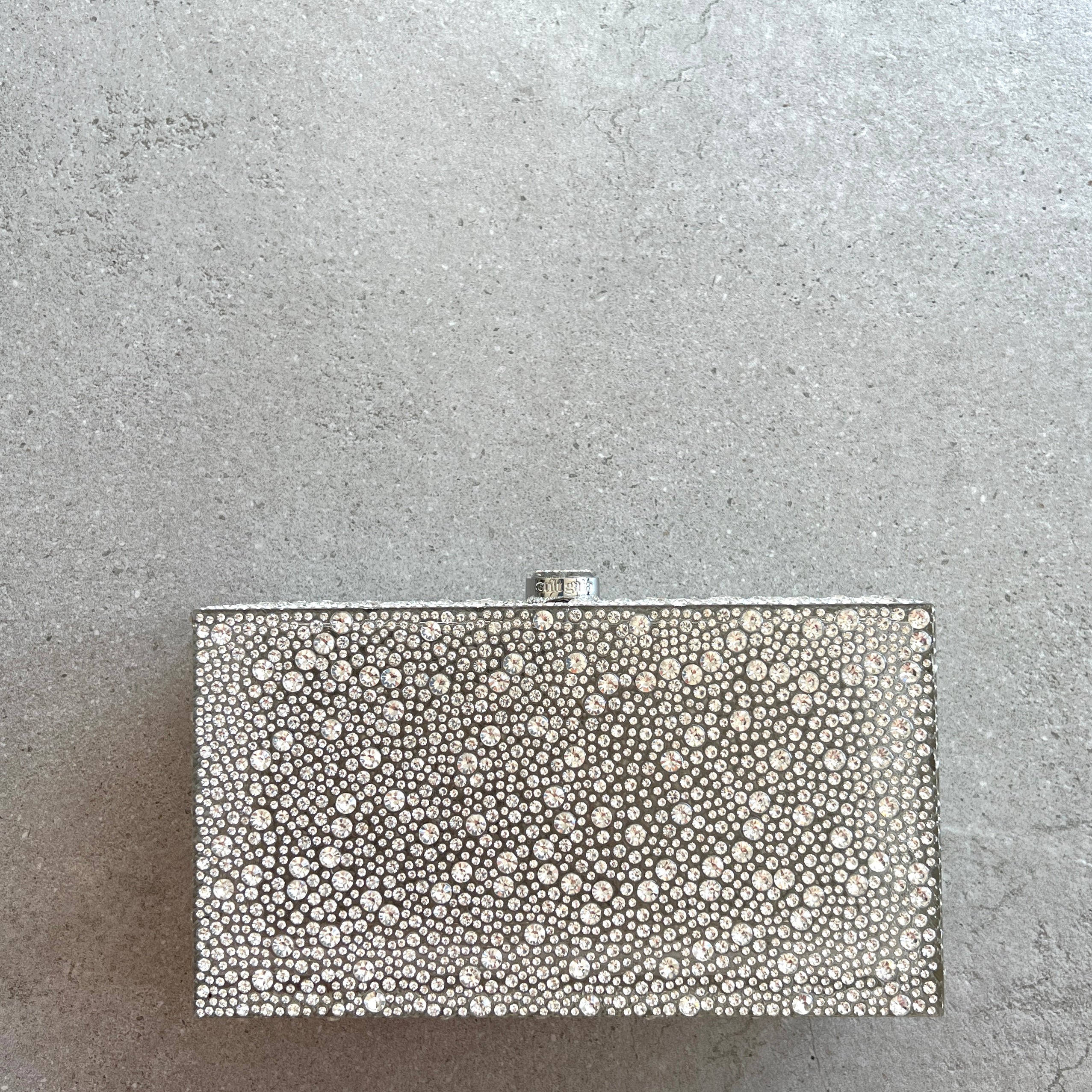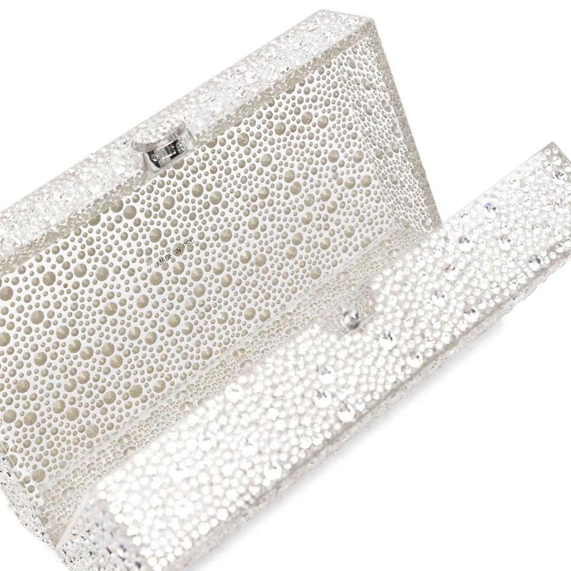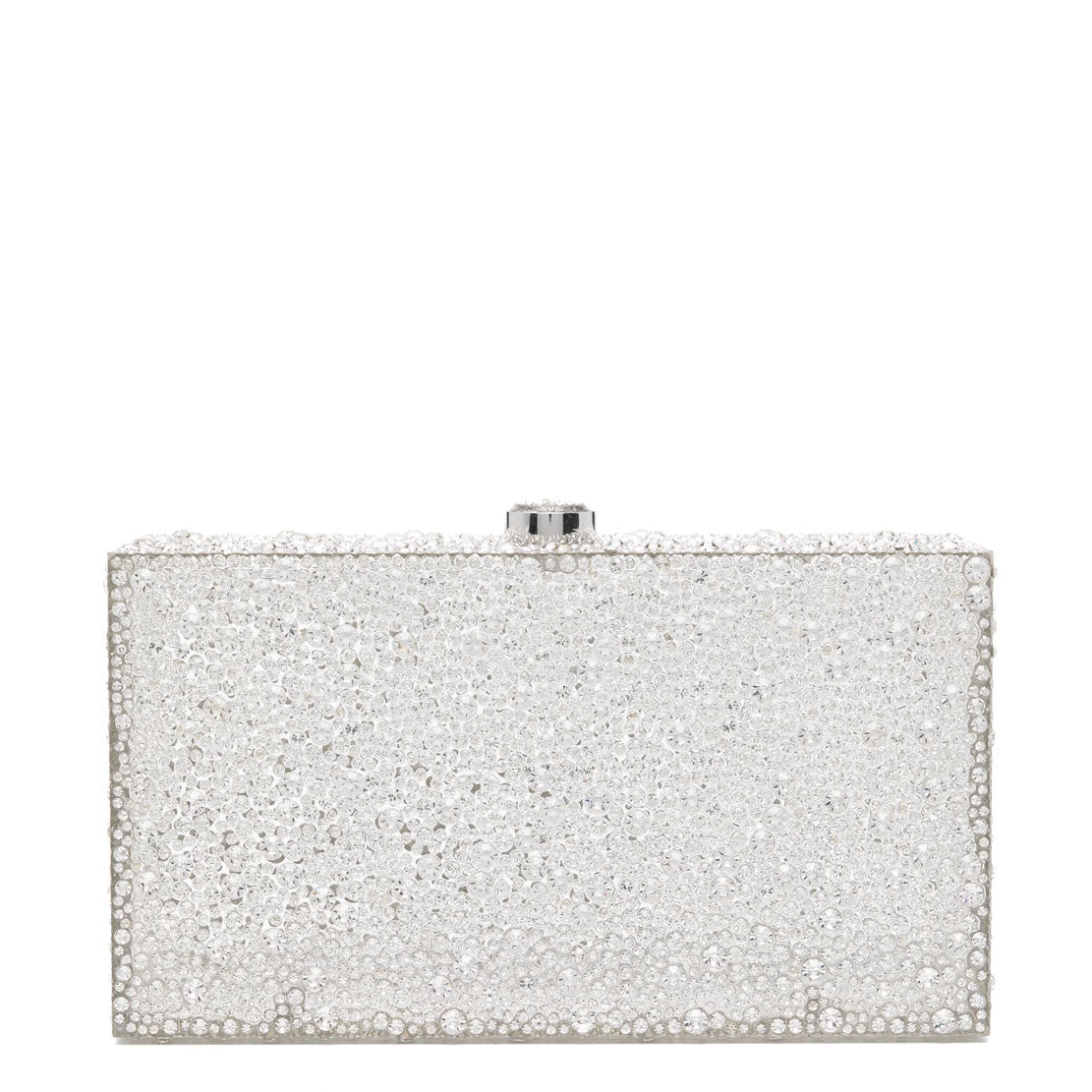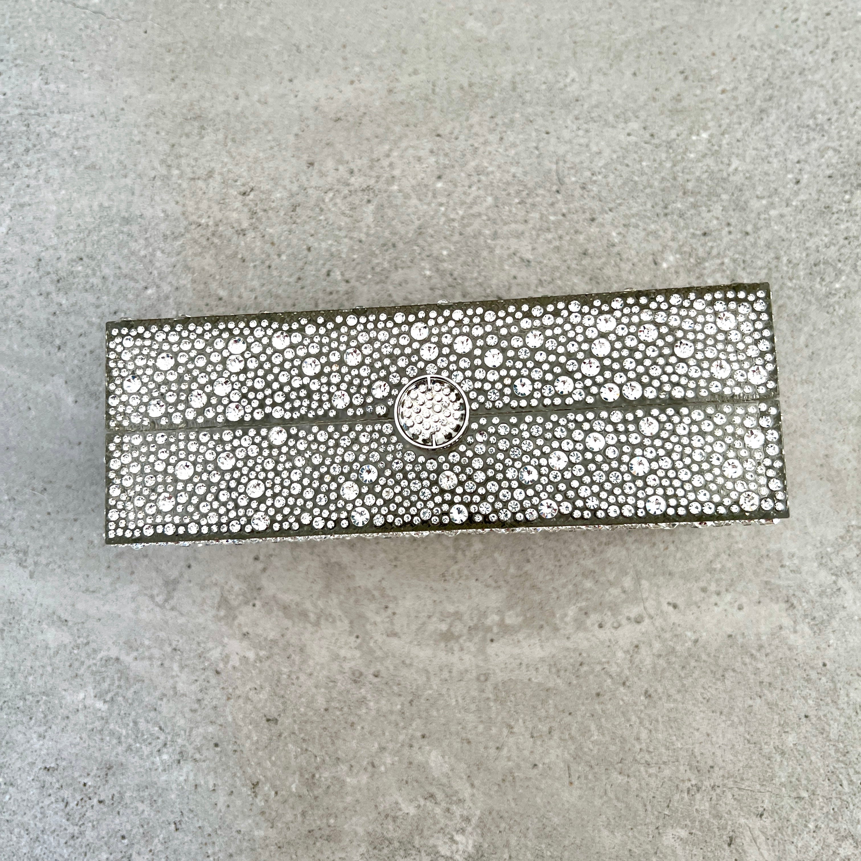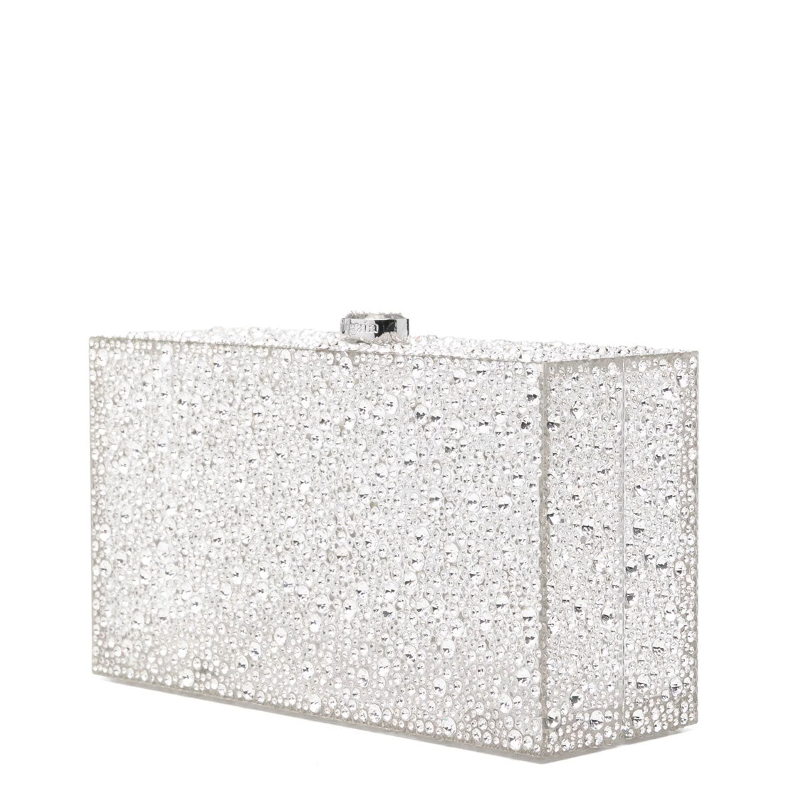 A rectangular crystal embelished acrylic clutch with a top closure.