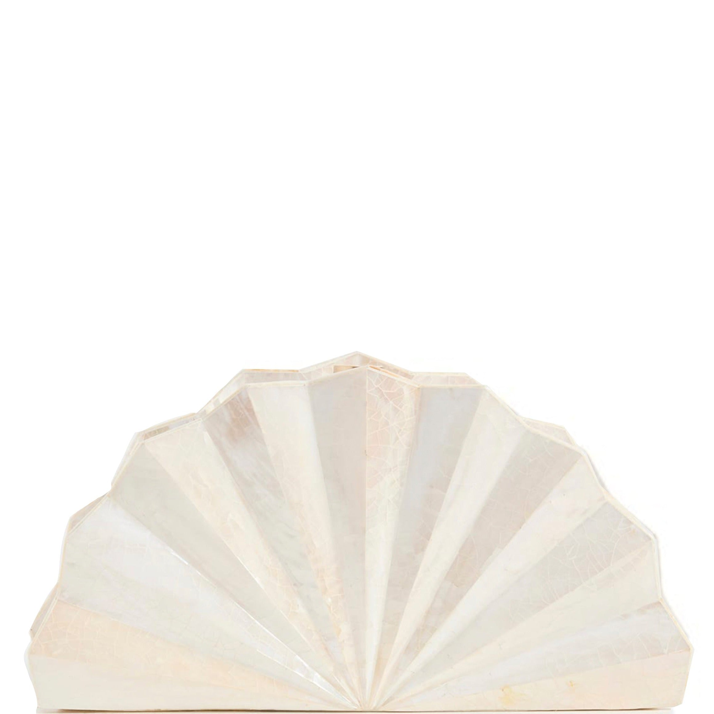 Crafted from authentic Mother of Pearl, the Esme Clutch has a beautiful shell-like fan silhouette. This sculptural piece is meant to make you look twice. It closes with our signature spring clasp and features our logo plaque inside the bag. Sized to fit the essentials, your phone and lip gloss.