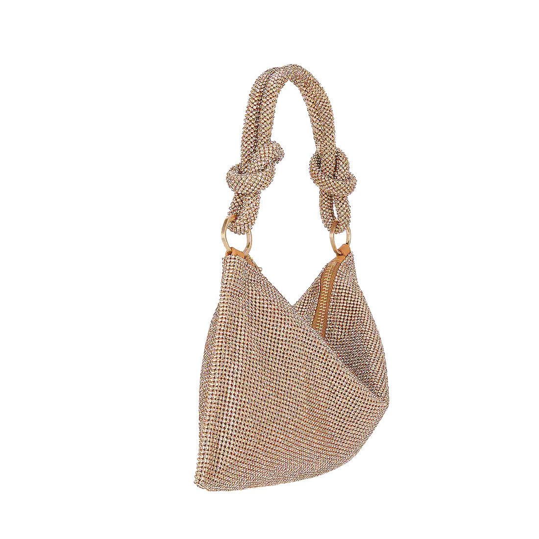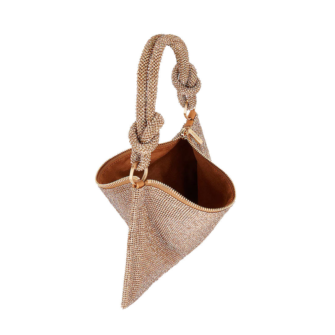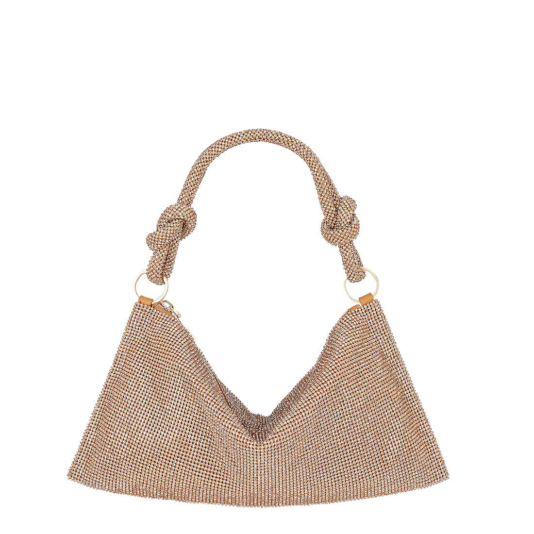 The Hera Shoulder, now available in an even smaller Nano. Crafted from eye-catching rhinestone that give a metallic silver shine, this classic design exudes femininity and grace with a knotted shoulder strap and a gorgeously slouchy silhouette. The frosted handheld bag is the perfect addition to add some Gaia sparkle to your life. Please note this size is much smaller than the Mini.