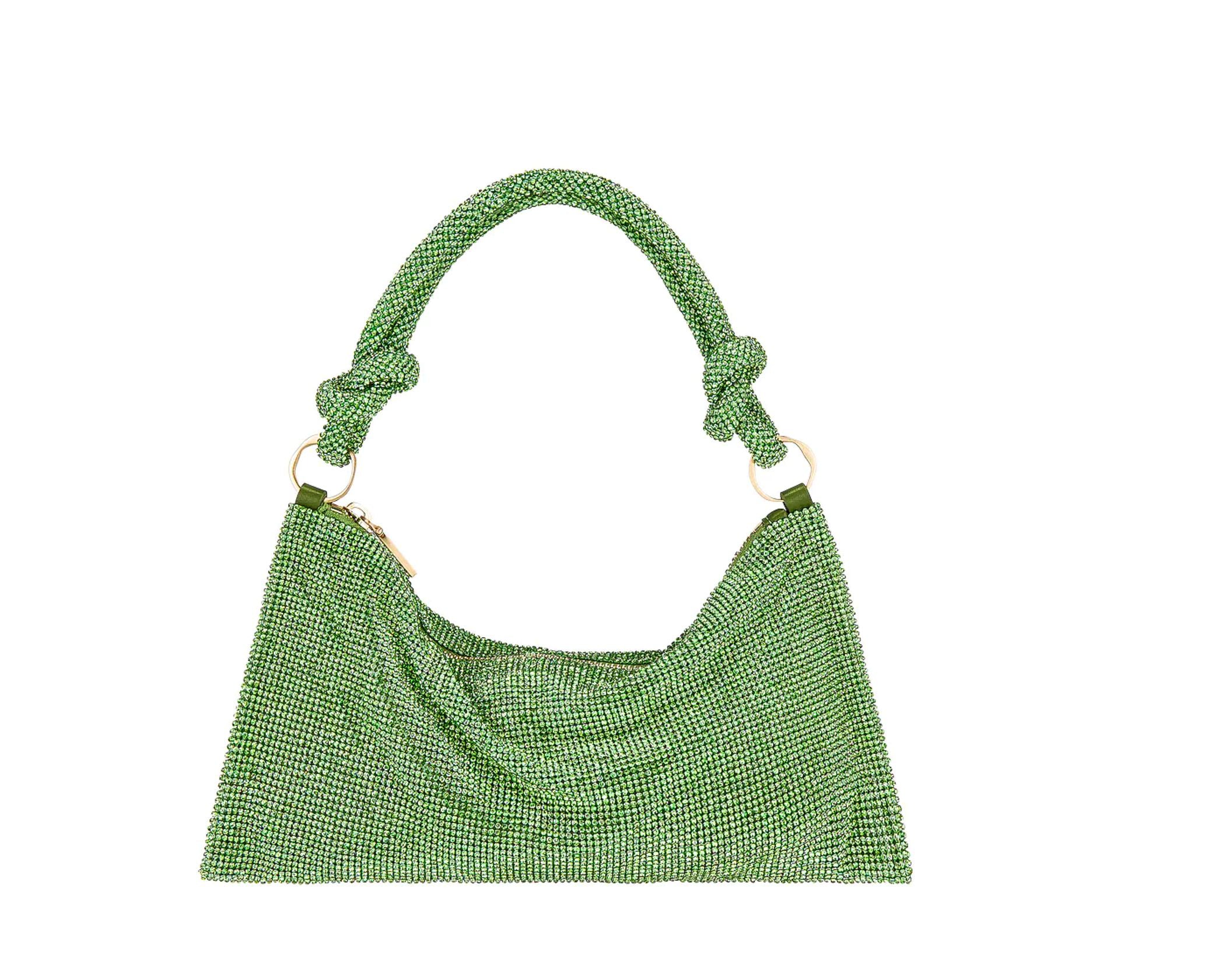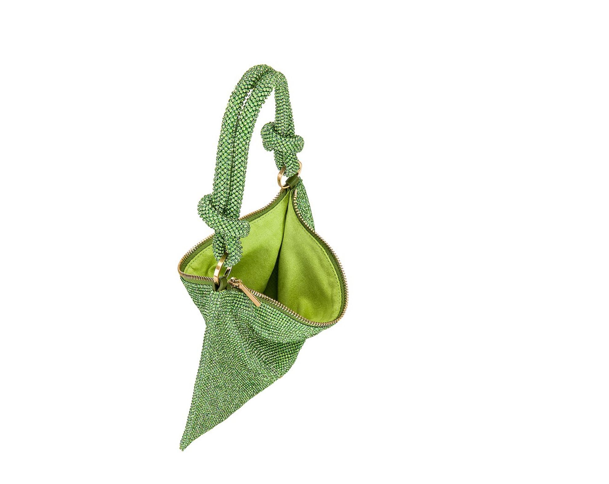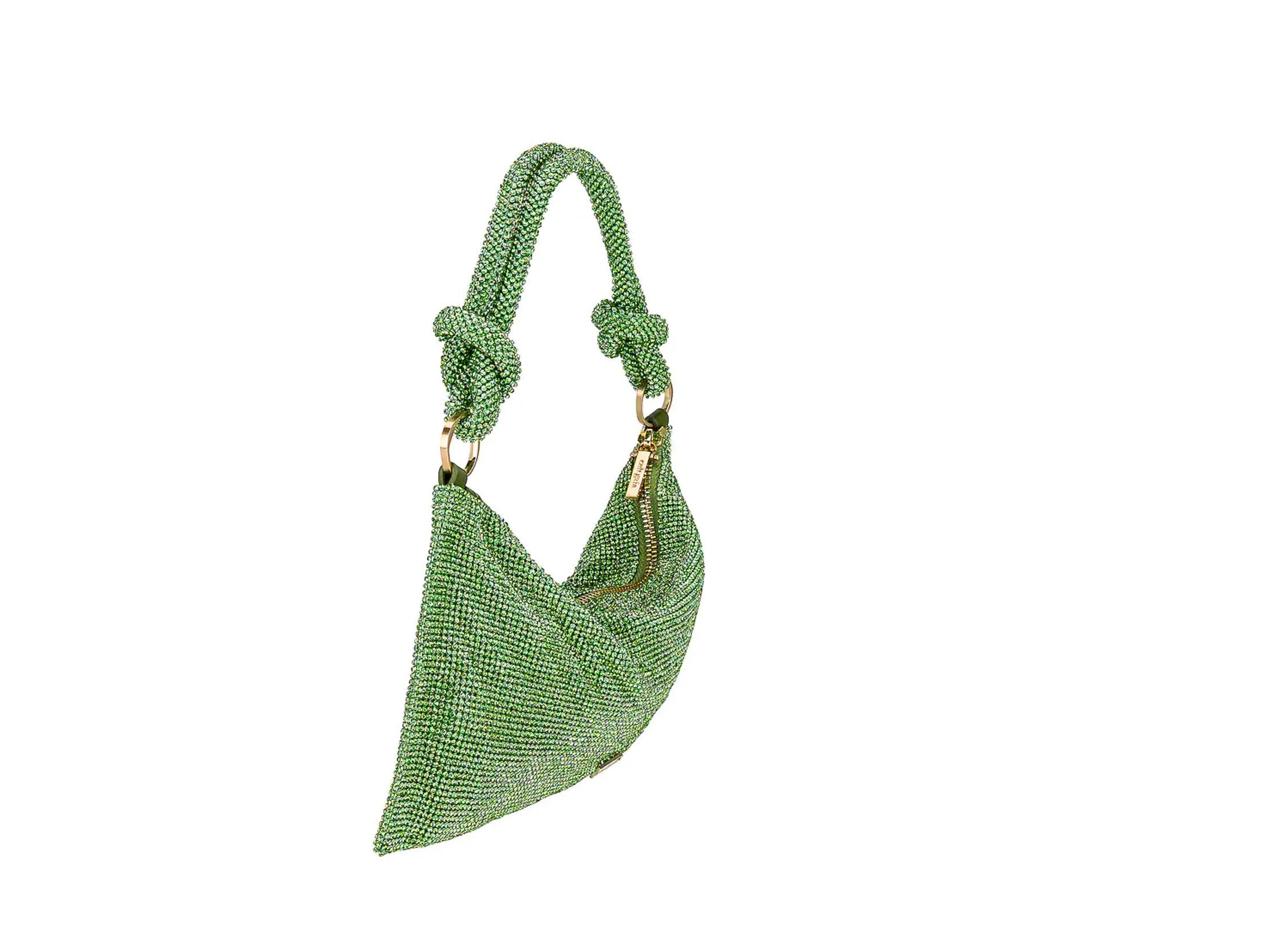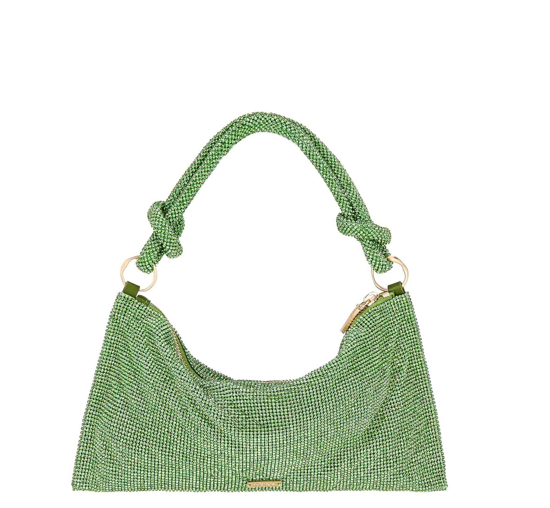 The Hera Shoulder, now available in an even smaller Nano. Crafted from eye-catching rhinestone that give a metallic silver shine, this classic design exudes femininity and grace with a knotted shoulder strap and a gorgeously slouchy silhouette. The frosted handheld bag is the perfect addition to add some Gaia sparkle to your life. Please note this size is much smaller than the Mini.